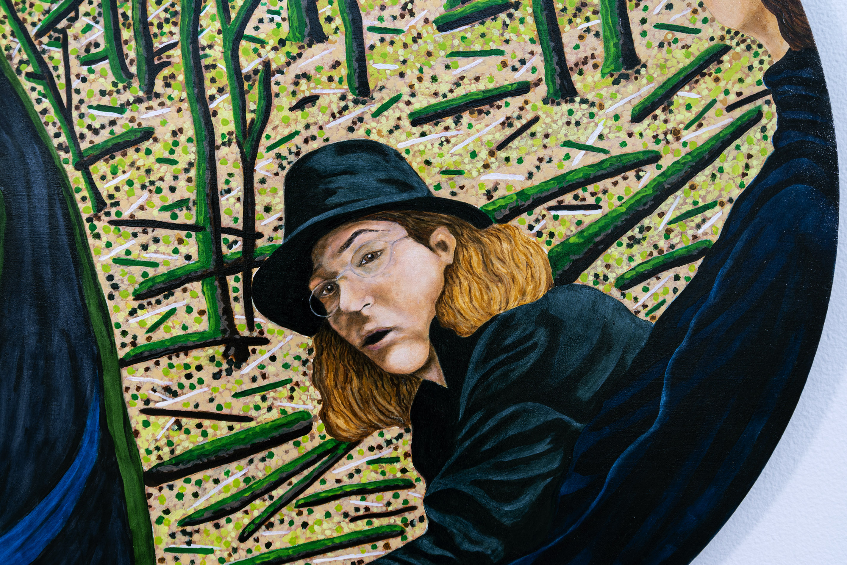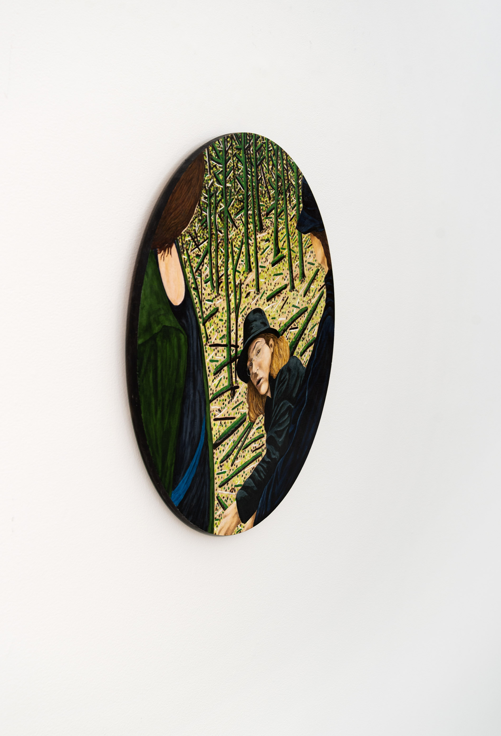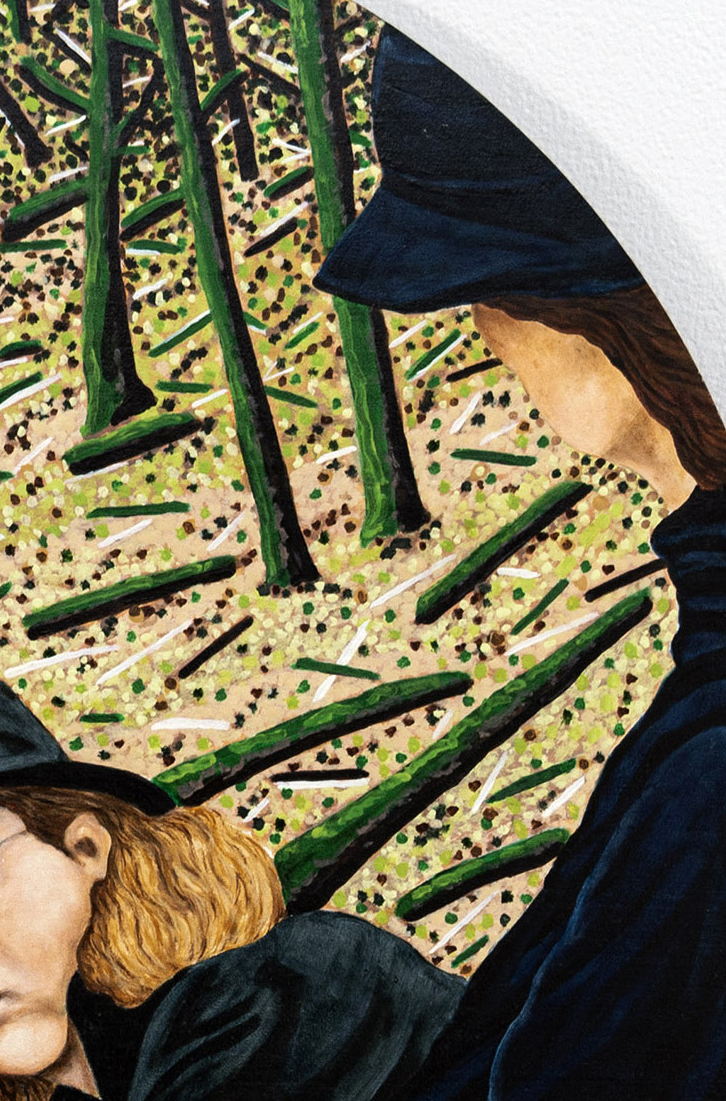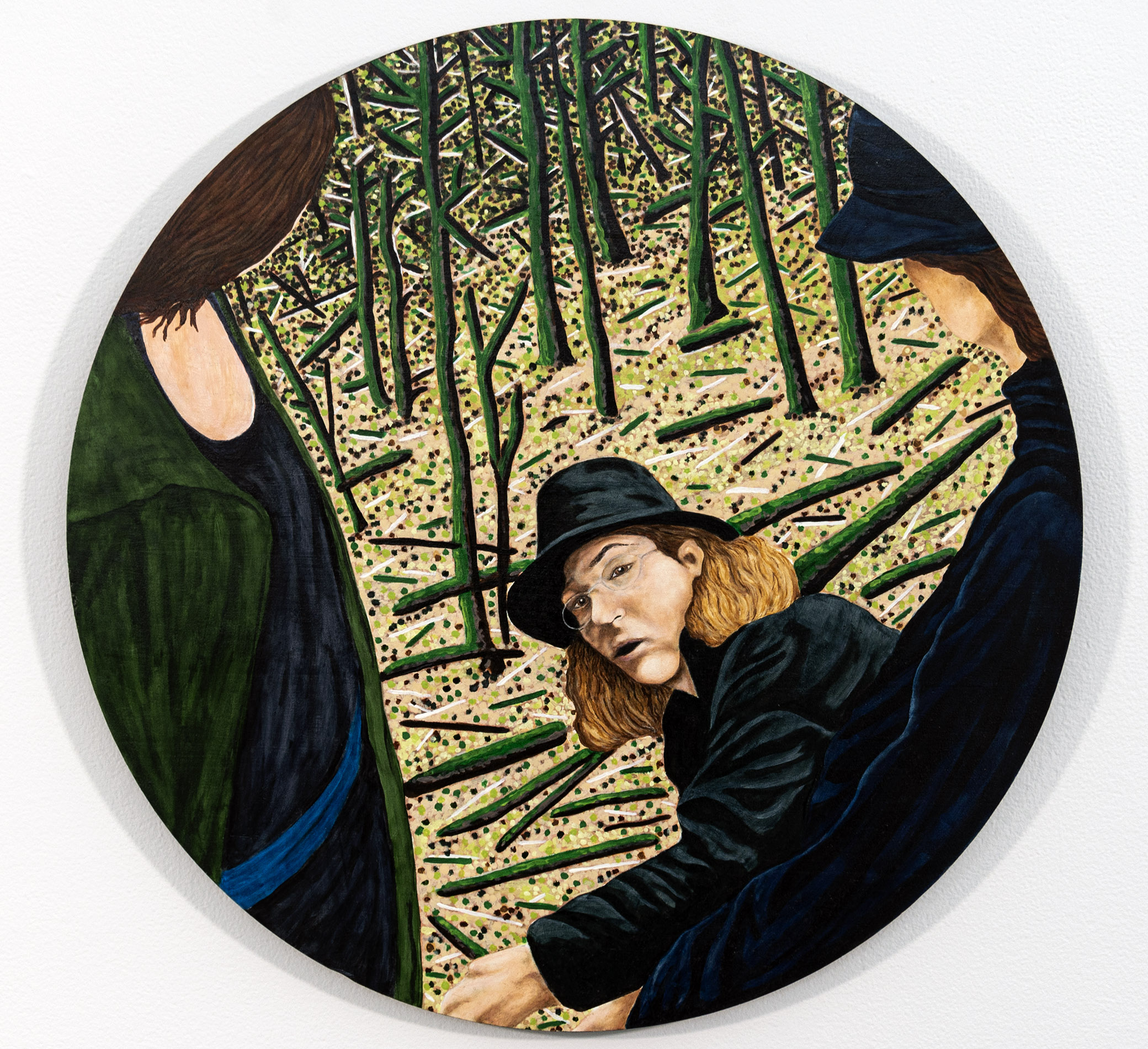 "The Quality of Mercy" depicts an outdoor excursion. Two women observe the central male figure, who looks back at them in surprise. The painting focuses on the man's expression, and his apparent anxiety at the possibly critical scrutiny of the two women at the image's sides, who remain partially outside the frame. The background is a stylized representation of a wooded area in the Pacific Northwest. My strategy of combining classical techniques, particularly with respect to the central image, with more stylized and contemporary elements, as in the background, is intended to underline the persistence of old tropes of gender and behaviour.