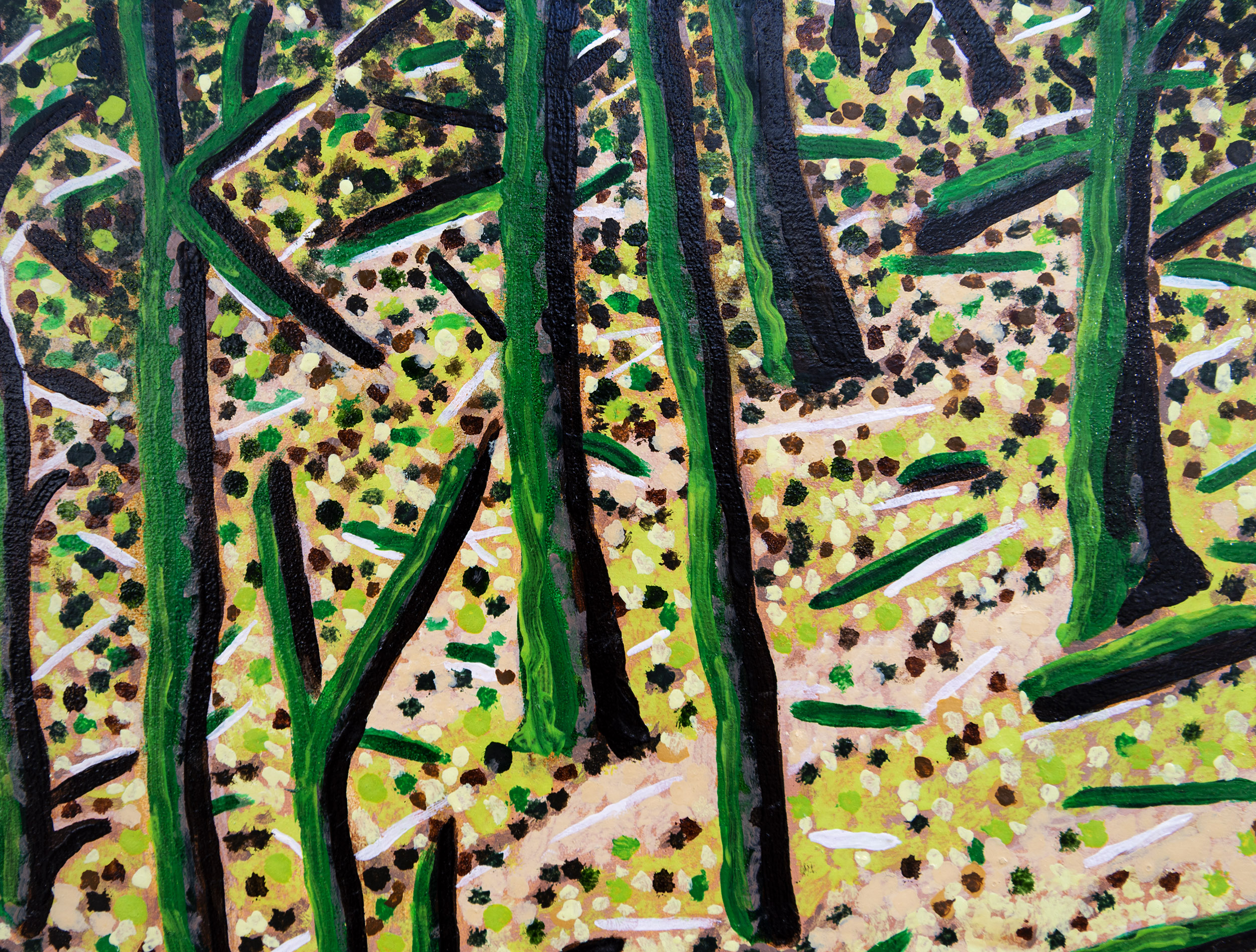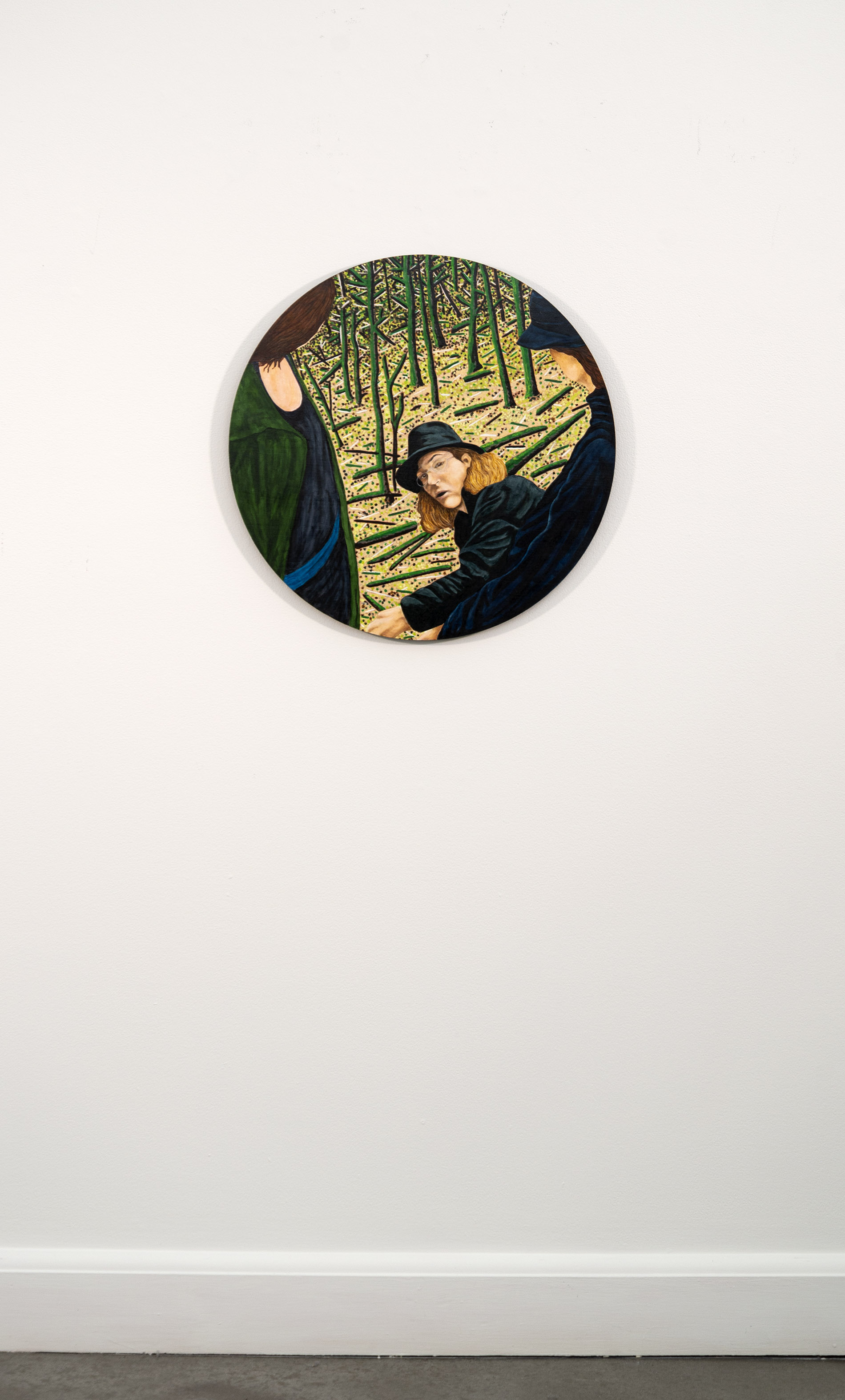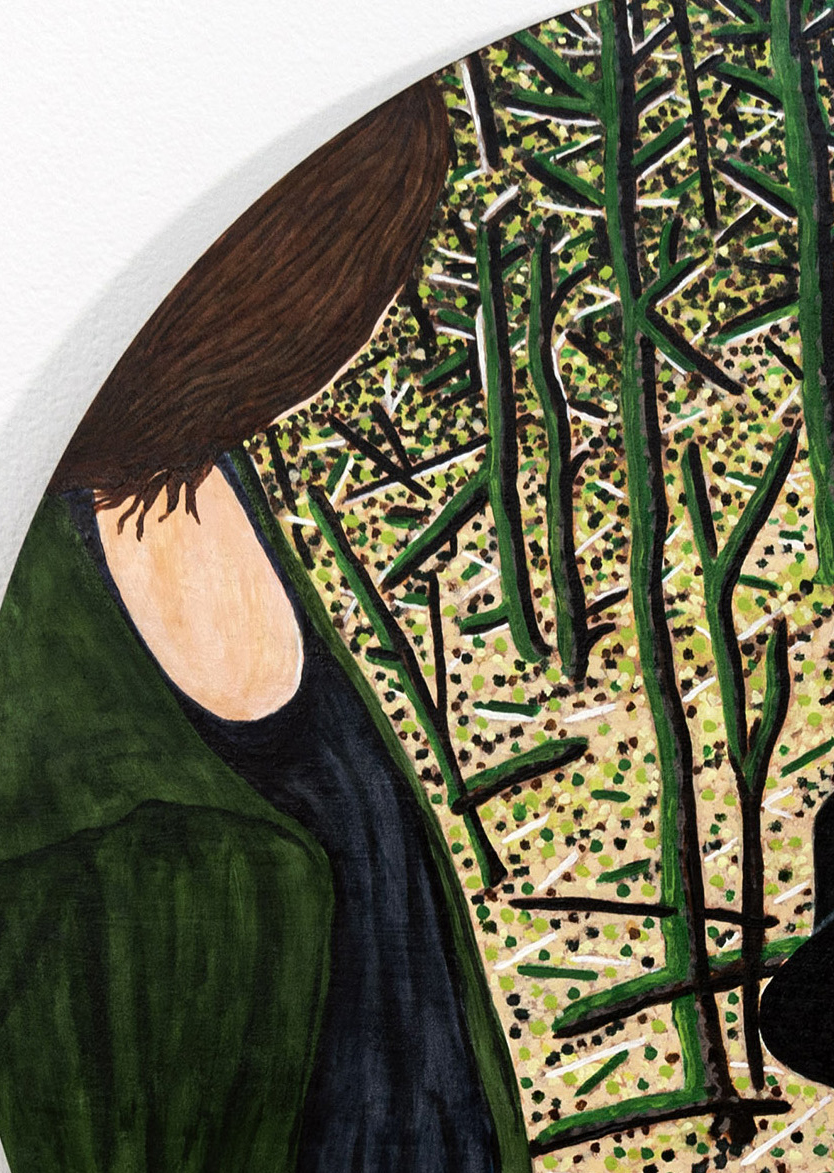 "The Quality of Mercy" depicts an outdoor excursion. Two women observe the central male figure, who looks back at them in surprise. The painting focuses on the man's expression, and his apparent anxiety at the possibly critical scrutiny of the two women at the image's sides, who remain partially outside the frame. The background is a stylized representation of a wooded area in the Pacific Northwest. My strategy of combining classical techniques, particularly with respect to the central image, with more stylized and contemporary elements, as in the background, is intended to underline the persistence of old tropes of gender and behaviour.