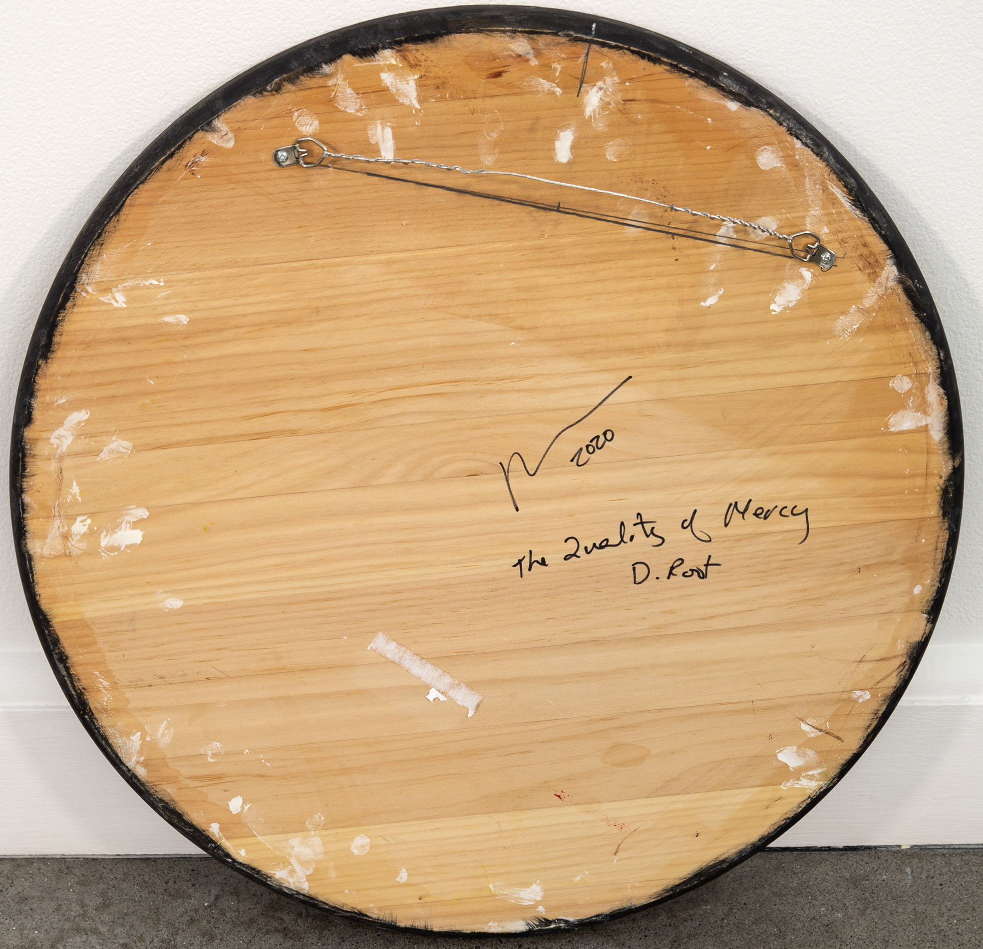 The tondo form may remind the viewer of archaic religious paintings, in which the central image of the saint is flanked by the objects and experiences representing their martyrdom. Here, what we are seeing is an insignificant social exchange, but one which takes on larger implications once it is fixed in a representation of the event.” Deborah Root