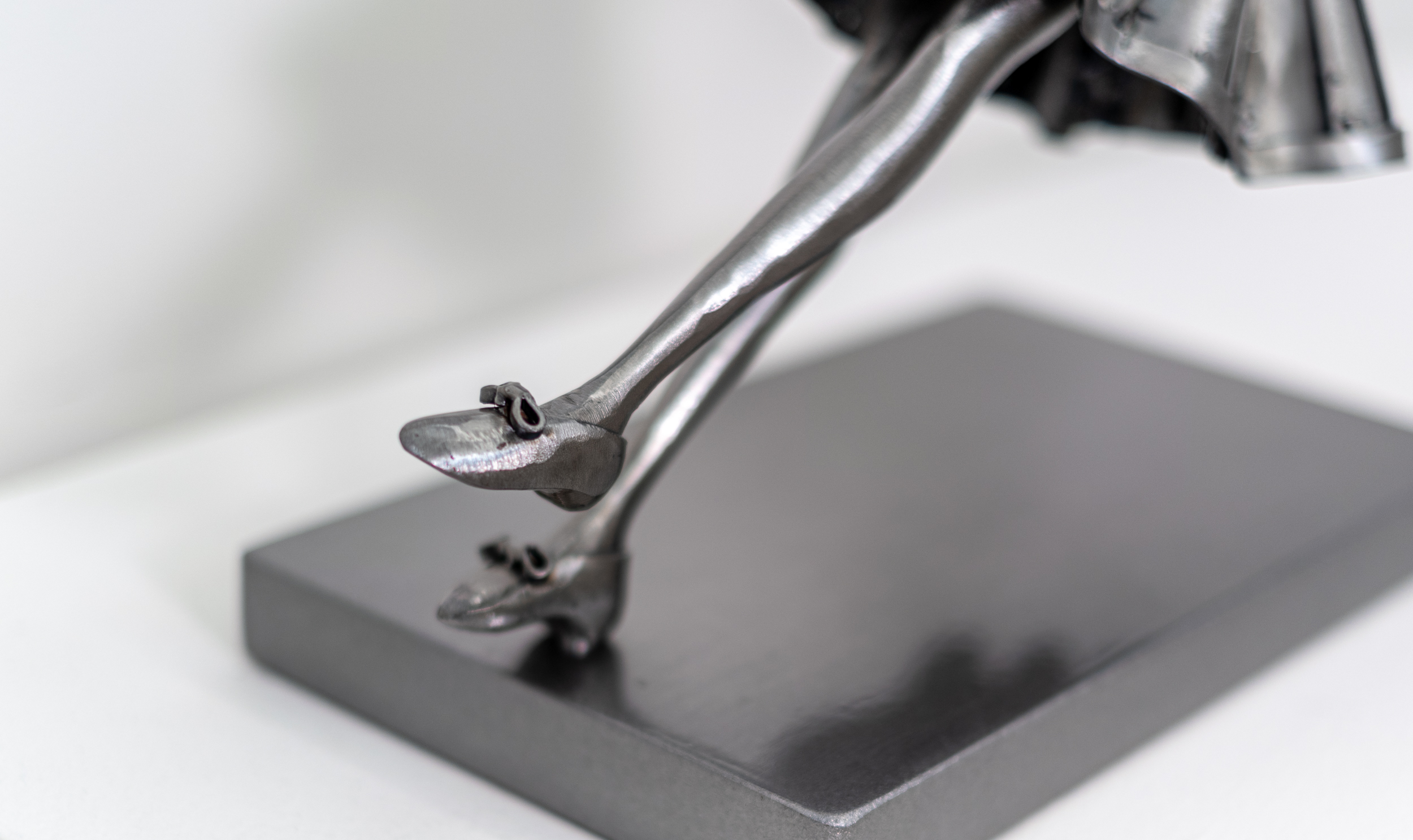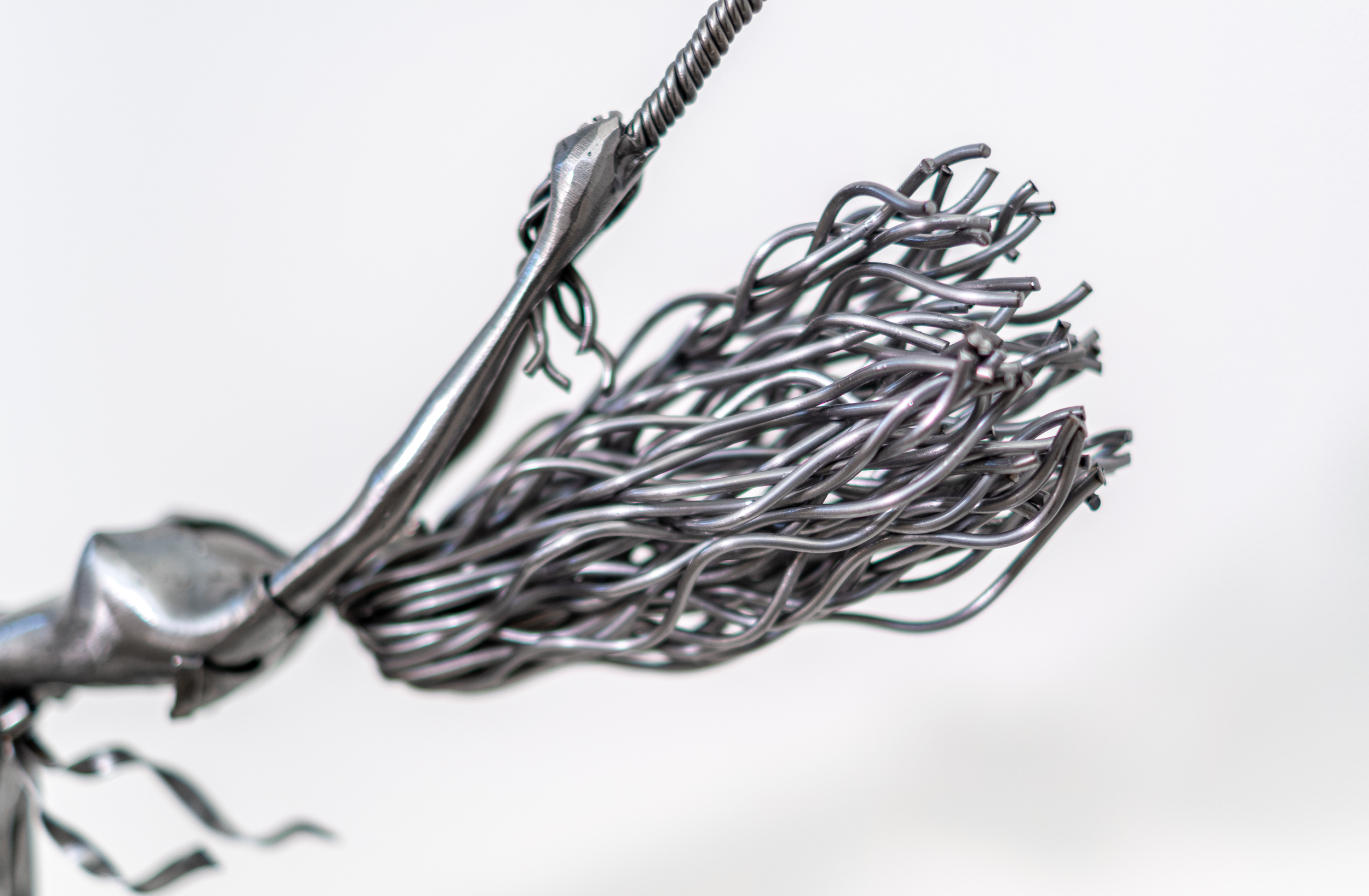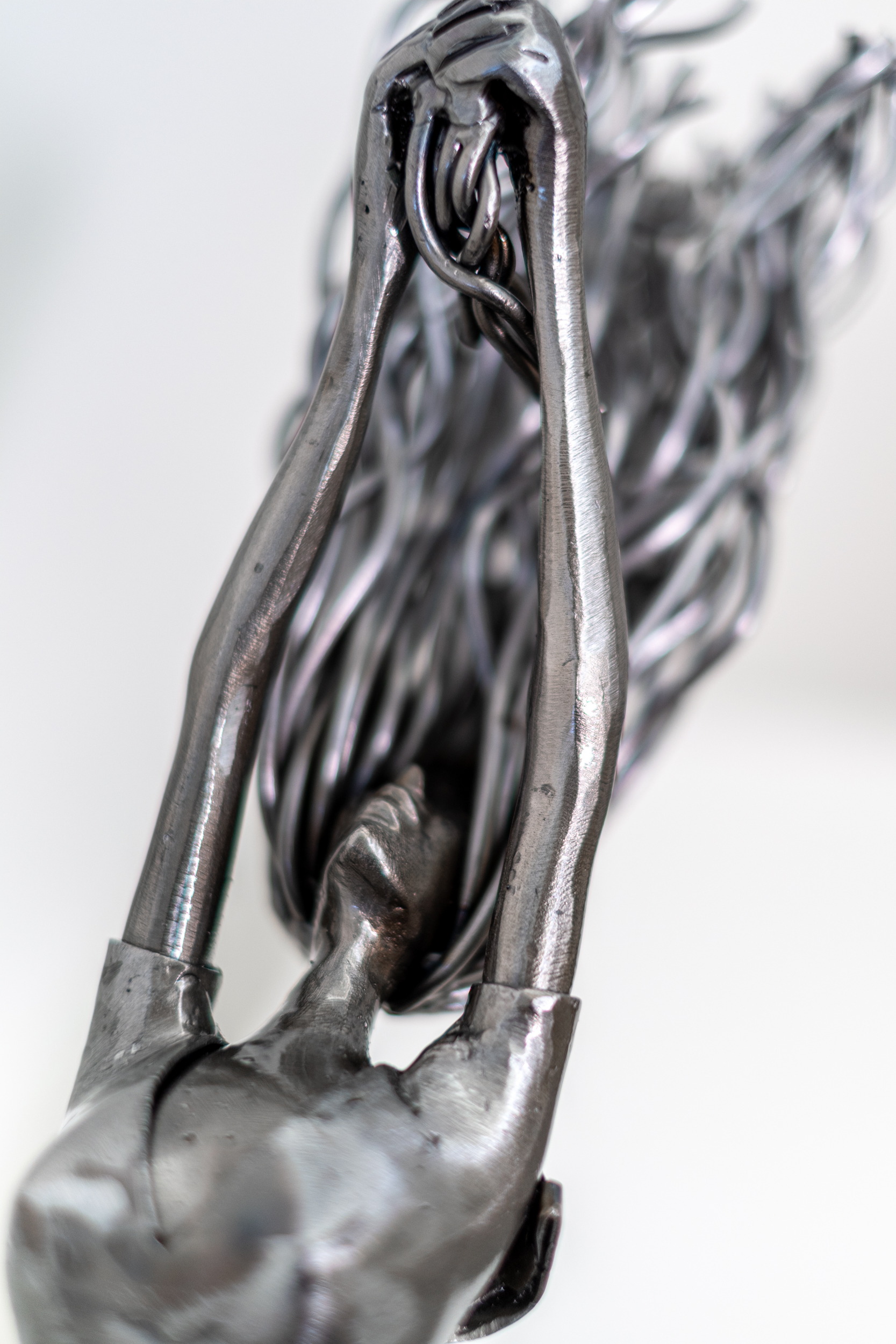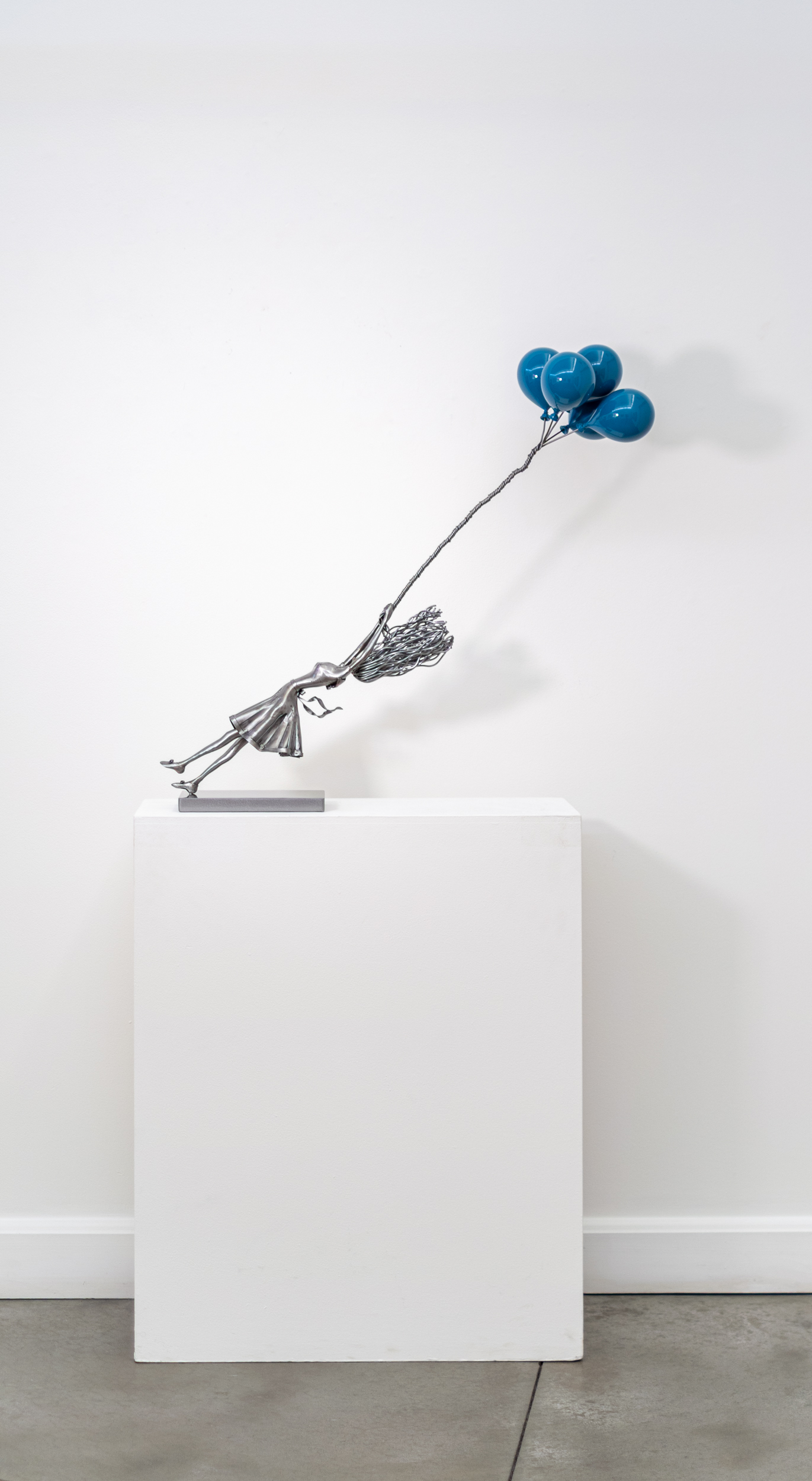 This contemporary figurative indoor sculpture of a female is hand forged from metal.The stunning hand-hammered steel sculptures of Toronto-based multi-disciplinary artist Derya Ozparlak have been exhibited in collections in Canada and abroad. Ozparlak’s impressive oeuvre includes sculpture, animation, installation and both puppet and set design. This is one of an ongoing series of hand-hammered steel sculptures that explore universal themes of identity, culture and societal norms. In this piece, a female figure in a dress and heels, long hair flying behind her, appears to be ‘carried away’ by the bouquet of blue coloured fibreglass balloons she is holding onto. For the Canadian sculptor, balloons symbolize freedom and the idea of escaping conformity for a new, more inspired life.