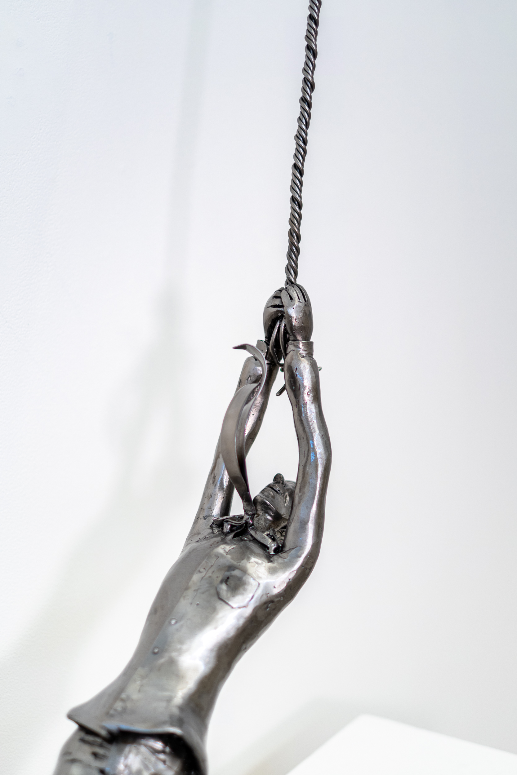 This figurative indoor sculpture of a male is hand forged in steel.The uniquely beautiful sculptural work of multidisciplinary artist Derya Ozparlak has been exhibited in collections in Canada and abroad. Ozparlak’s impressive oeuvre includes sculpture, animation, installation and both puppet and set design. This is one of an ongoing series of hand-hammered steel sculptures that explore universal themes of identity, culture and societal norms.