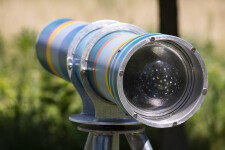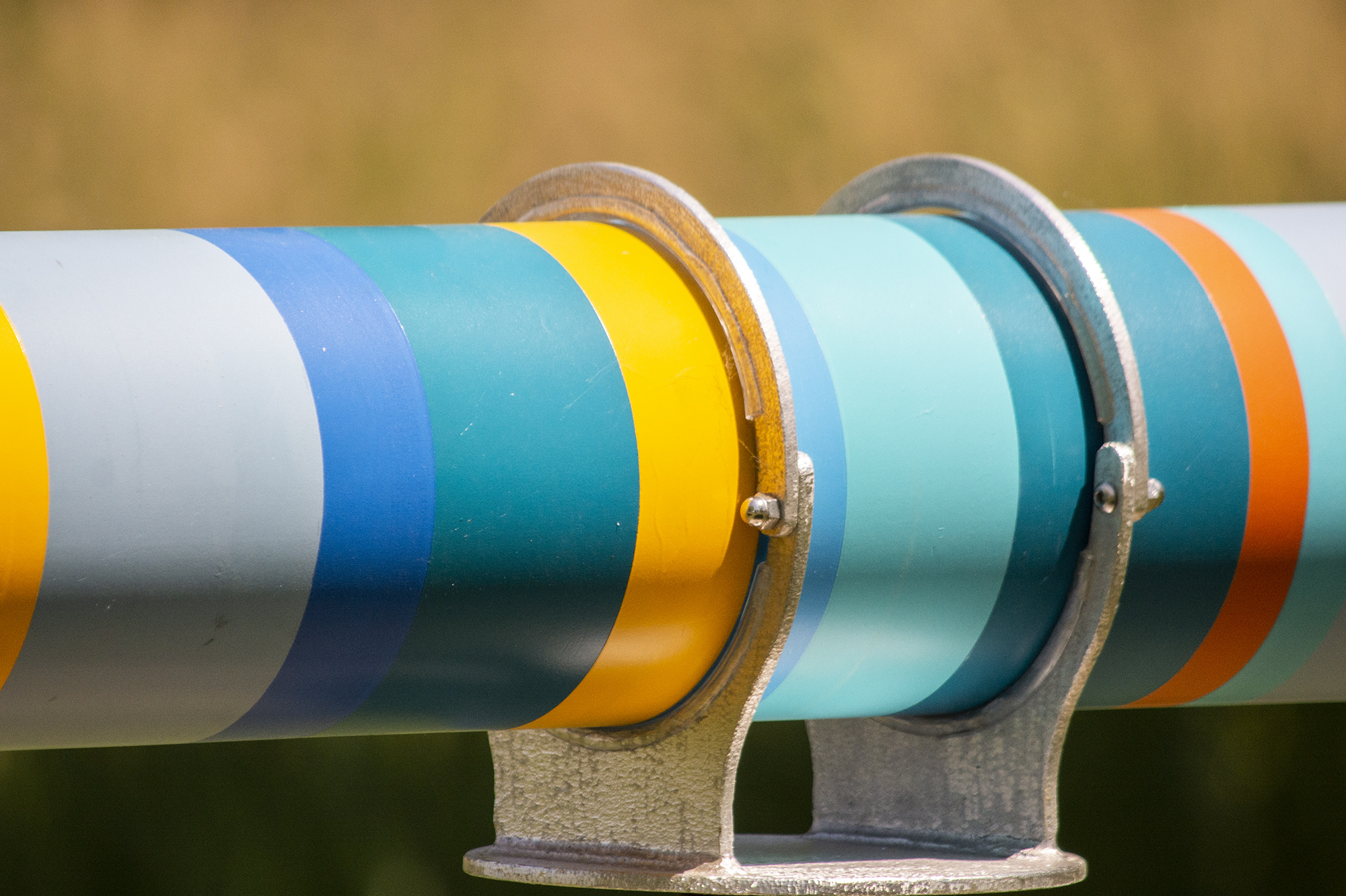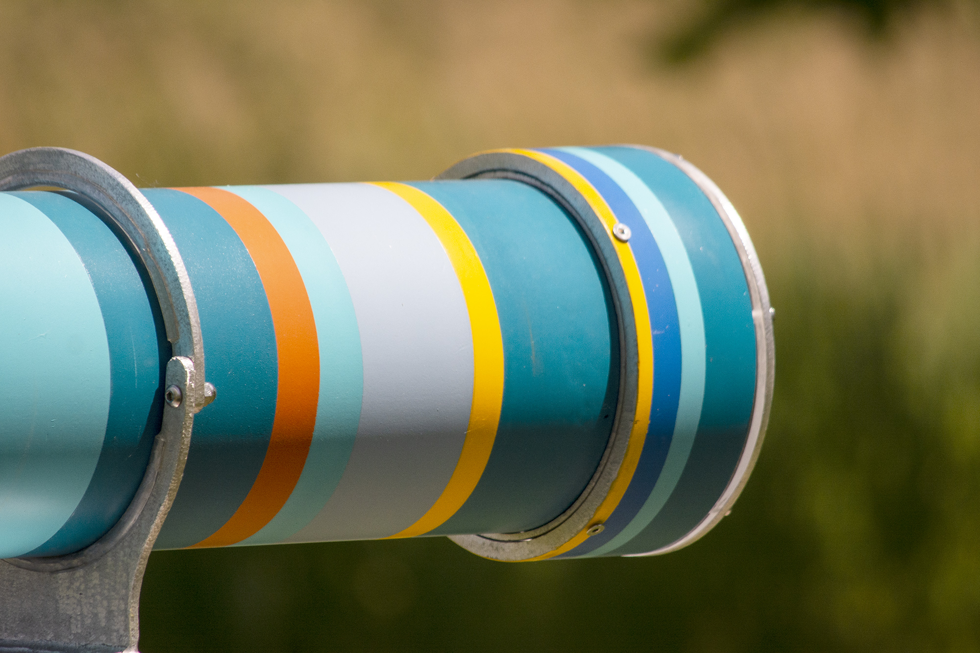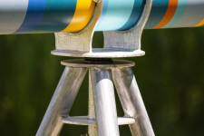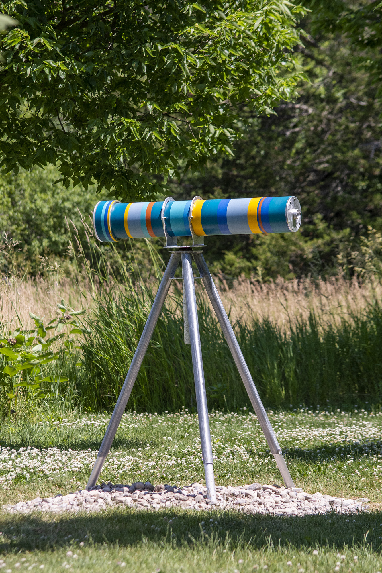 The distinctively unique, joyful and playful sculptural work of Éric Tardif is designed to invite the viewer to actively participate with his art. This mixed media piece is shaped like a telescope and sits on an aluminum tripod stand. The cylindrical body of the work is ringed in bright colours—blues, yellow, and orange. A ‘teleidoscope’ is a form of kaleidoscope with a lens and an open view that creates beautiful kaleidoscopic patterns from outside objects seen by the viewer. Imagine looking at a garden filled with flowers!