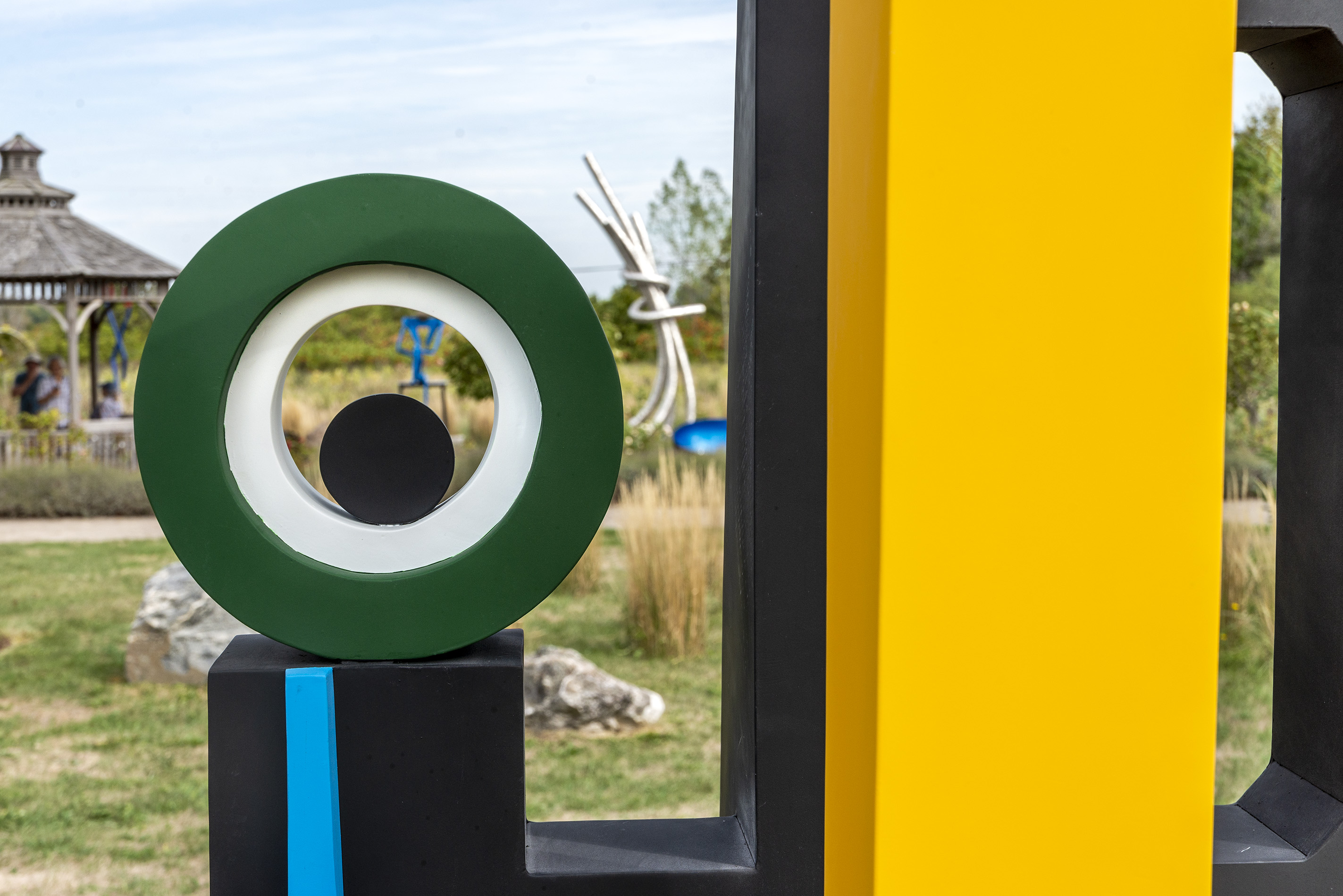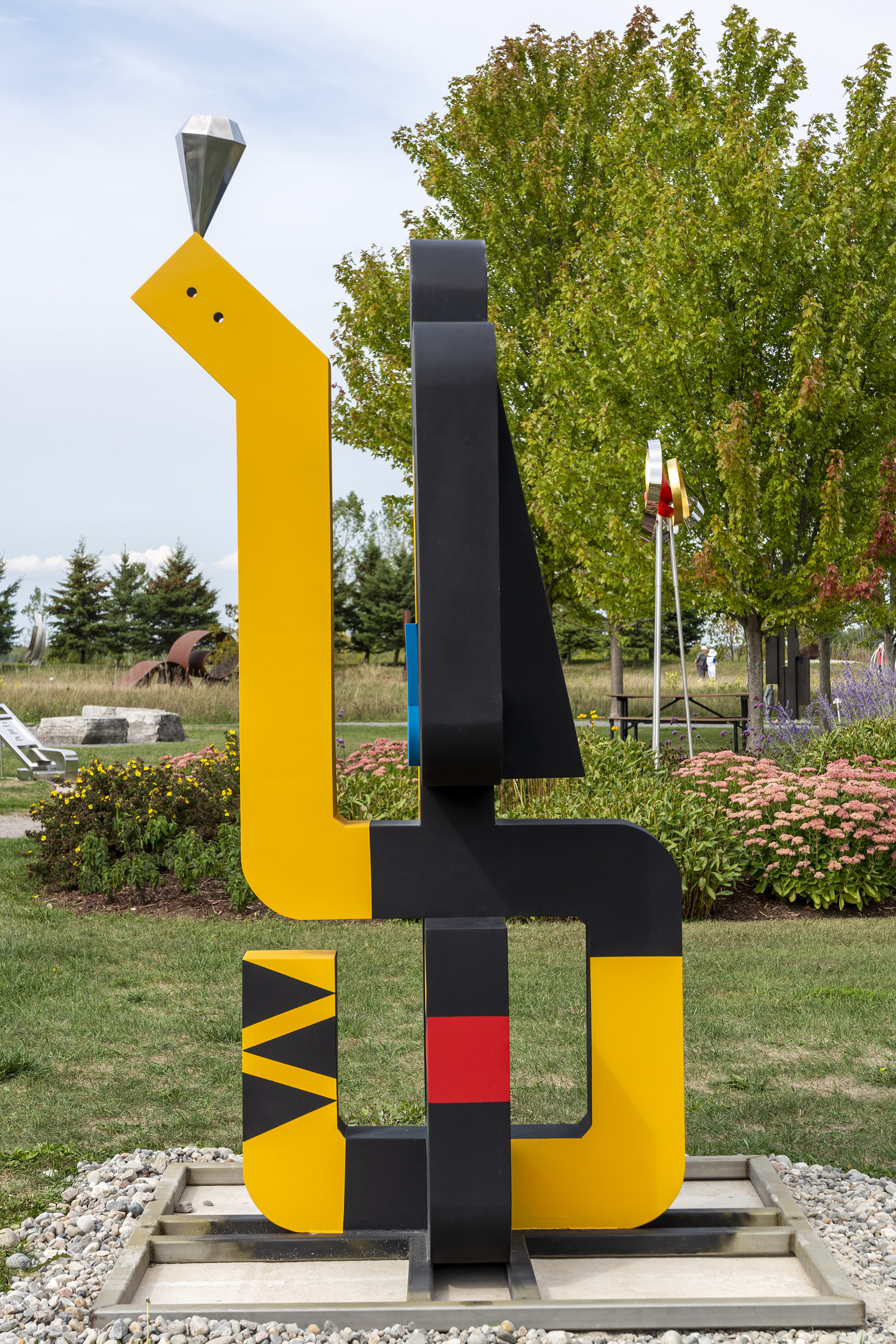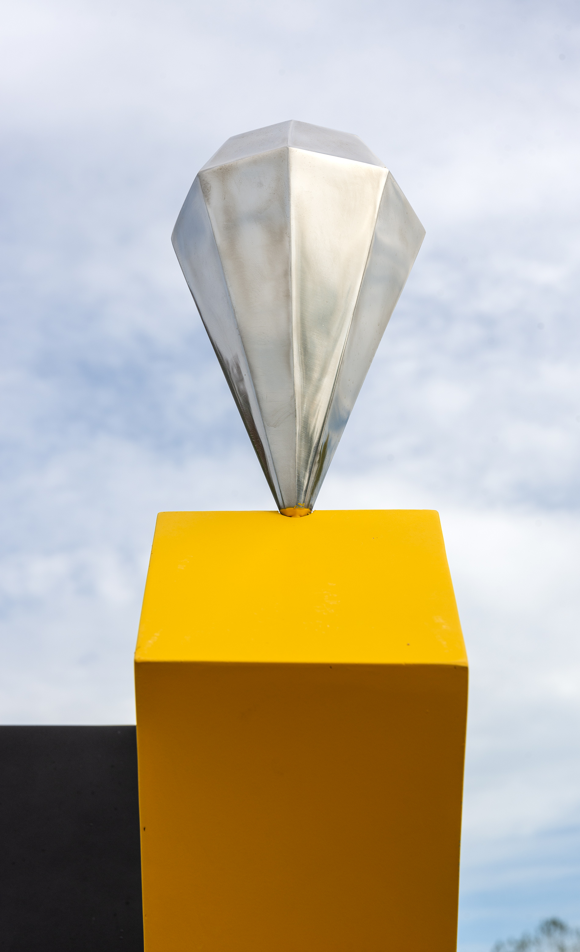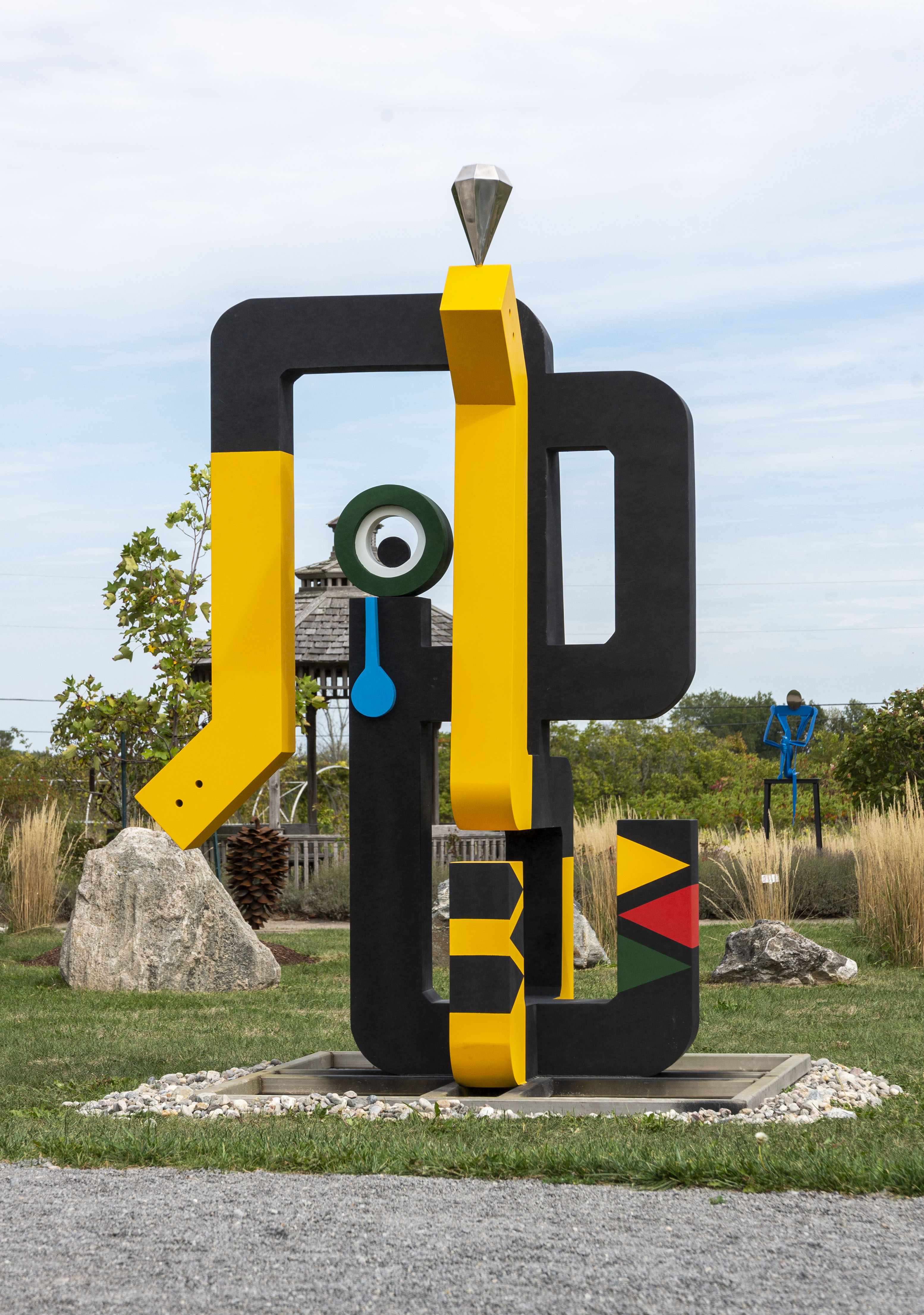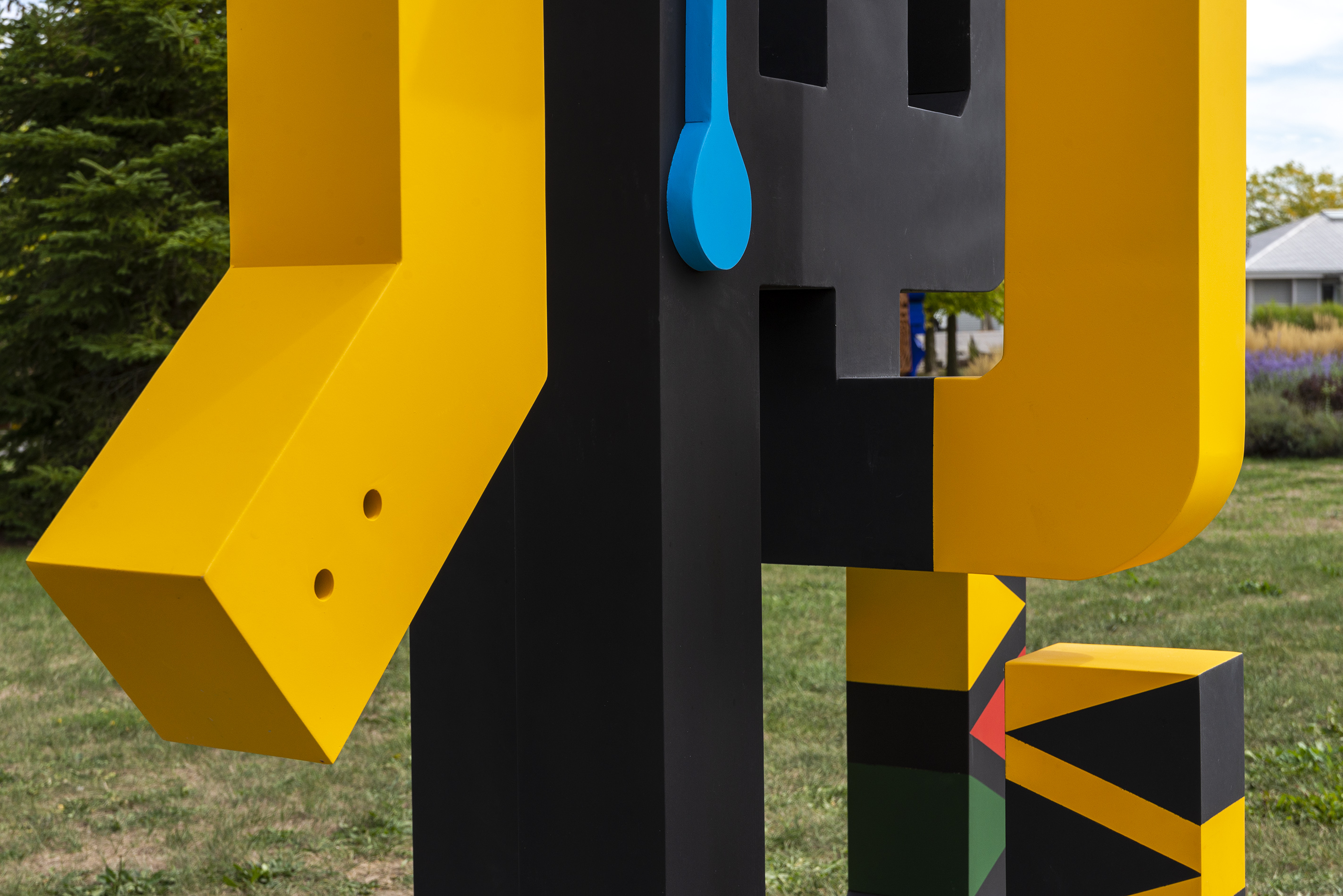 This contemporary abstract outdoor painted steel sculpture is figurative.Ferhat Özgür Görel’s bold and graphic “Mother Continent” is a powerful homage to the oldest inhabited continent in the world—Africa, where humans have lived for more than 5 million years. This hand-forged steel sculpture is designed as a whole to personify a human silhouette. But the details—in form and colour tell a more complex story. The largest geometric shapes intersect at angles to one another. Viewed separately, they are meant to depict two of Africa’s iconic animals—the elephant and the camel. Curated markings in red, blue, orange and green are the colours found in many flags of African countries and symbolize the rich cultural heritage. A small green circle with a black disk inside is the figure’s eye. The one blue teardrop falling below it suggests the historical pain of the African people. A shiny silver diamond-shaped object balances on the top of the sculpture and stands for Africa’s natural riches—the ‘underground wealth’ that has been taken from the continent.