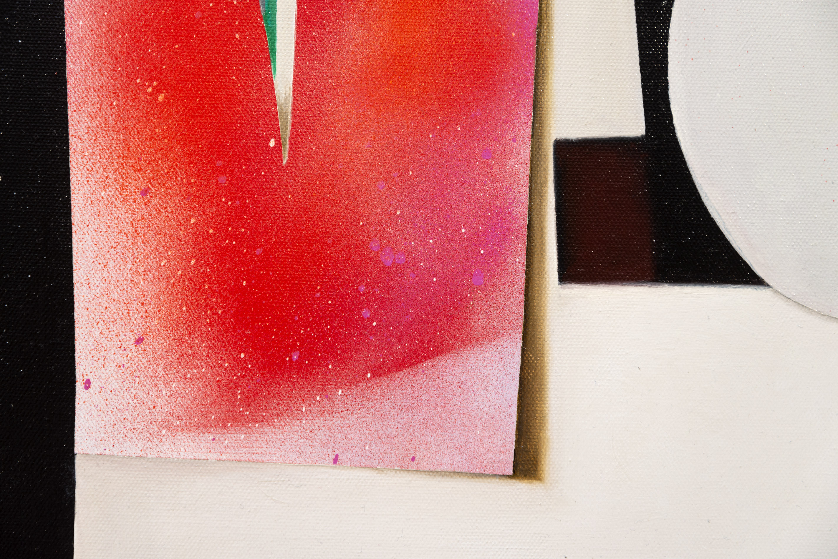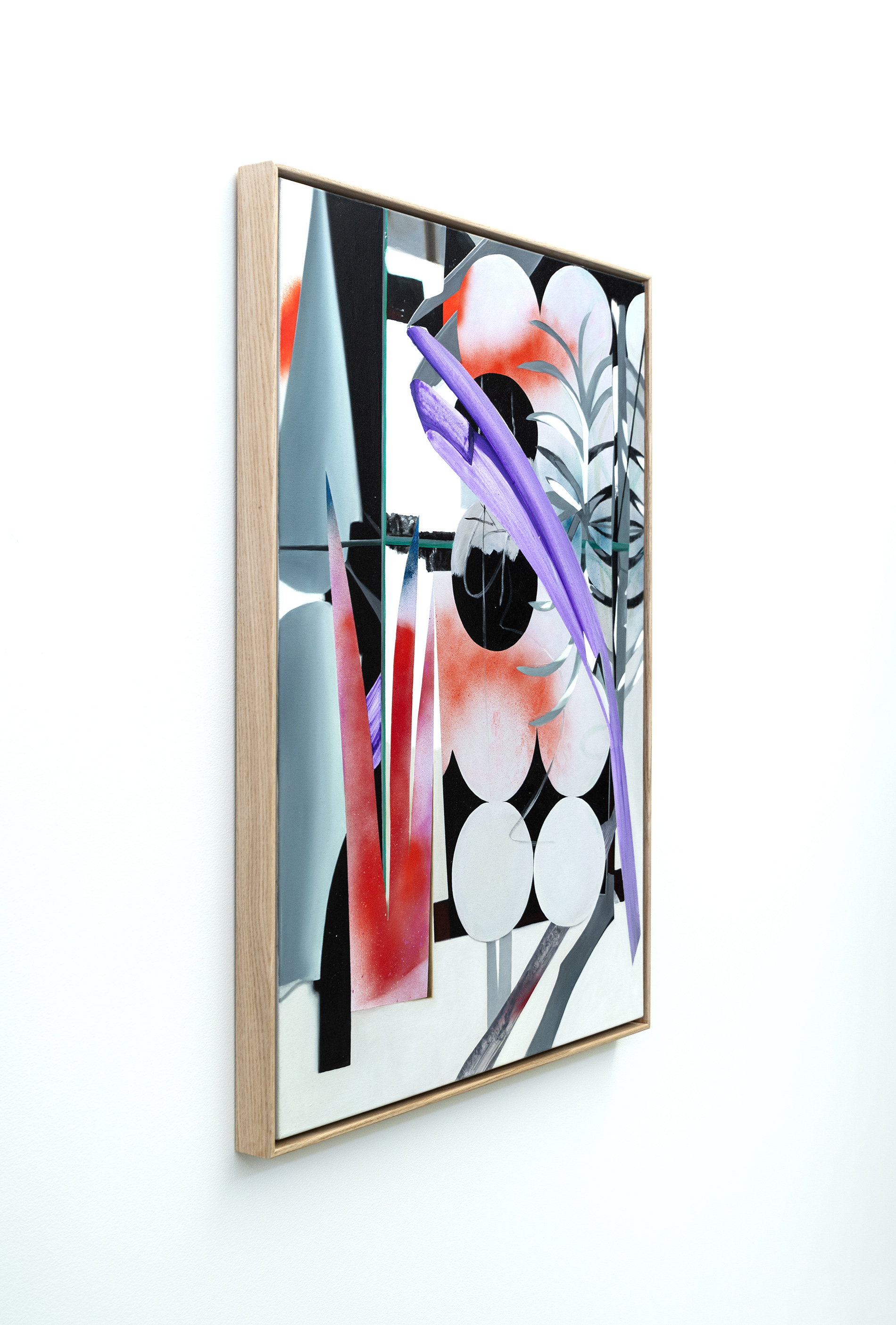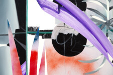 “These 26 paintings emerged from a process of exploration beginning with pieces of painted paper cut in shapes of foliage, placed inside a mirror box (hence, glass-land). The resulting three-dimensional mirrored images shatter, amplify and disrupt conventional views of nature rendered on a flat surface, giving rise to lush compositions with depth and unexpected juxtapositions.” Fiona Ackerman