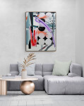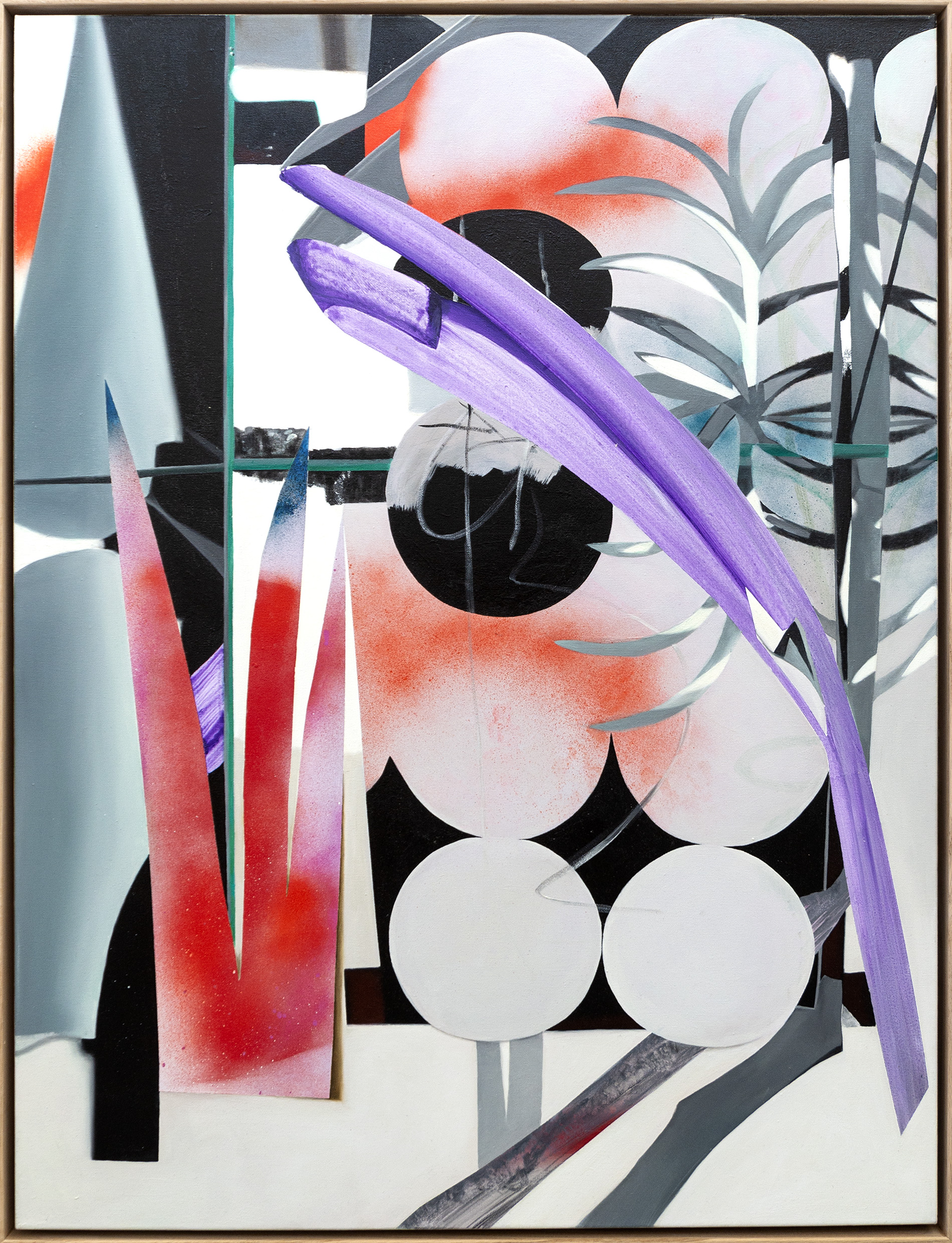 This contemporary abstract painting was inspired by nature and features a moon.Vancouver-based artist Fiona Ackerman has often turned to the beauty of the natural world as a source of inspiration. This is one of a series of paintings called ‘Glasslands’ that she created to explore the idea of the dual nature of the garden—at once a reflection of nature and the artificial. This concept of a garden called Heterotopia (a world within worlds) where the ‘wildness’ of a garden is controlled was discussed by Michel Foucault, a famous 20th-century French philosopher and historian. In this painting, graphic and organic shapes--the moon, and various plants create a dynamic composition in a vivid palette of red, purple, green, blue-gray and black and white.