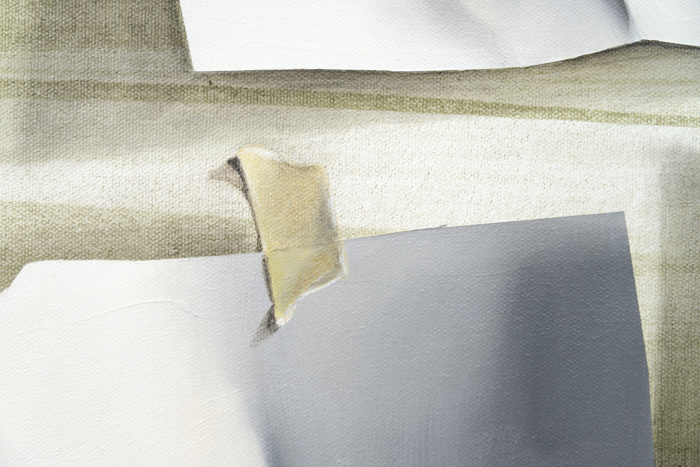 “I discovered that a very expressionistic piece, painted to feel loose, impulsive, and fleeting, could be transformed by the addition of a realistically painted piece of lightly adhered masking tape. With one small addition of something appearing less permanent than a gestural mark (tape, a post-it note), realism takes on an expressive fragility, and the gestural abstraction becomes the painting’s bones, the solid ground on which realism sits lightly.” Fiona Ackerman