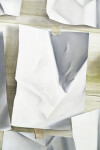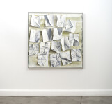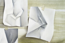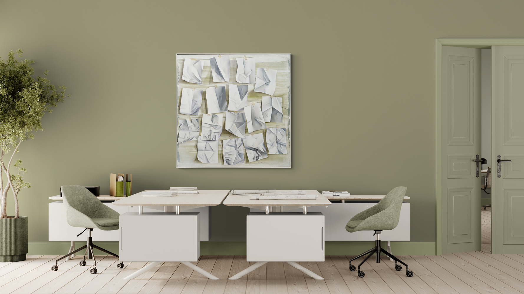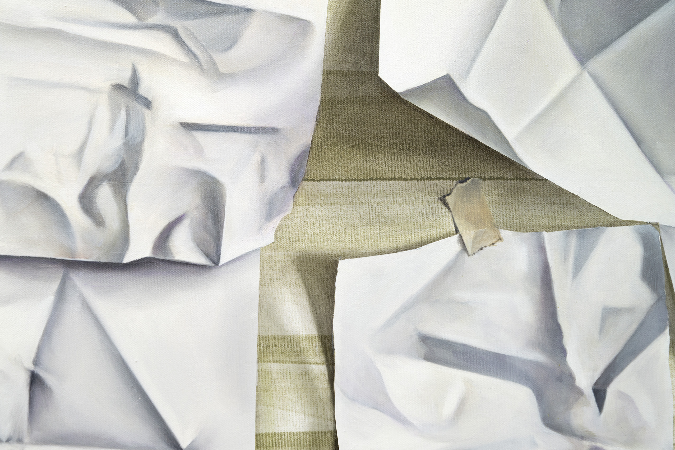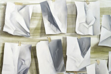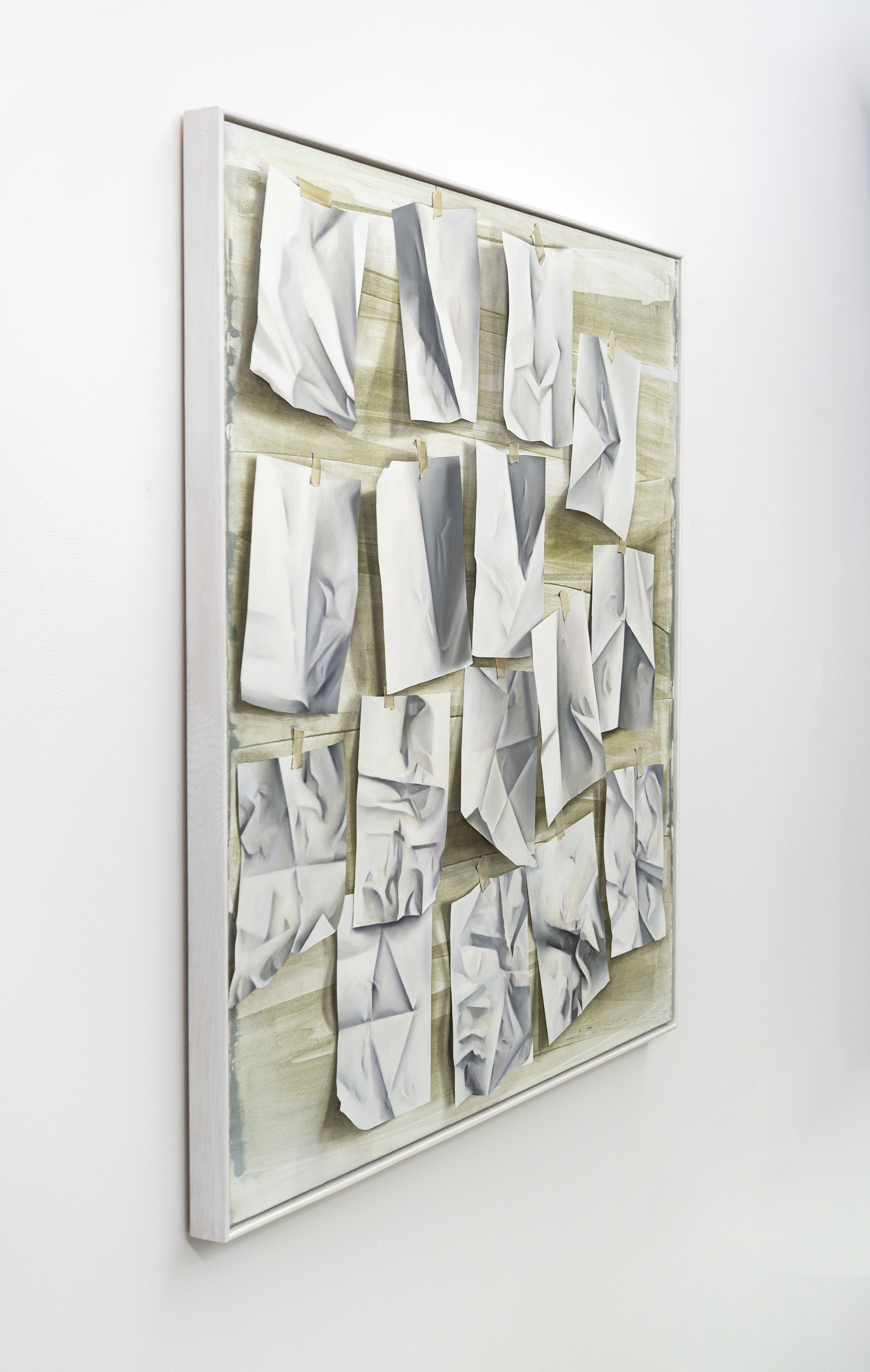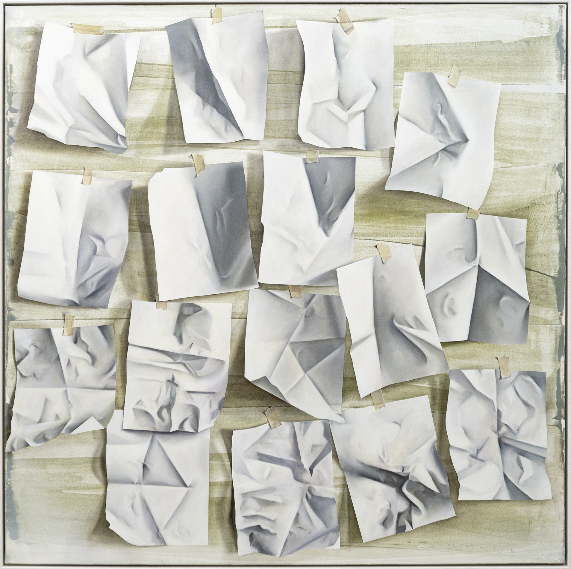 Here, a series of white crumpled notes catching light and shadow sit in four rows—each one casually taped to a creamy-coloured wall. The effect is intimate and immediately engages the viewer in the ‘conversation.’