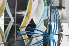 “These 26 paintings emerged from a process of exploration beginning with pieces of painted paper cut in shapes of foliage, placed inside a mirror box (hence, glass-land). The resulting three-dimensional mirrored images shatter, amplify and disrupt conventional views of nature rendered on a flat surface, giving rise to lush compositions with depth and unexpected juxtapositions.” Fiona Ackerman