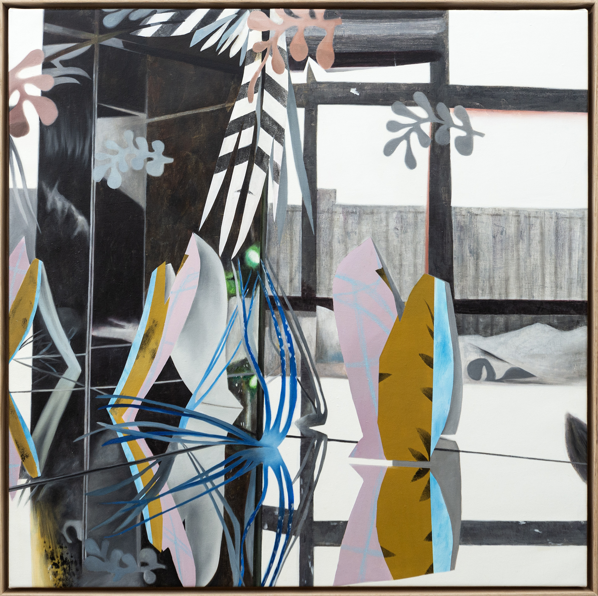 This contemporary abstract painting explores a garden theme.Fiona Ackerman created a unique series of paintings called ‘Glasslands’ inspired by a concept that explores the garden as being both a reflection of the natural and the artificial. This idea called ‘Heterotopia’ (a world within worlds) where the ‘wildness’ of a garden is controlled was discussed by Michel Foucault, a famous 20th-century French philosopher and historian. In this dynamic piece, a view of a garden appears to be framed by a studio window in black and white. A collage of shapes—mirrored images both graphic and organic appear on the left of the canvas in an eclectic colour palette of gold, blues, pink, and green.