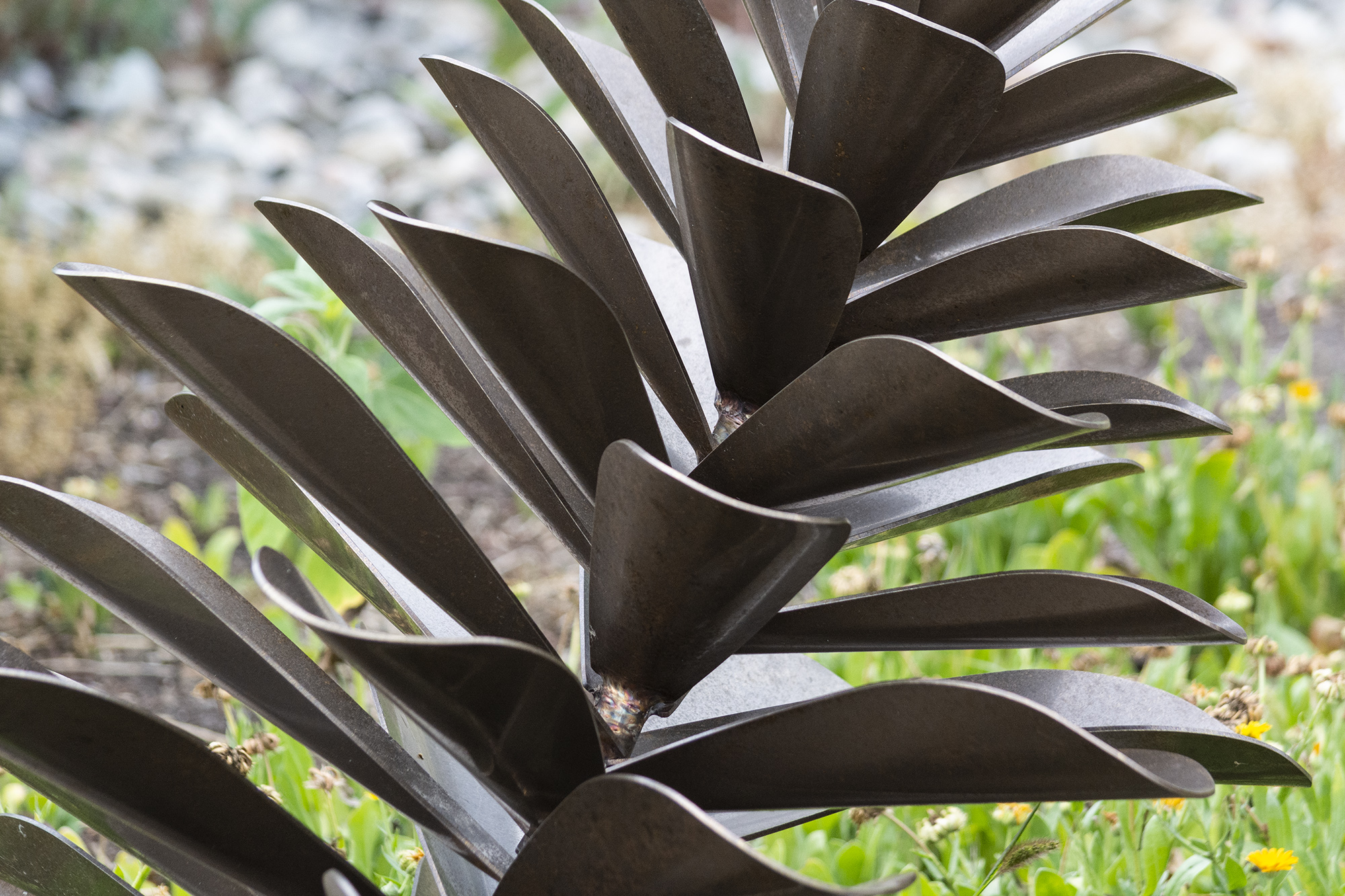 This contemporary outdoor sculpture of a pine cone is made from metal by Floyd Elzinga.The Canadian artist’s uniquely beautiful metalwork is inspired by nature. The pine cone has become one of Elzinga’s signature pieces, valued for its exquisite, realistic detail. This large pine cone is hand forged from stainless steel that has been fired until it attains a golden colour. Its highly polished surface naturally reflects light. Elzinga loves the rugged durability of pine cones as seeds that represent regeneration and whose natural design is ideal for self-reproduction.
