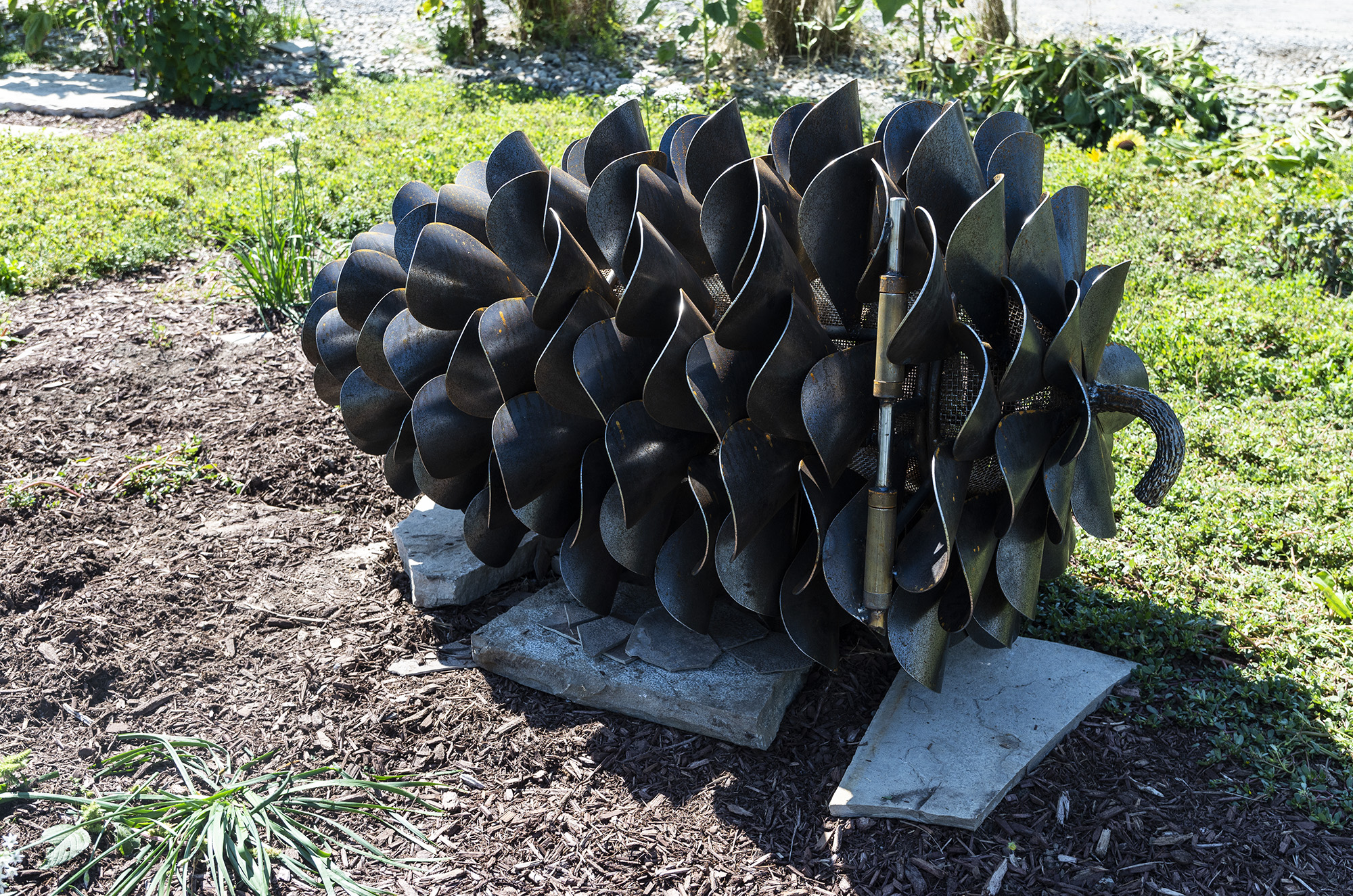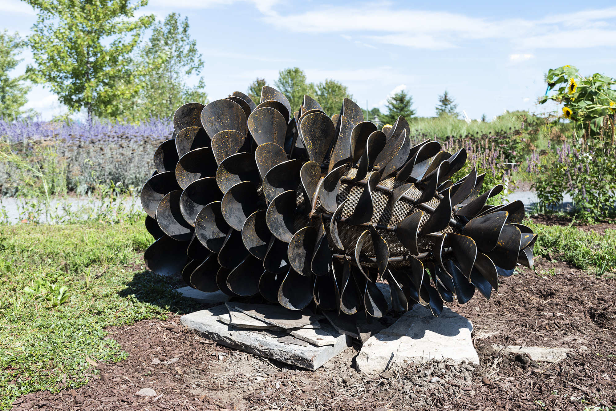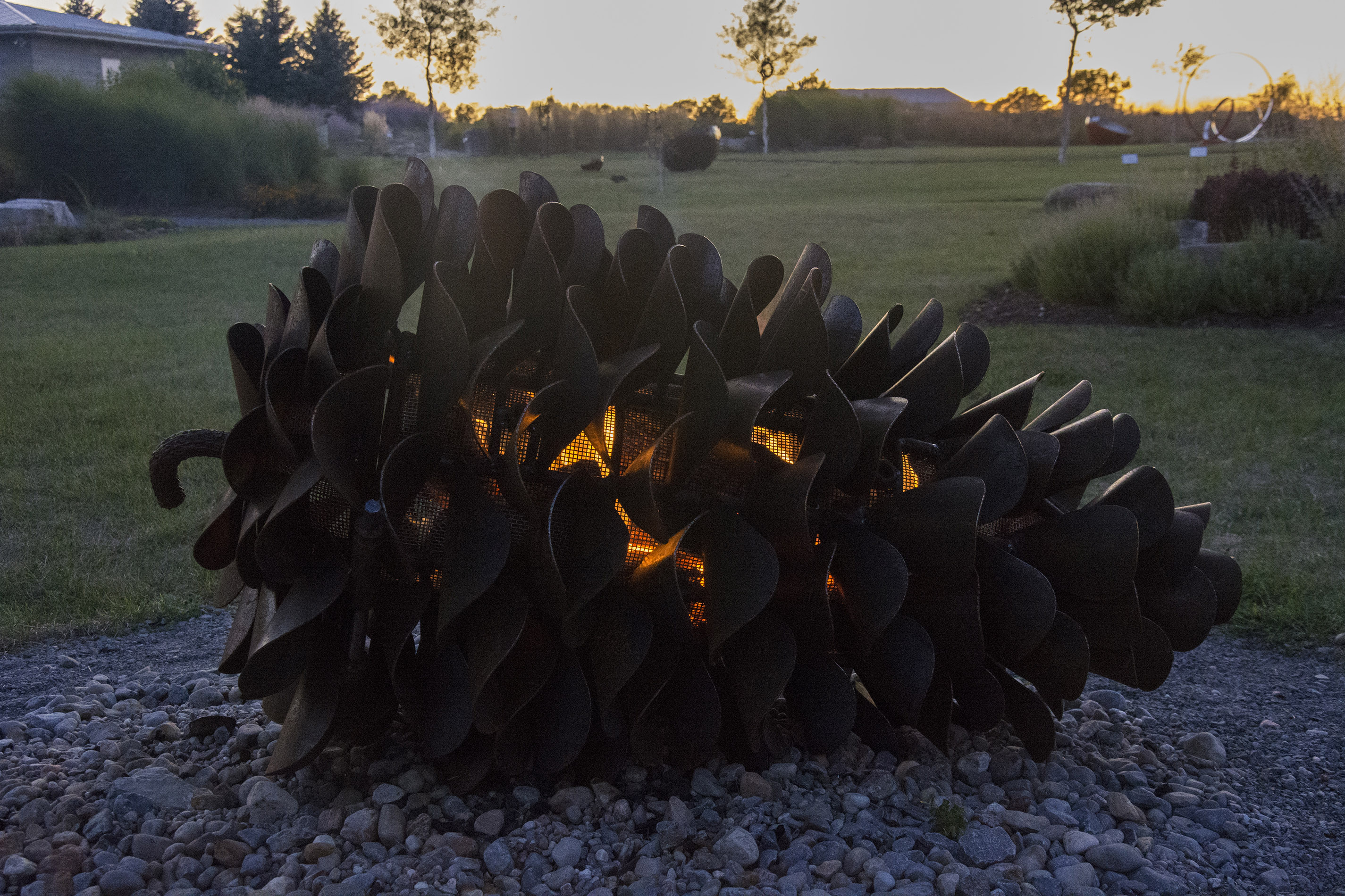 This contemporary outdoor steel sculpture of a pine cone by Floyd Elzinga is also wood-burning.Hand forged from corten and stainless steel, Floyd Elzinga’s impressive sculpture of a pine cone is designed to house logs for a fire. The end of the cone opens easily to allow for logs to be placed inside. The dark patina of the pine cone emulates the real thing. Elizinga’s dynamic sculptures reflect the rugged natural landscape that surrounds his studio on the Niagara escarpment. He is best known for re-creating iconic Canadian images—the pinecone, the maple leaf and the pine branch using industrial materials. His pop art pieces are both playful and inspiring.