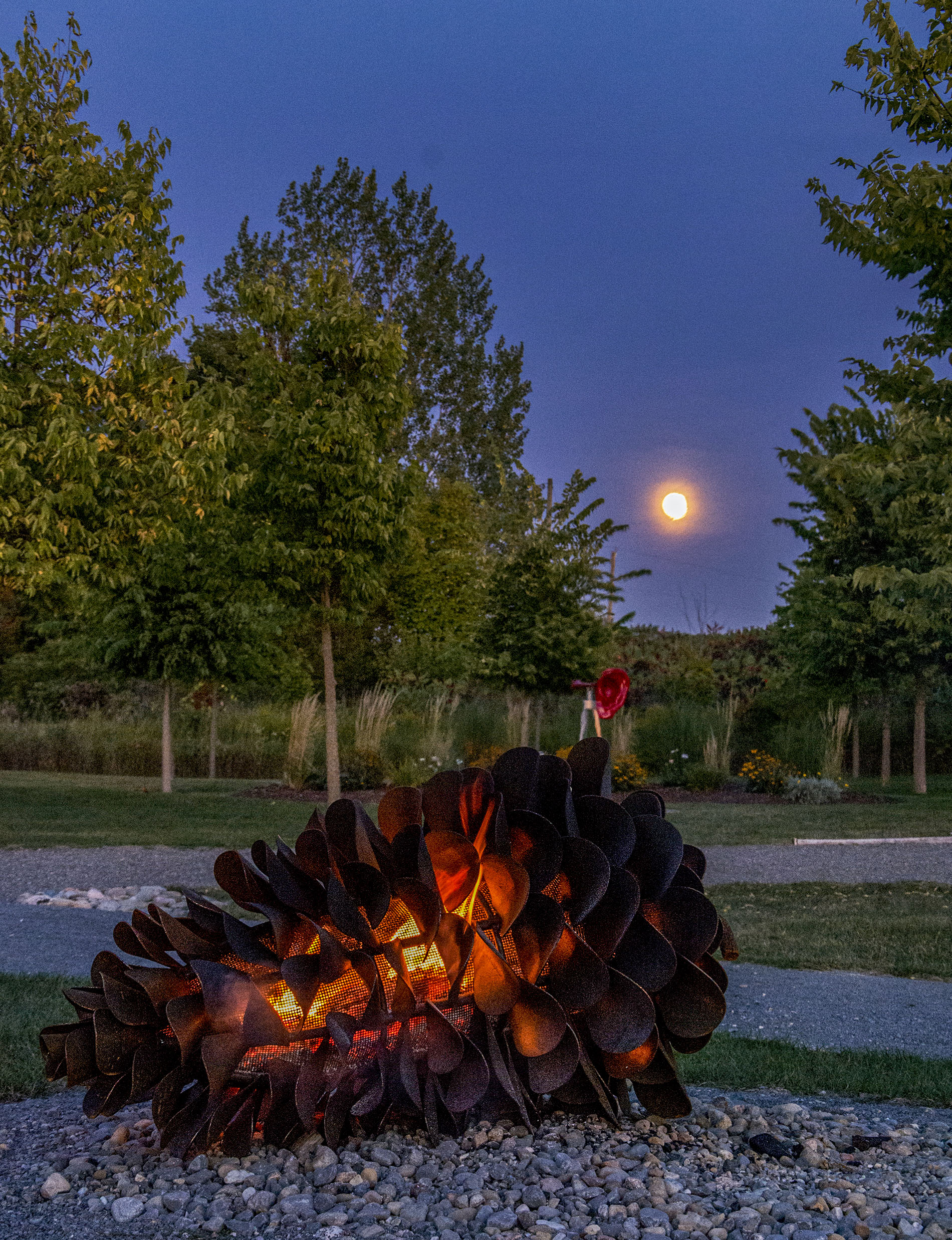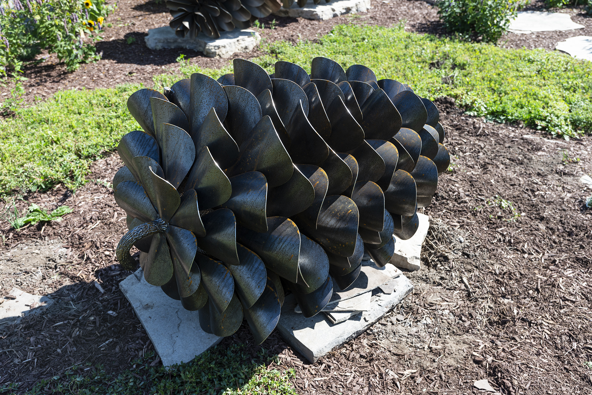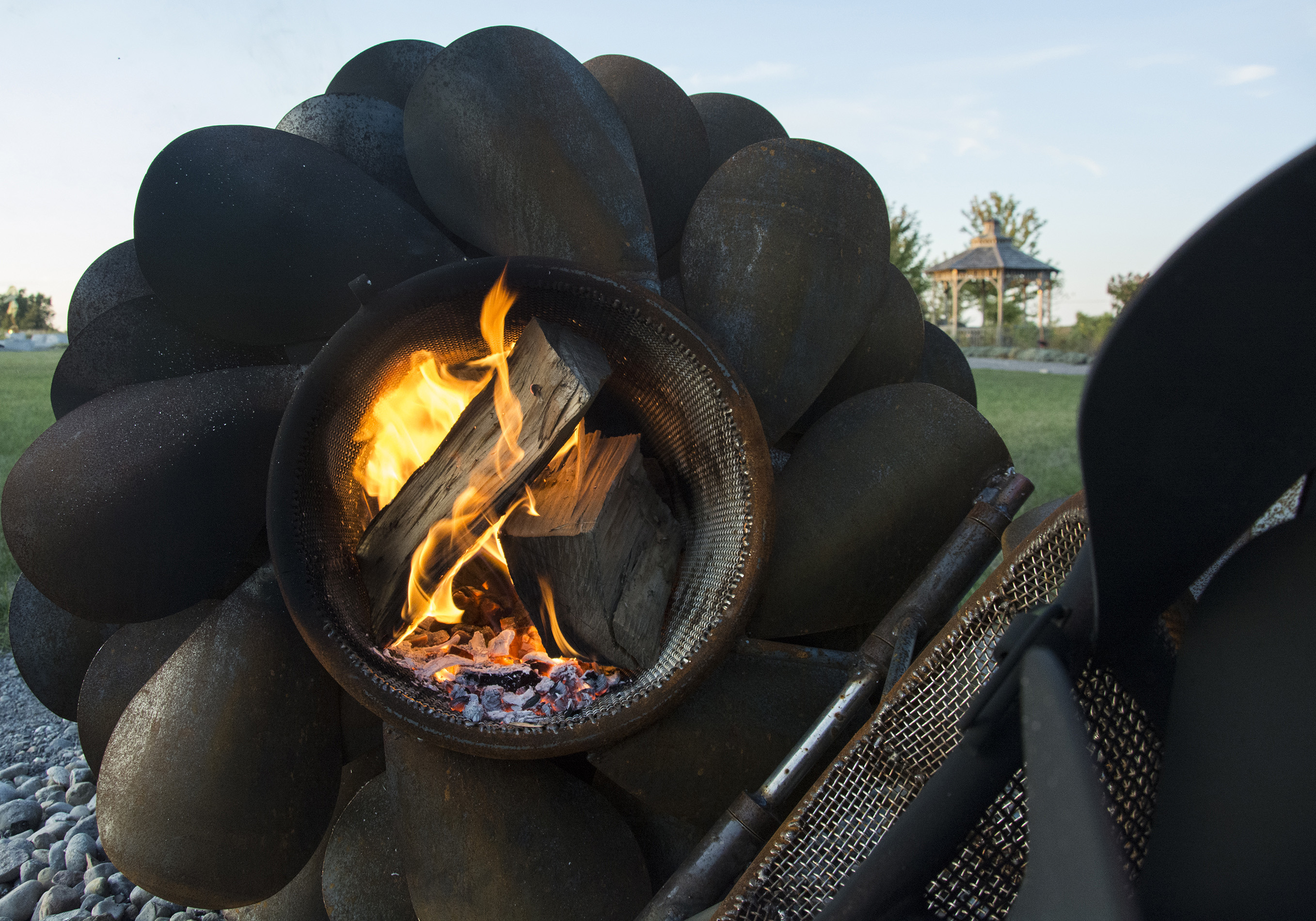 This contemporary outdoor steel sculpture of a pine cone by Floyd Elzinga is also wood-burning.Hand forged from corten and stainless steel, Floyd Elzinga’s impressive sculpture of a pine cone is designed to house logs for a fire. The end of the cone opens easily to allow for logs to be placed inside. The dark patina of the pine cone emulates the real thing. Elizinga’s dynamic sculptures reflect the rugged natural landscape that surrounds his studio on the Niagara escarpment. He is best known for re-creating iconic Canadian images—the pinecone, the maple leaf and the pine branch using industrial materials. His pop art pieces are both playful and inspiring.