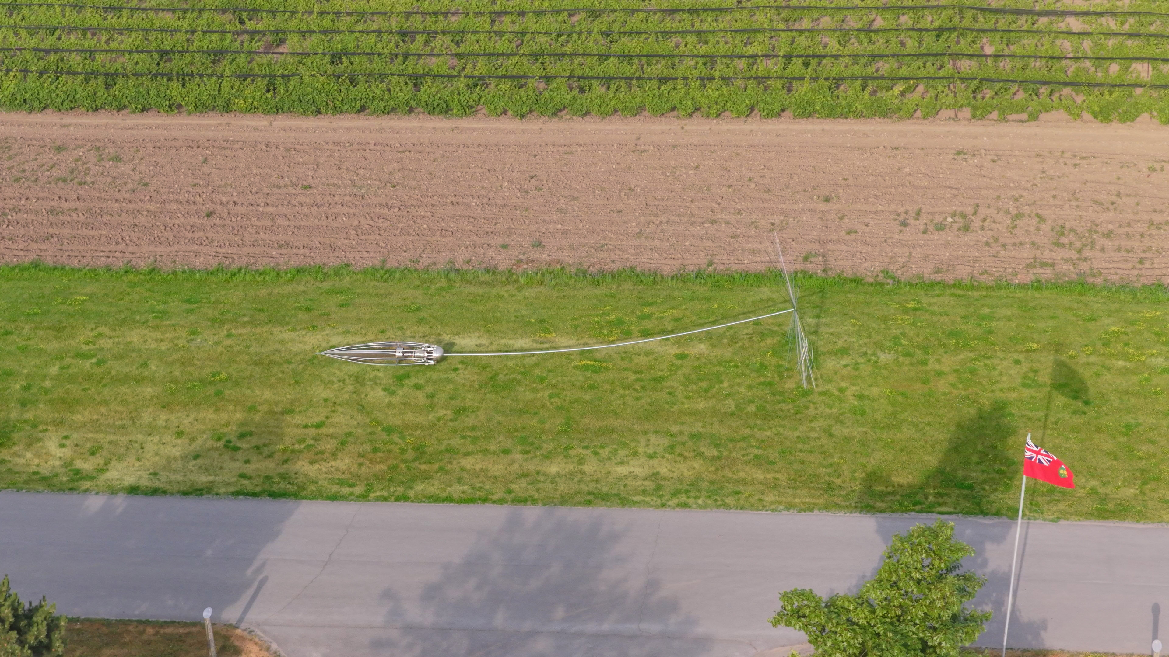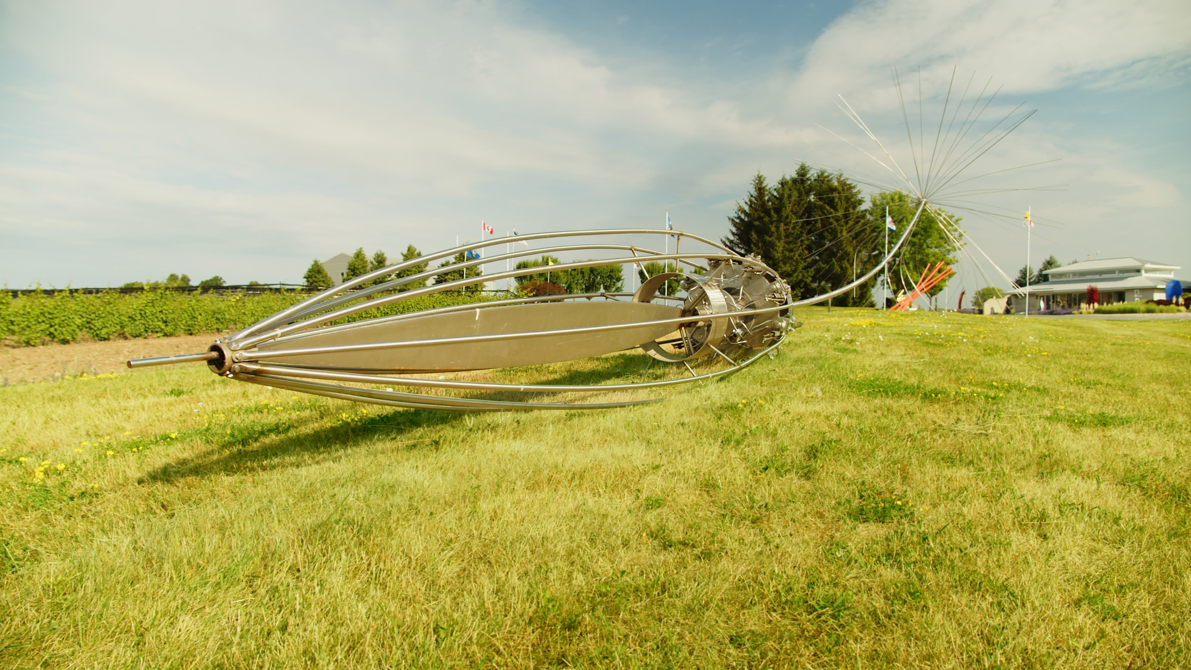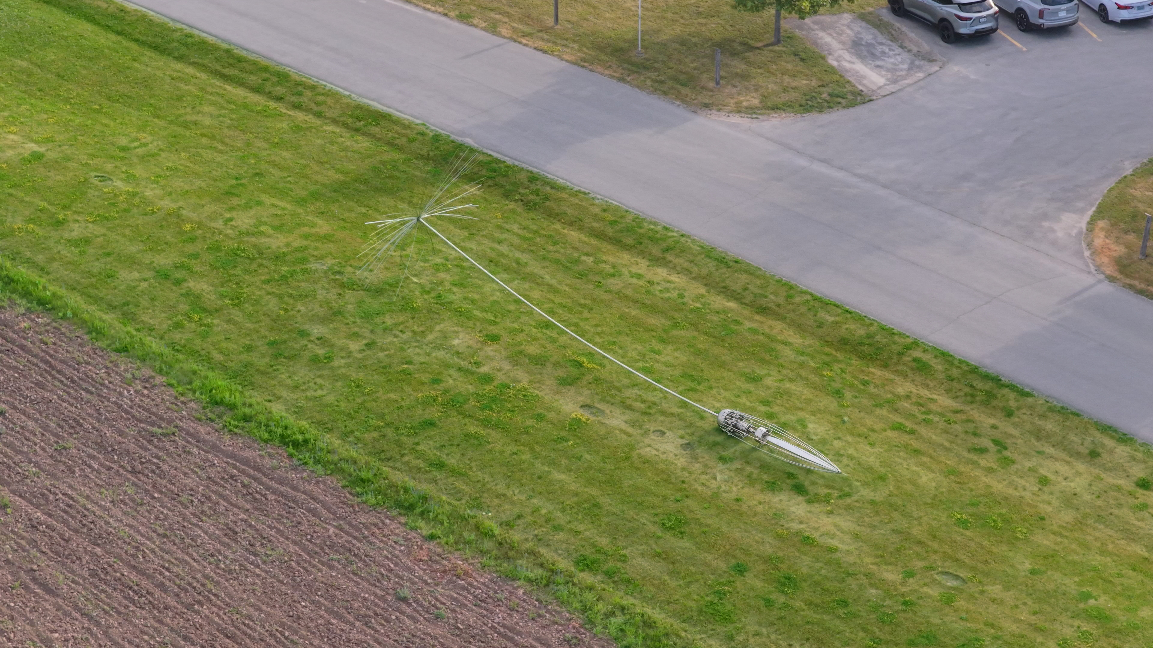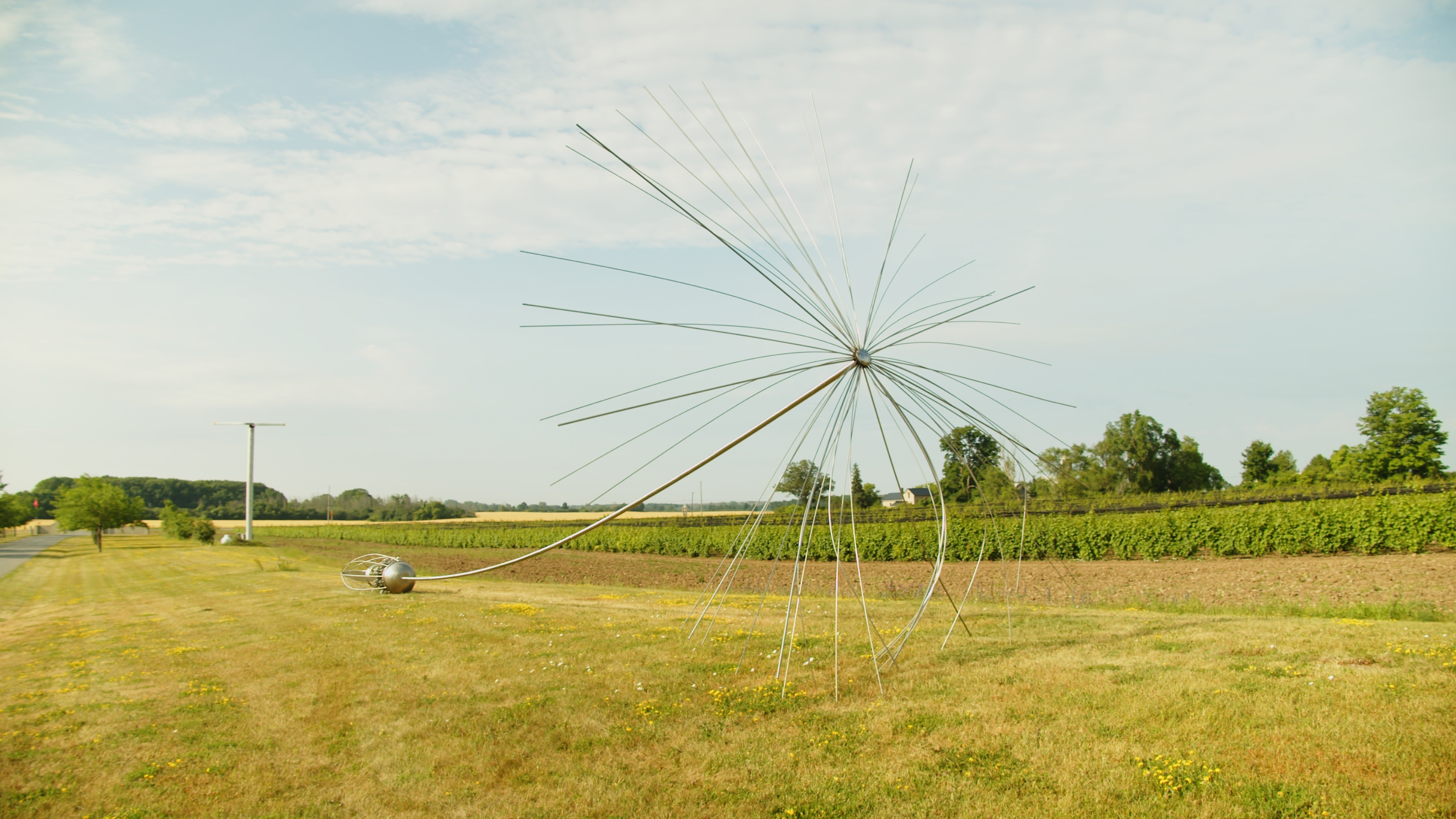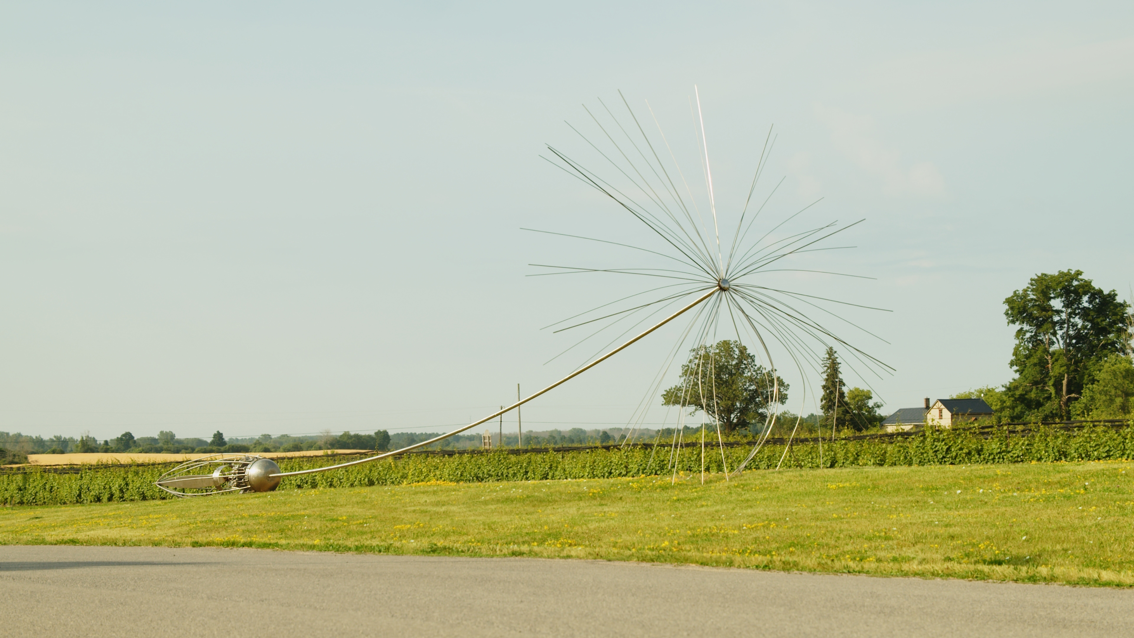 This contemporary outdoor monumental metal sculpture by Floyd Elzinga resembles a dandelion seed.Inspired by the naturally beautiful design and remarkable resilience of a dandelion seed, Canadian artist Floyd Elzinga has created an extraordinary sculpture. Known for his superb craftsmanship, this huge piece emulates the dynamic and delicate form of a dandelion seed. The delicate strands of the dandelion's parachute-like head, called a pappus, are hand-forged in stainless steel and attached along a lengthy stem to its pod-shaped base. No doubt Elzinga, whose distinctive artwork celebrates nature, was particularly awestruck by the unique shape of a dandelion seed, which allows it to travel on the wind as far as 800 kilometres.