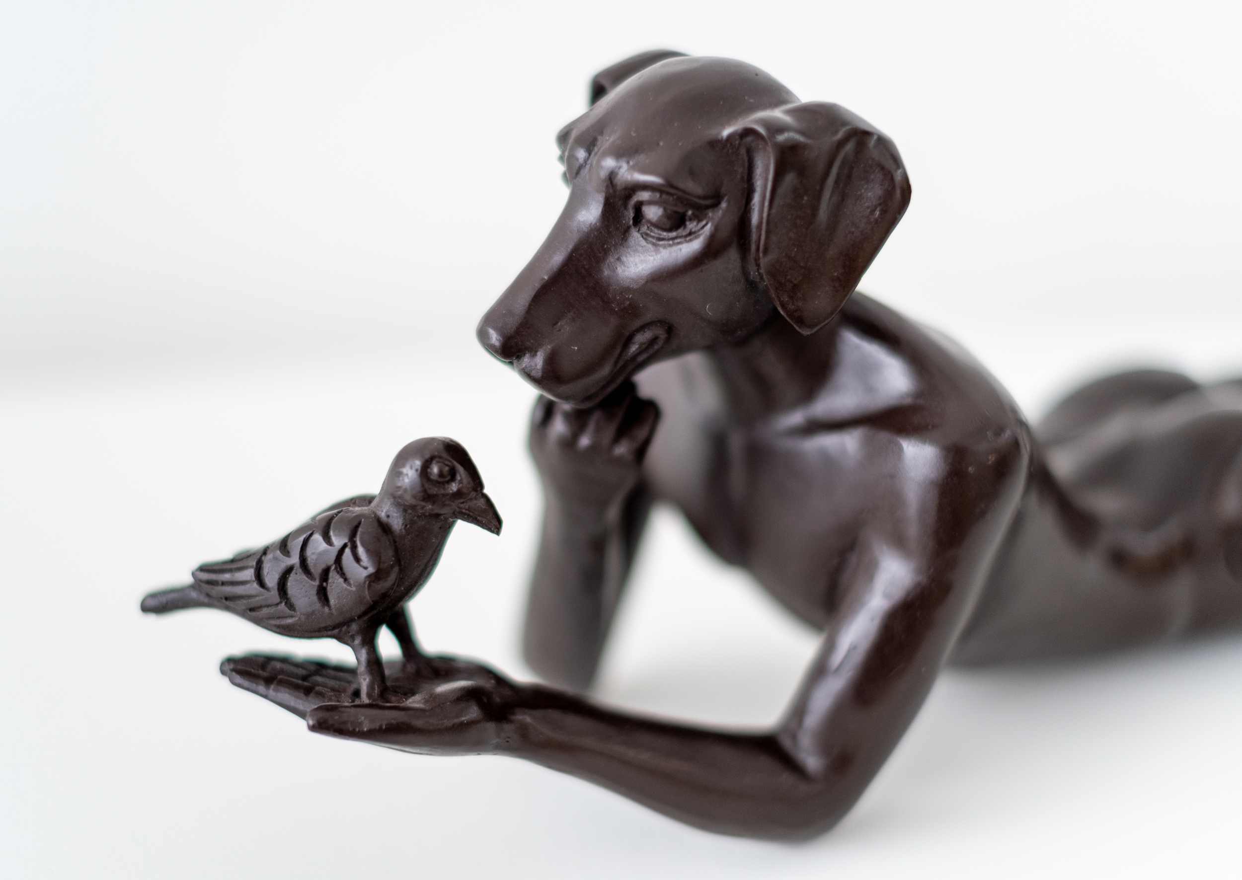 Here a reclining Dogman figure observes a bird sitting on his hand.