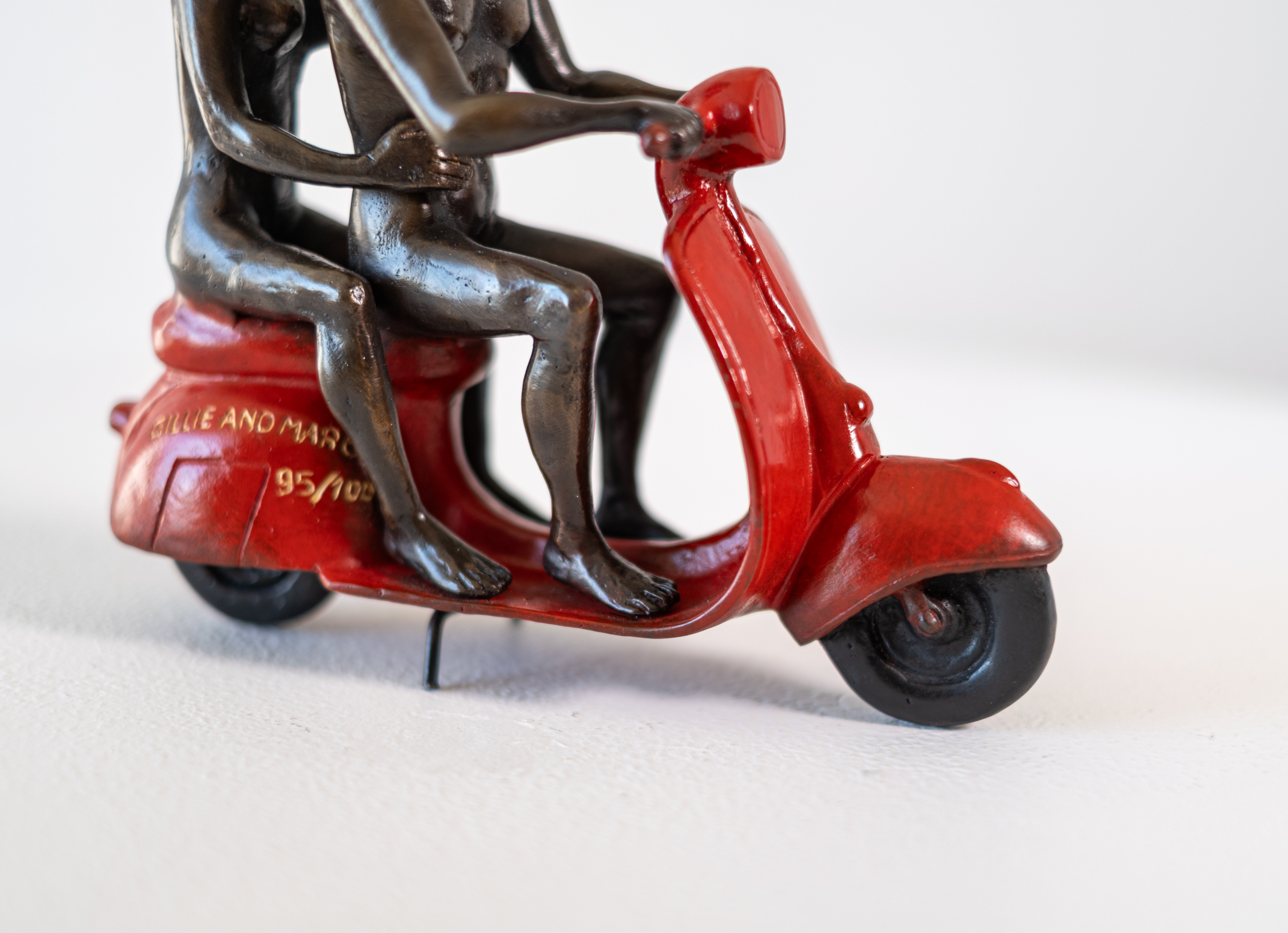 This contemporary bronze figurative tabletop sculpture featuring animals is by Gillie and Marc.The British/Australian artistic duo of Gillie and Marc’s humorous bronze sculptures have charmed the world. Their own animal/human hybrid couple—dogman and rabbitwoman are captured here riding a classic Italian scooter—a Vespa painted a bright red. The two are intended to represent the close human-animal connection many of us share. Love is always part of the story. Edition 95 of 100. Price is in USD.