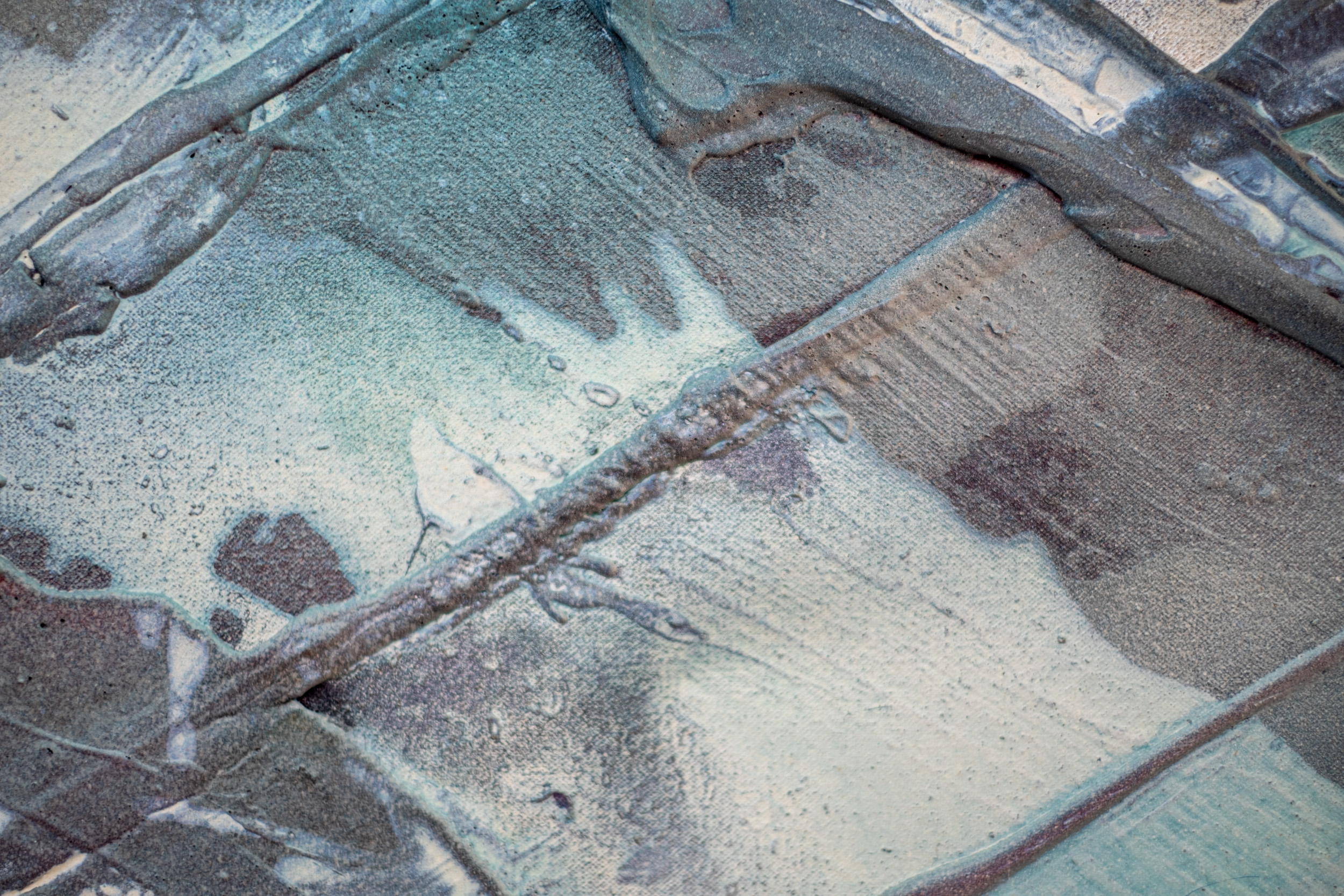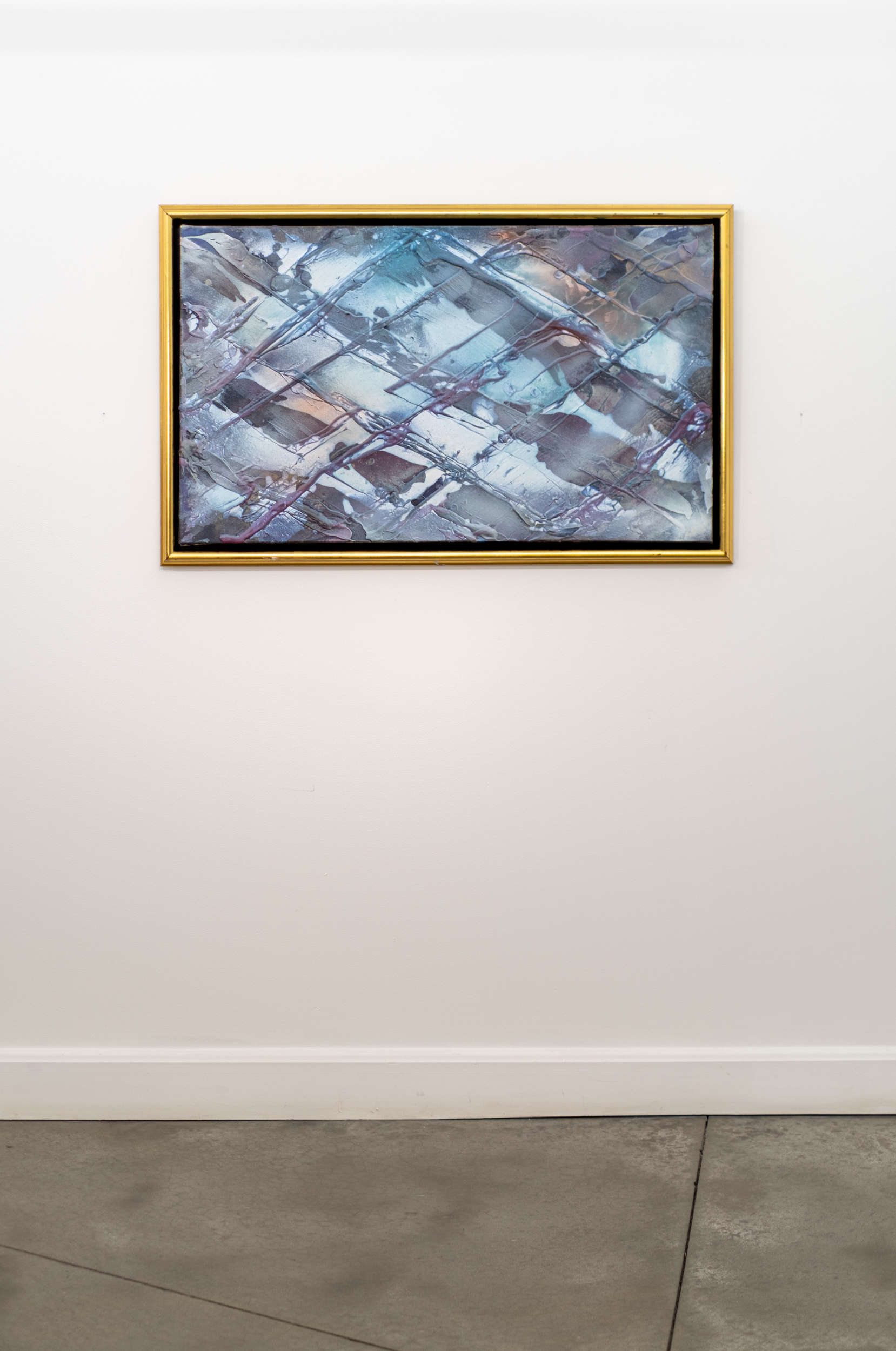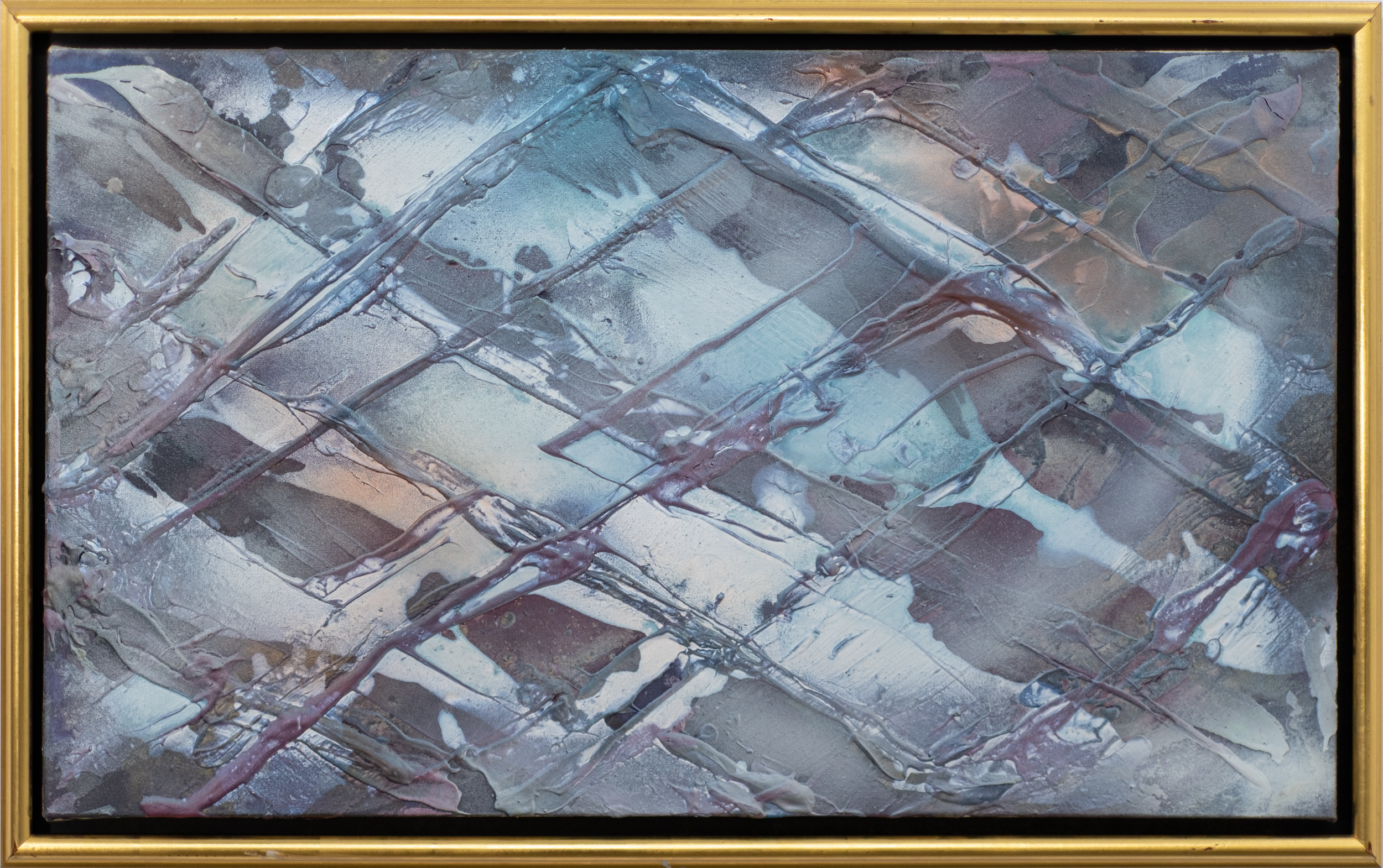 With this painting, passages of thickly applied colour—in blues, aubergine, melon and gray criss-cross the canvas creating a lively pattern.