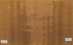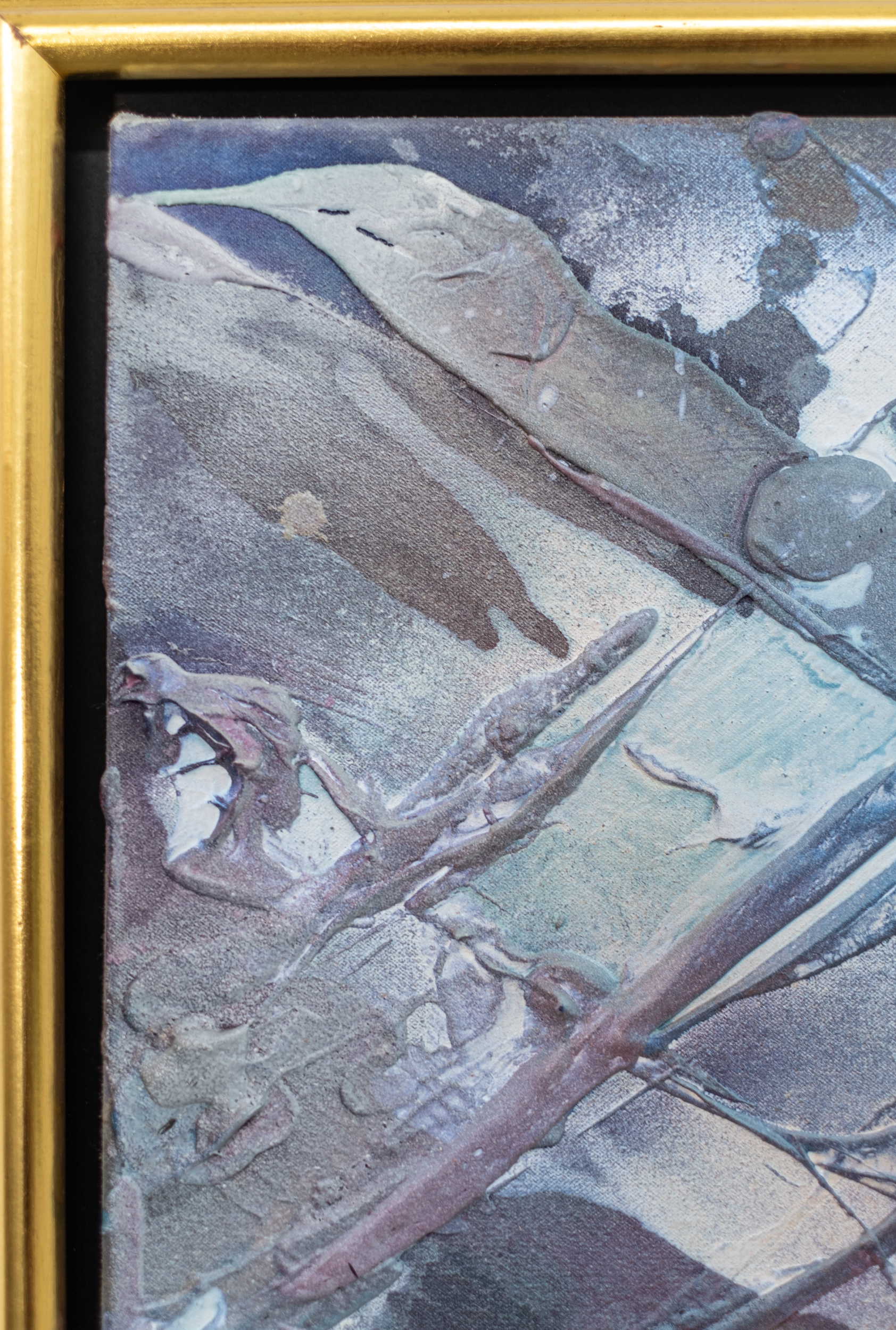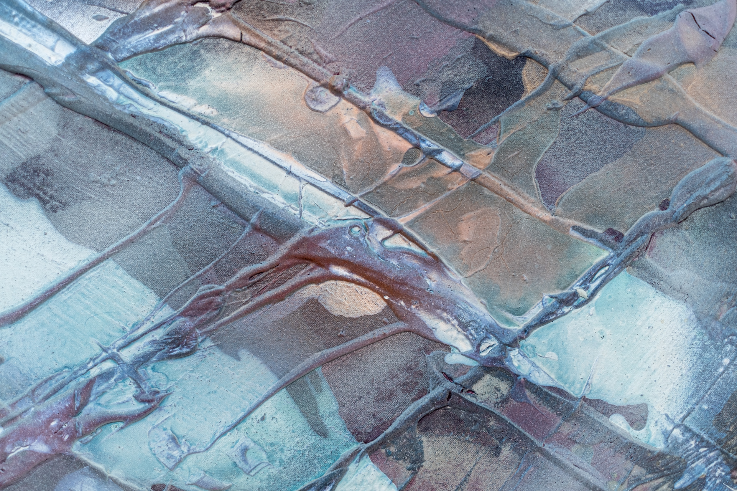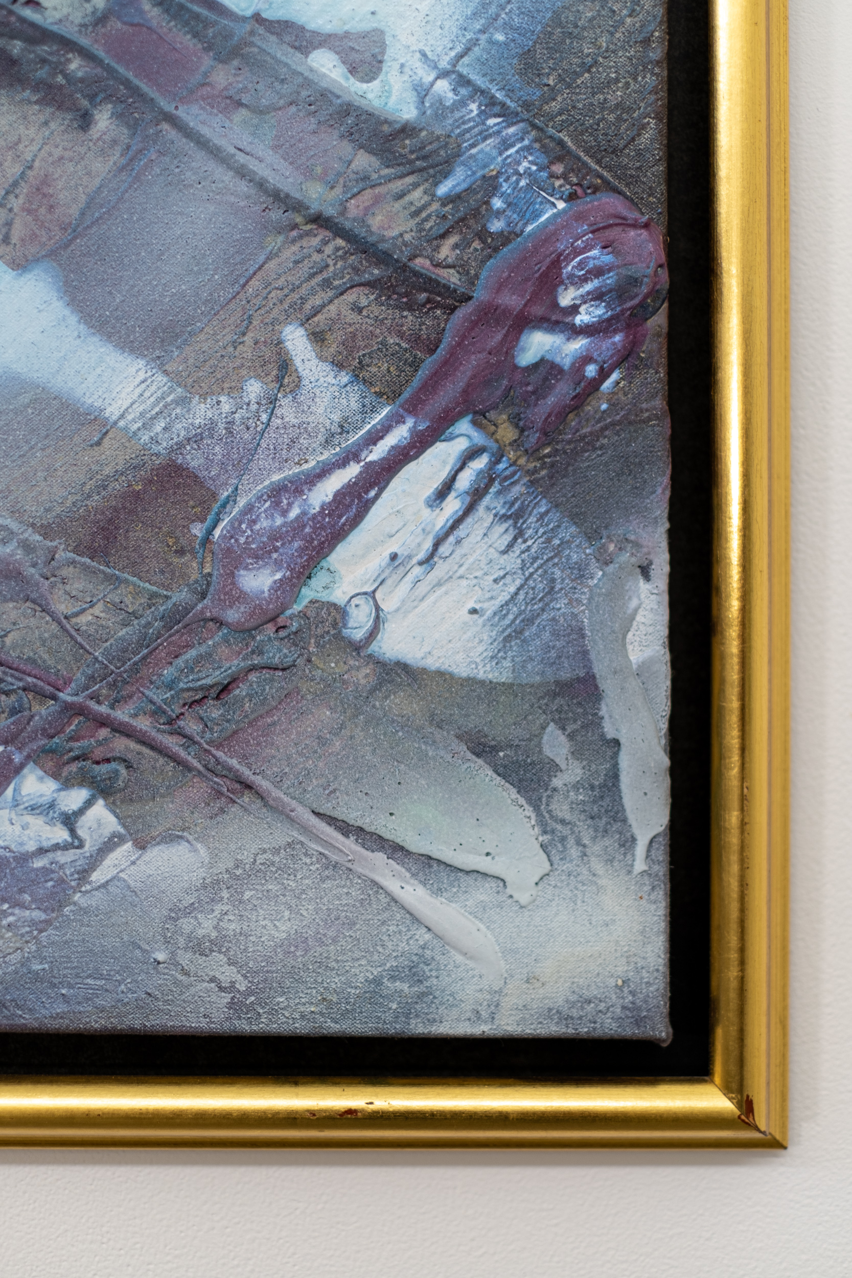 With this painting, passages of thickly applied colour—in blues, aubergine, melon and gray criss-cross the canvas creating a lively pattern.