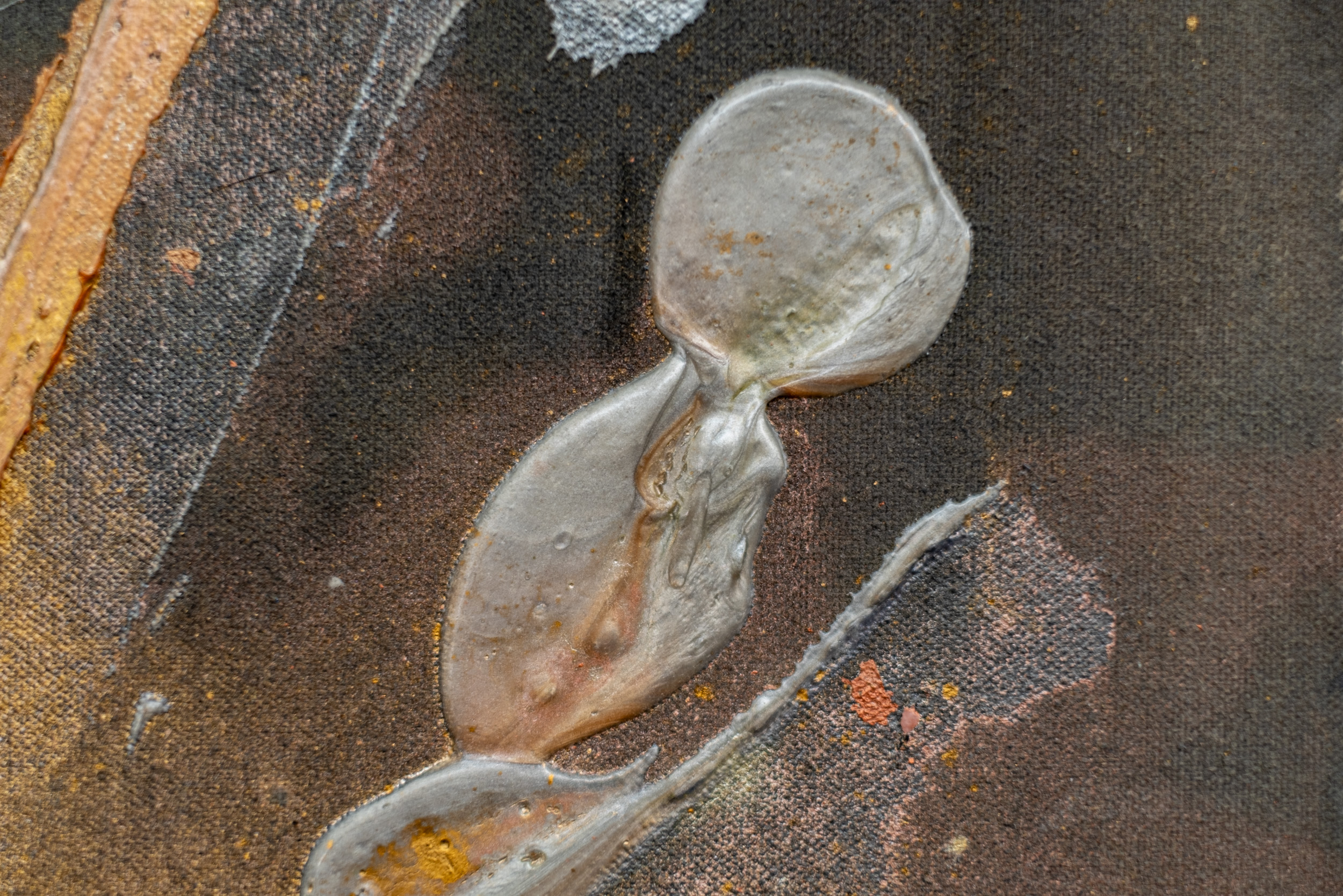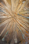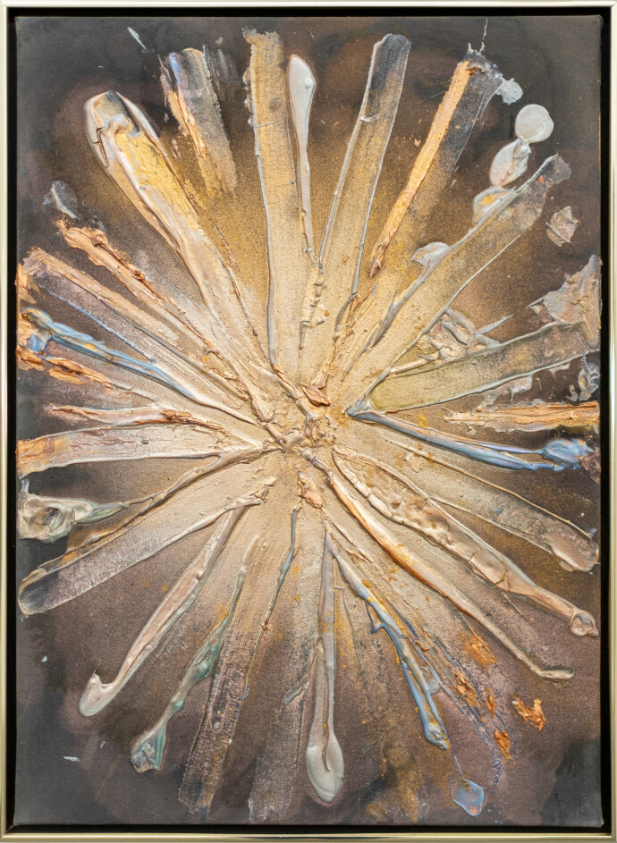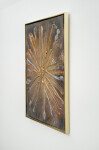 This acrylic painting features a signature ‘spoke-like’ spiral form where ‘rays’ in thickly applied creamy yellow and white radiate out from the center. A charcoal background makes the ‘spokes’ pop. Feist’s first ‘Spoke’ painting was completed in 1975, a moment he described as ‘genuine eureka.’