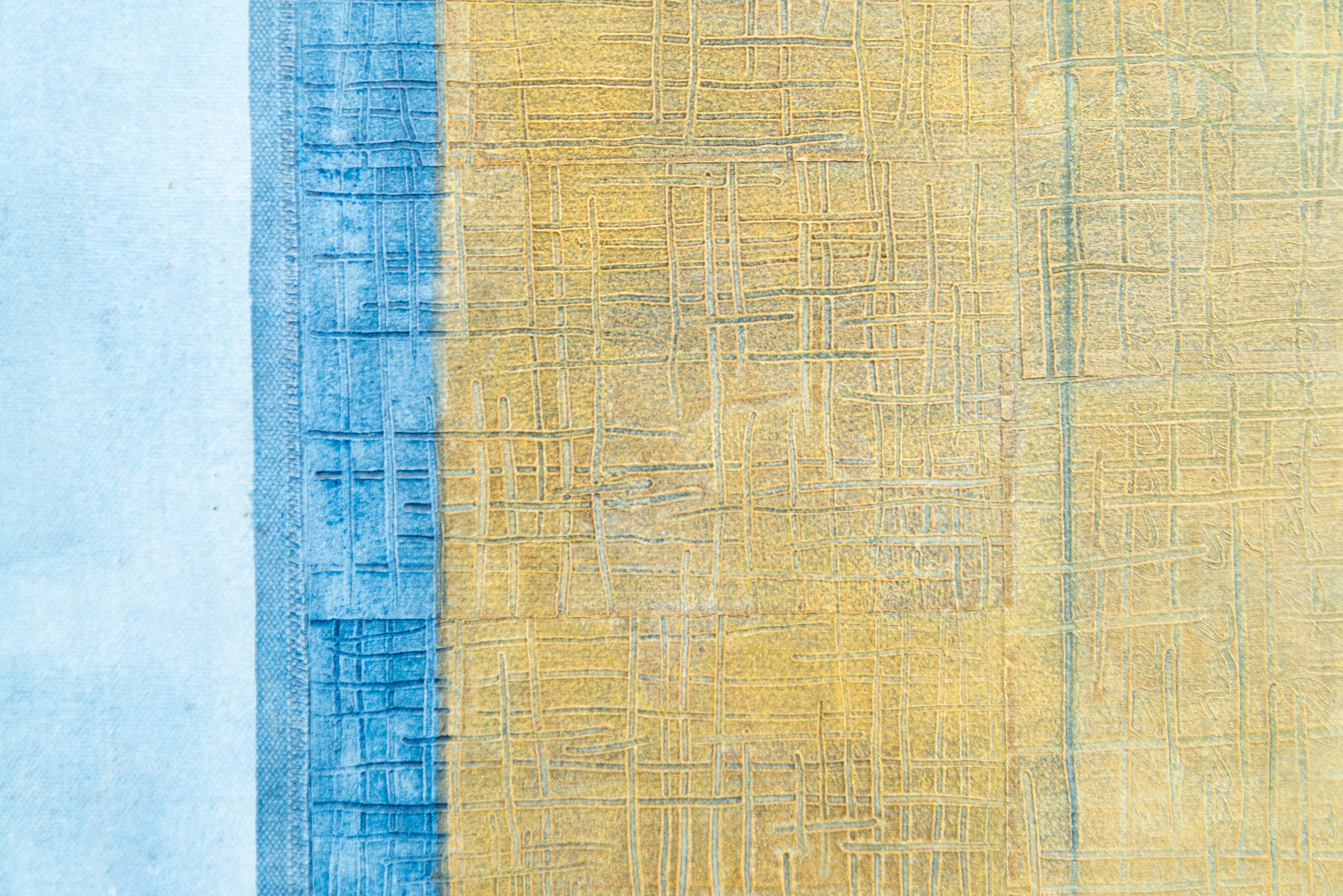 Simply gorgeous! Two canoe-shaped vessels appear to traverse the canvas in this recent series of enigmatic works by Heather Allen Hietala. The natural earthy colour palette of her acrylic and mixed media composition is accented by broad vertical bands of a wash of sky blue. For Hietala the vessel represents life’s journey; the open space—a window for the soul. The textured netting on the canvas is from onion bags saved by the artist’s sister. The paper that creates a 3-D effect for the vessels is salvaged from her grandmother’s collection of watercolours and life drawings. Elegant inscriptions reveal the artist’s thoughts. This series was created as an homage to Hietala’s parents.“We are all on a journey and one day we will go somewhere we have never been.” Heather A. Hietala