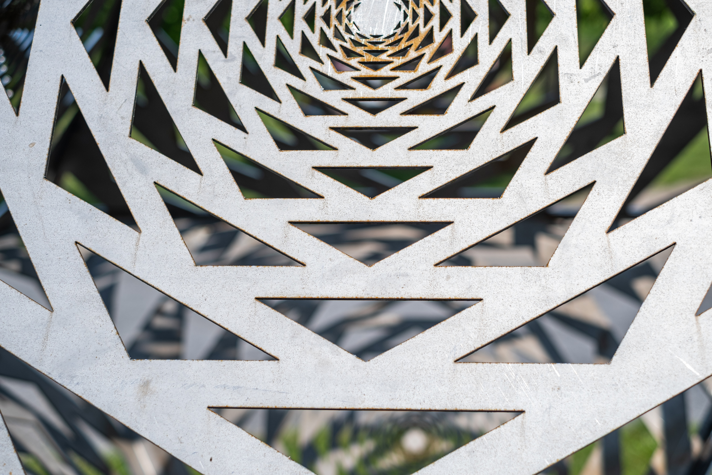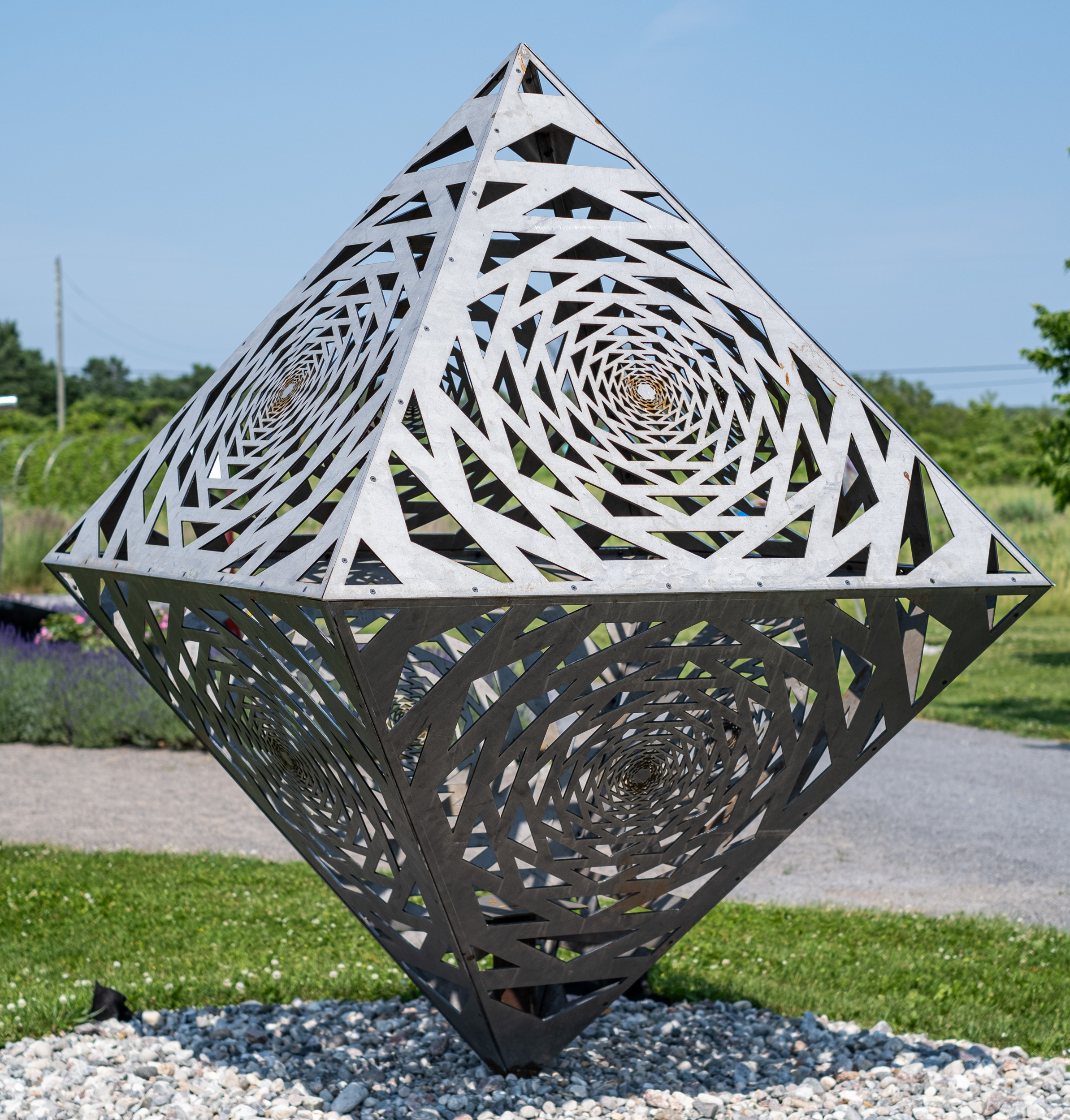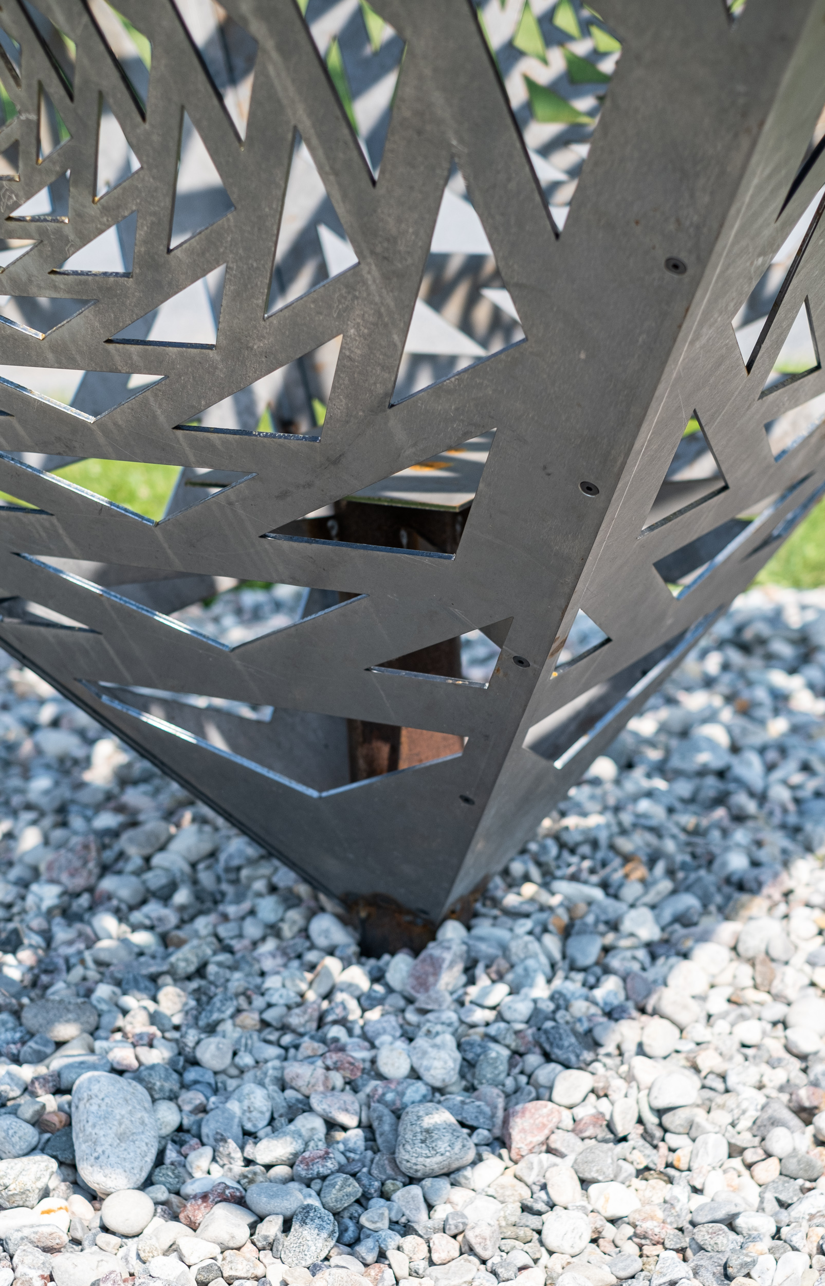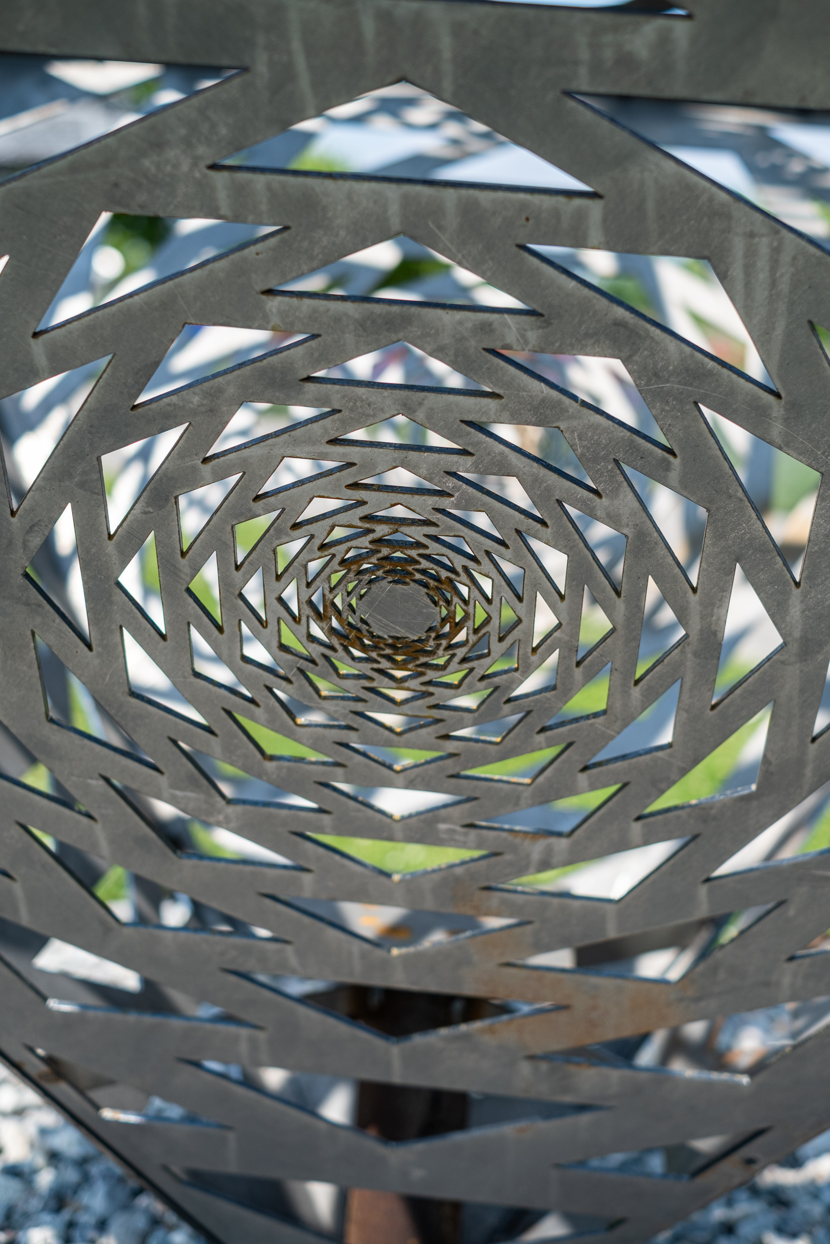 A collaborative project, artist Javid Jah and fabricator Alex Akbari of Qube Inc. re-designed this series from a recent public art exhibition in downtown Toronto, which was exhibited in collaboration with Roger Mooking and Wyandot artist Catherine Tammaro.The dynamic geometric form of the three pieces—Terra, Aqua and Aero (the elements of earth, water and air) is inspired by the ideas of cosmology (the study of the universe) and sacred ancestral principles. Forged from steel, light shines through the intricately detailed pattern of perforations on the surface. Each individual sculpture can also be used as a wood burning or gas fire pit or modified to include LED lights for nighttime display.