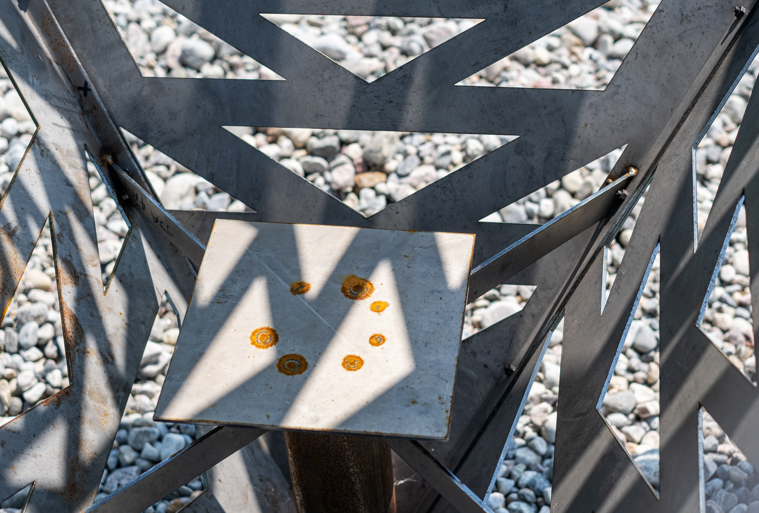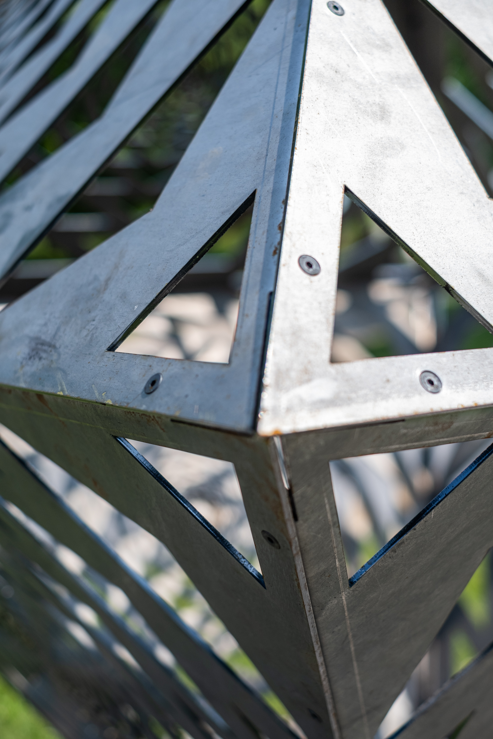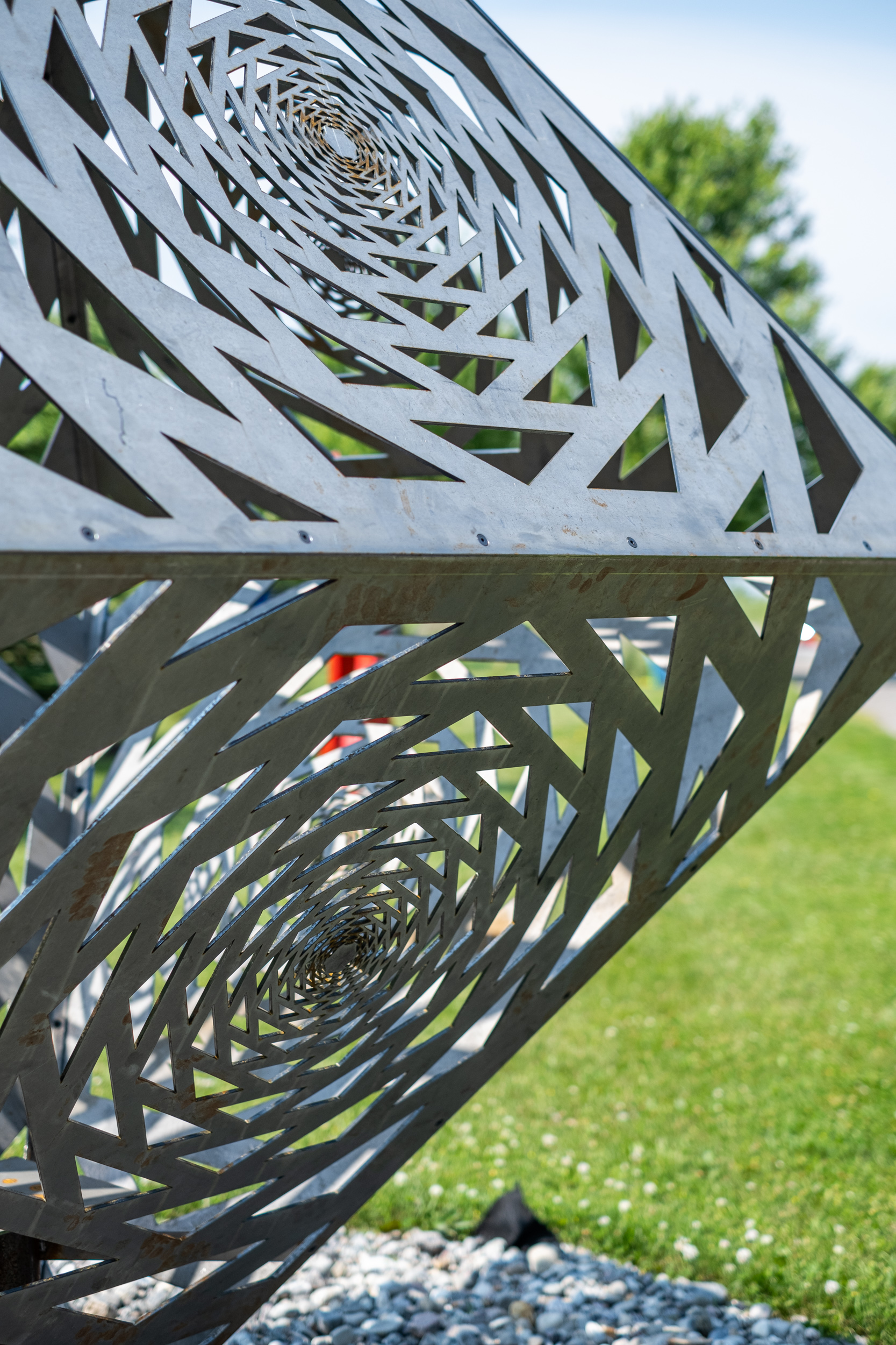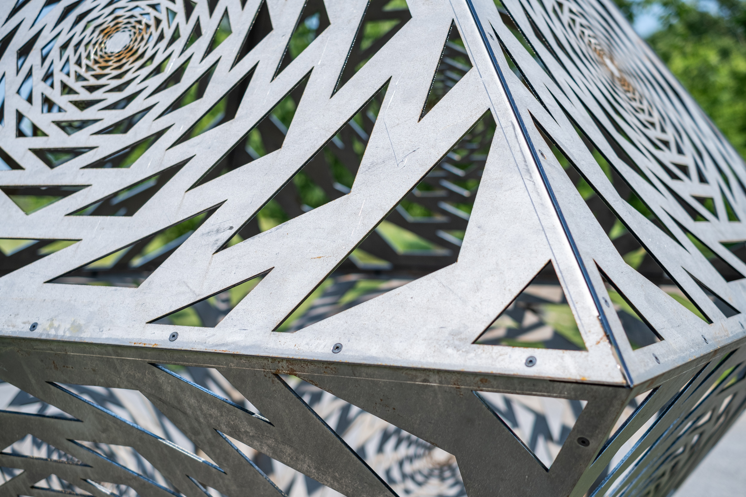 A collaborative project, artist Javid Jah and fabricator Alex Akbari of Qube Inc. re-designed this series from a recent public art exhibition in downtown Toronto, which was exhibited in collaboration with Roger Mooking and Wyandot artist Catherine Tammaro.The dynamic geometric form of the three pieces—Terra, Aqua and Aero (the elements of earth, water and air) is inspired by the ideas of cosmology (the study of the universe) and sacred ancestral principles. Forged from steel, light shines through the intricately detailed pattern of perforations on the surface. Each individual sculpture can also be used as a wood burning or gas fire pit or modified to include LED lights for nighttime display.