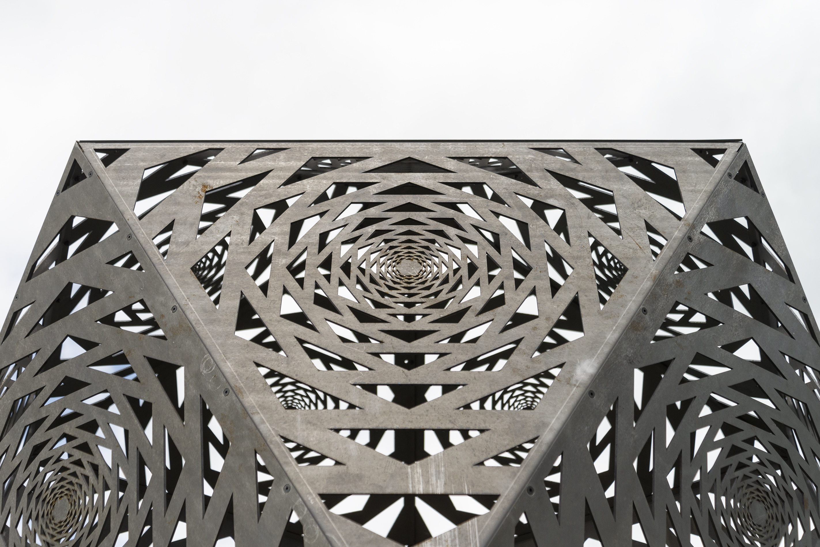 “These crystalline sculptures follow the order of the Platonic solids (an ancient geometric term for a 3-D form that has ‘faces’ identical in shape and size) creating a balanced, ordered presence, designed with a fire tray and a tongue to sustain wood fires. “ Javid Jah