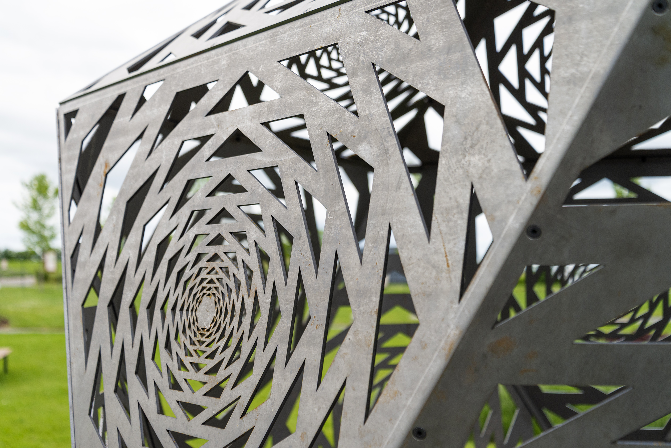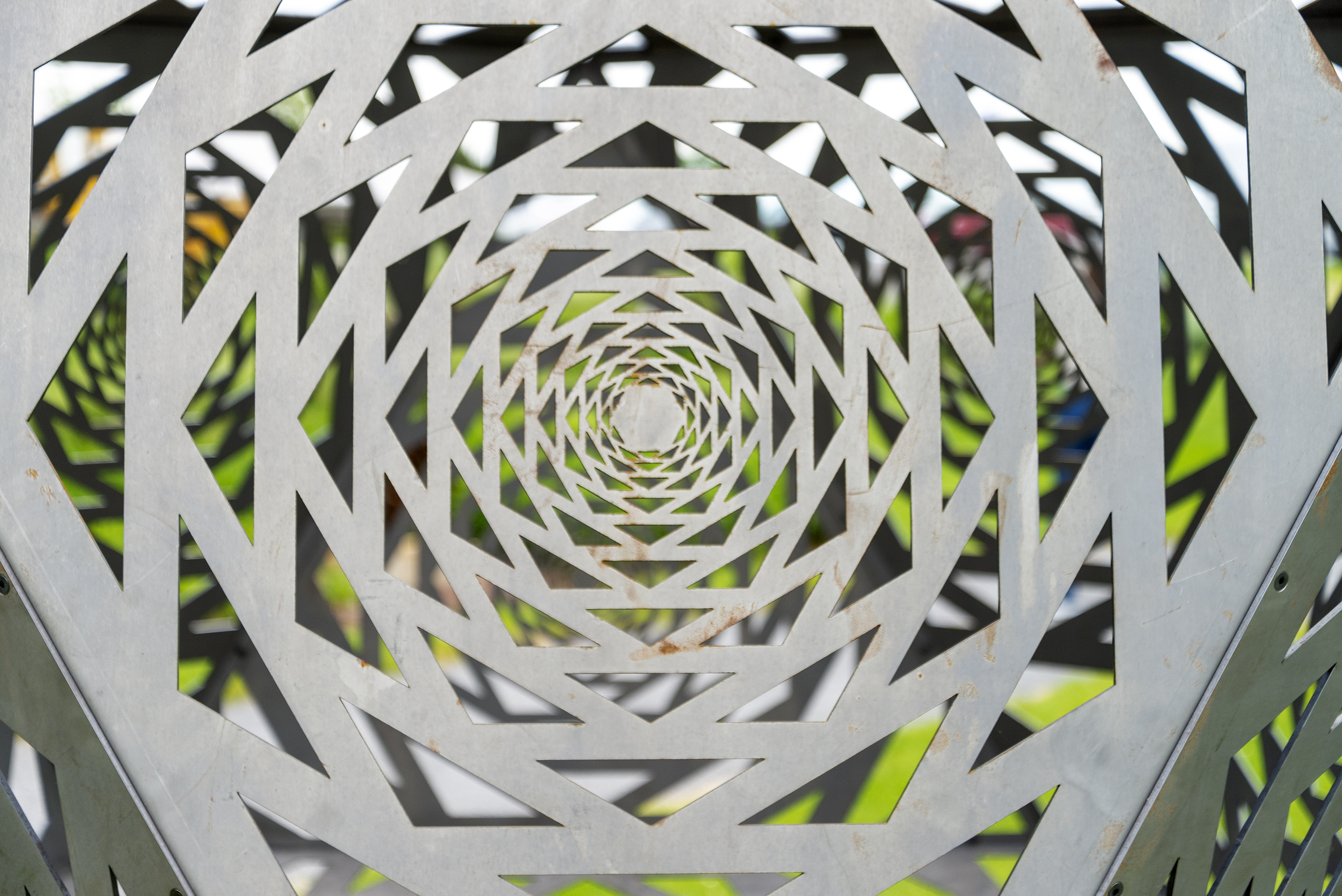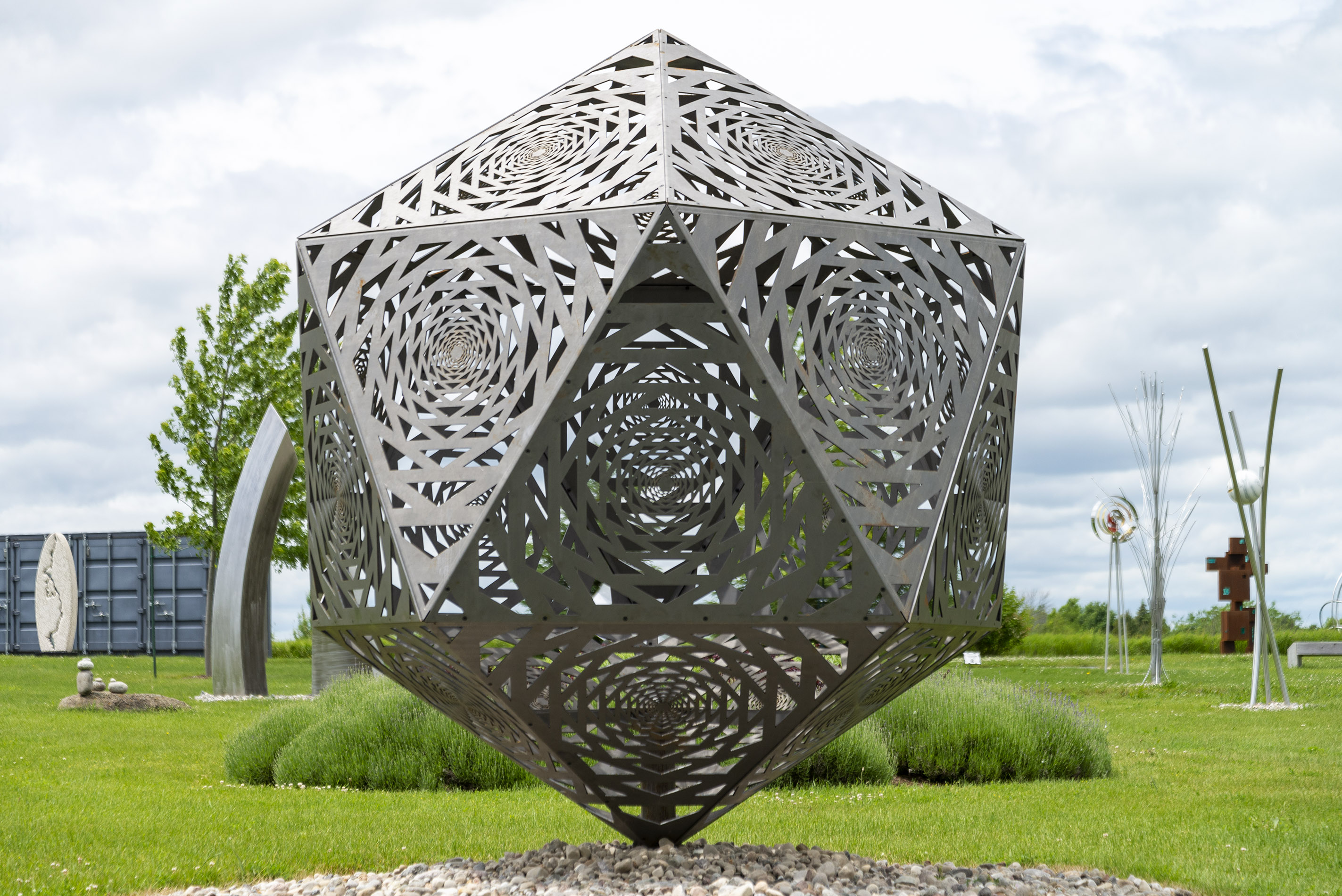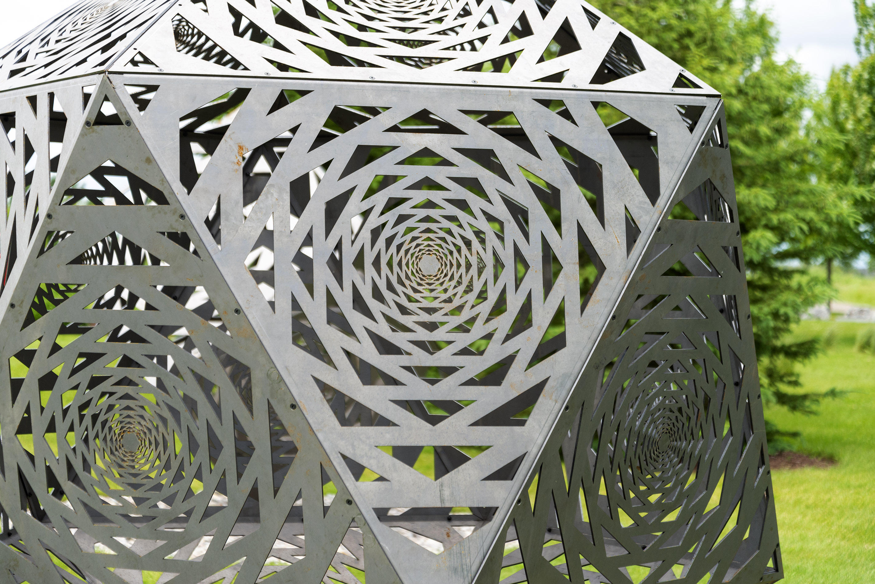 A collaborative project, artist Javid Jah and fabricator Alex Akbari of Qube Inc. re-designed this series from a recent public art exhibition in downtown Toronto, which was exhibited in collaboration with Roger Mooking and Wyandot artist Catherine Tammaro.The dynamic geometric form of the three pieces—Terra, Aqua and Aero (the elements of earth, water and air) is inspired by the ideas of cosmology (the study of the universe) and sacred ancestral principles. Forged from steel, light shines through the intricately detailed pattern of perforations on the surface. Each individual sculpture can also be used as a wood burning or gas fire pit or modified to include LED lights for nighttime display.