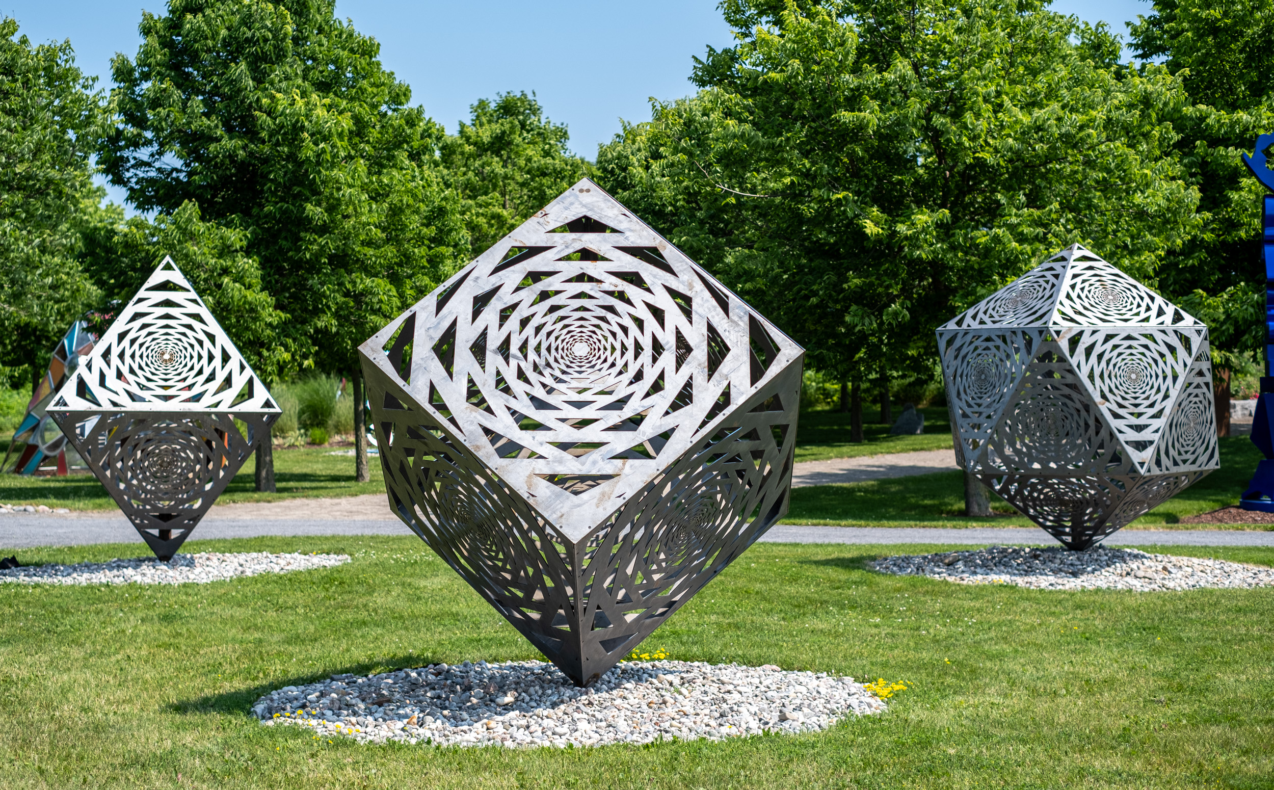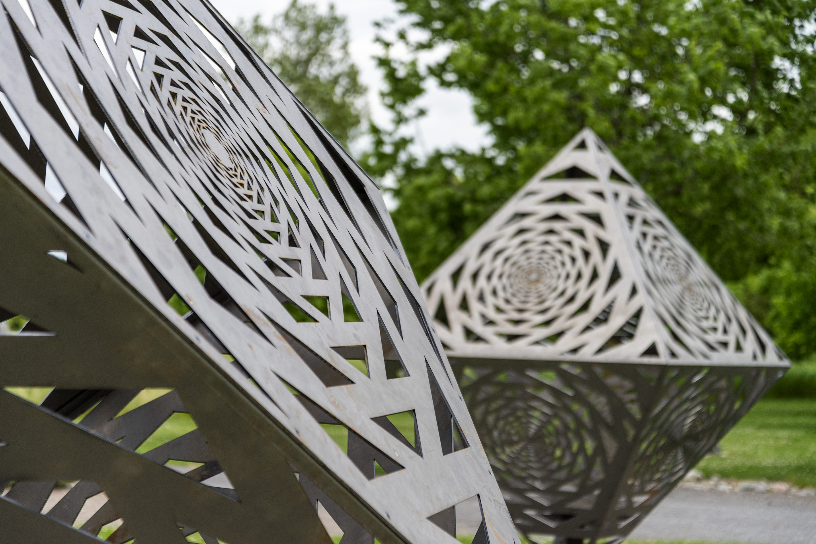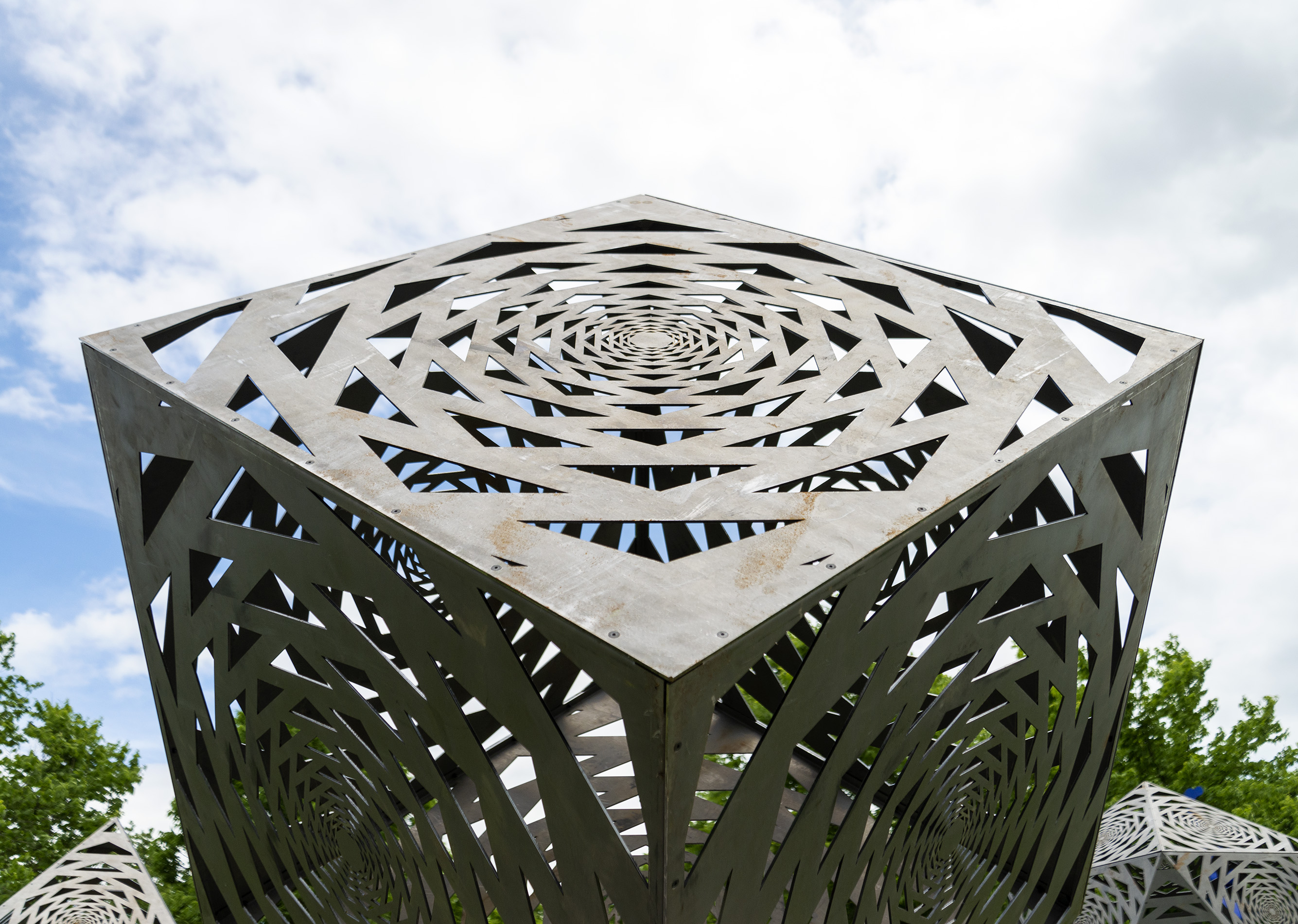 A collaborative project, artist Javid Jah and fabricator Alex Akbari of Qube Inc. re-designed this series from a recent public art exhibition in downtown Toronto, which was exhibited in collaboration with Roger Mooking and Wyandot artist Catherine Tammaro.The dynamic geometric form of the three pieces—Terra, Aqua and Aero (the elements of earth, water and air) is inspired by the ideas of cosmology (the study of the universe) and sacred ancestral principles. Forged from steel, light shines through the intricately detailed pattern of perforations on the surface. Each individual sculpture can also be used as a wood burning or gas fire pit or modified to include LED lights for nighttime display.