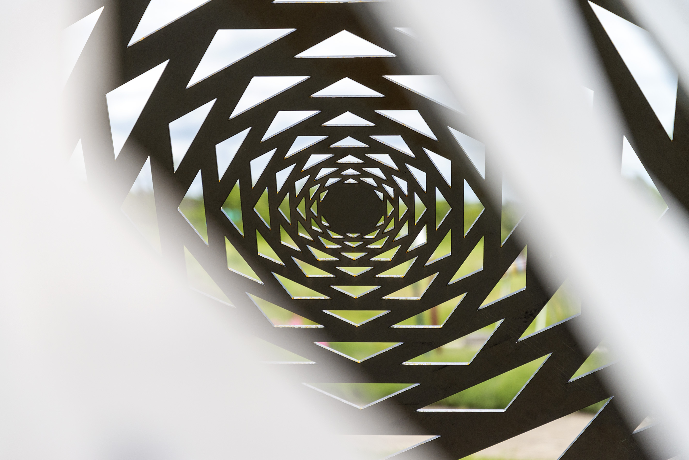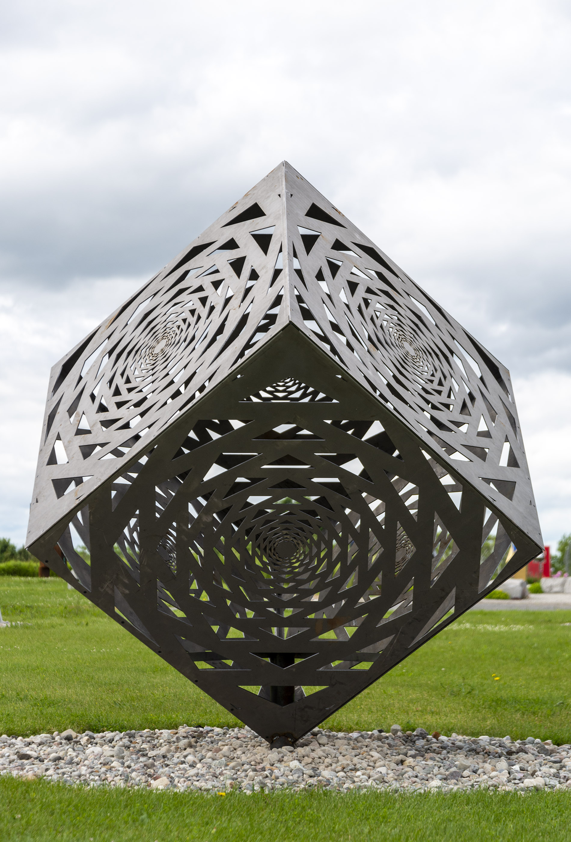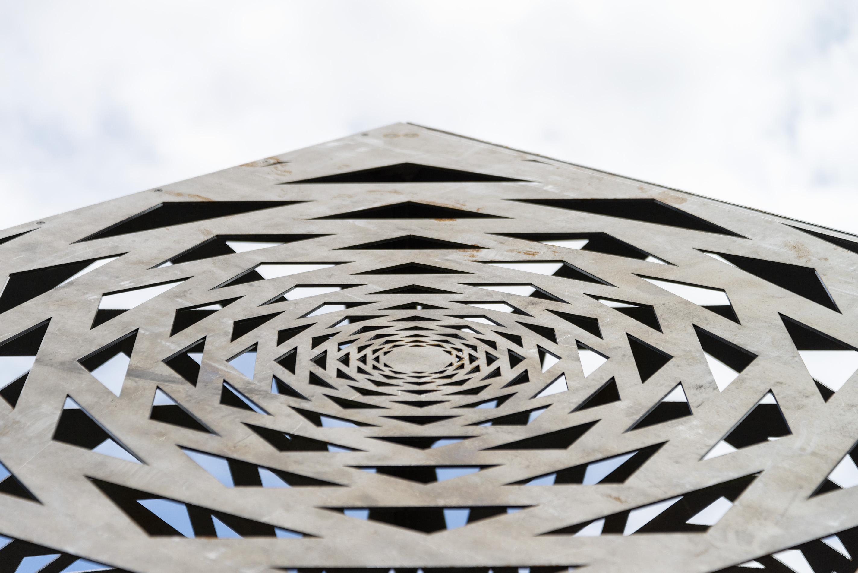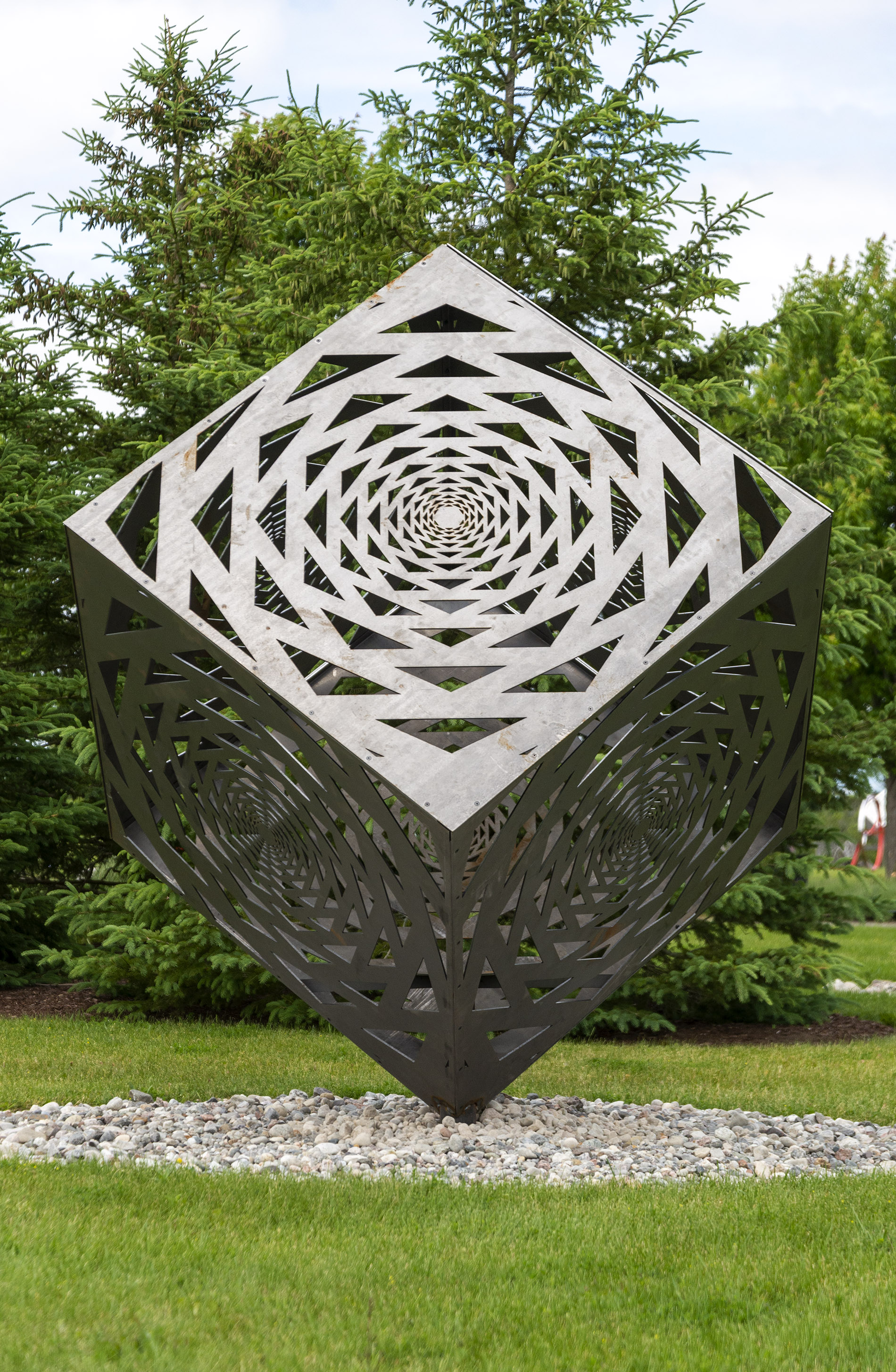 A collaborative project, artist Javid Jah and fabricator Alex Akbari of Qube Inc. re-designed this series from a recent public art exhibition in downtown Toronto, which was exhibited in collaboration with Roger Mooking and Wyandot artist Catherine Tammaro.The dynamic geometric form of the three pieces—Terra, Aqua and Aero (the elements of earth, water and air) is inspired by the ideas of cosmology (the study of the universe) and sacred ancestral principles. Forged from steel, light shines through the intricately detailed pattern of perforations on the surface. Each individual sculpture can also be used as a wood burning or gas fire pit or modified to include LED lights for nighttime display.