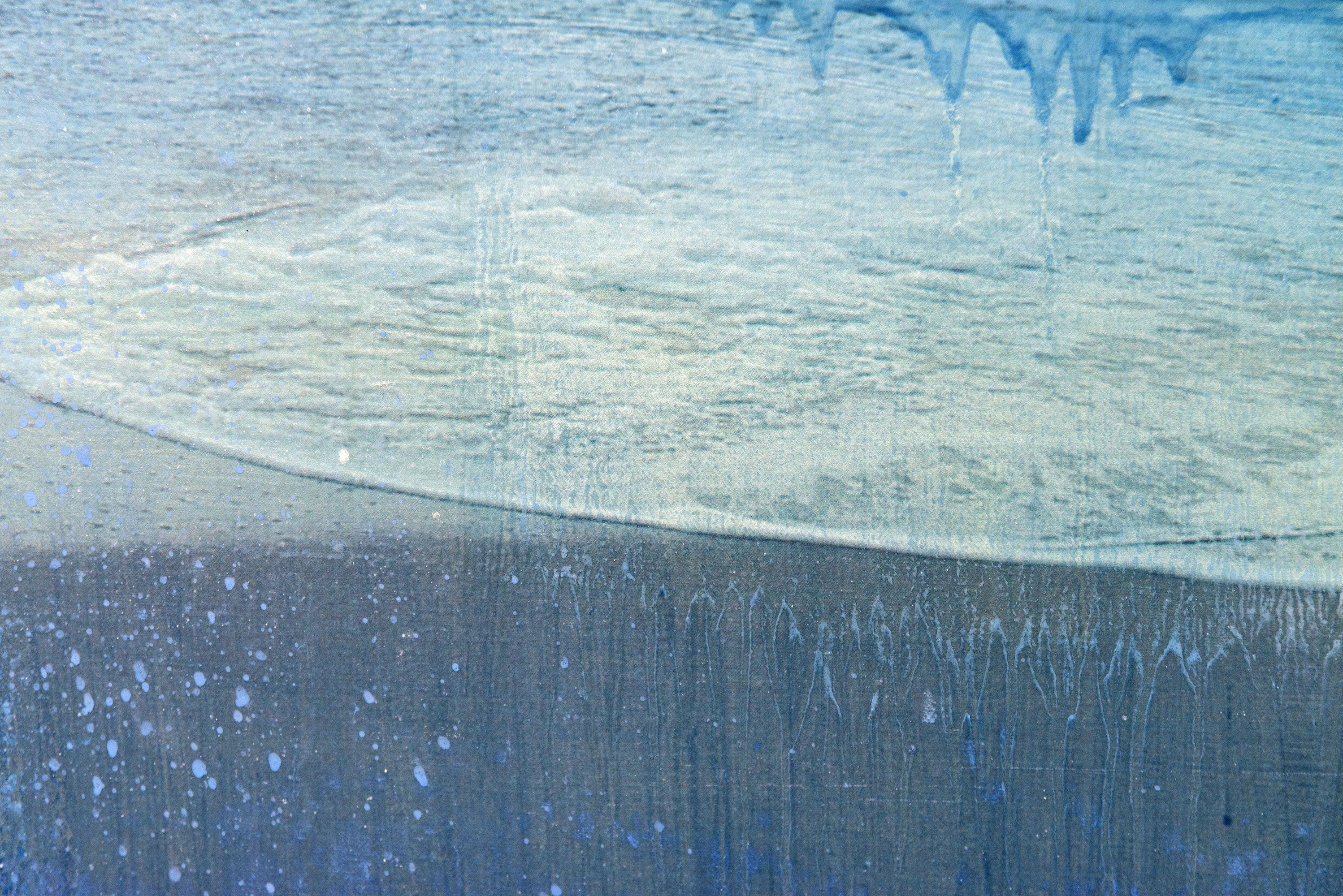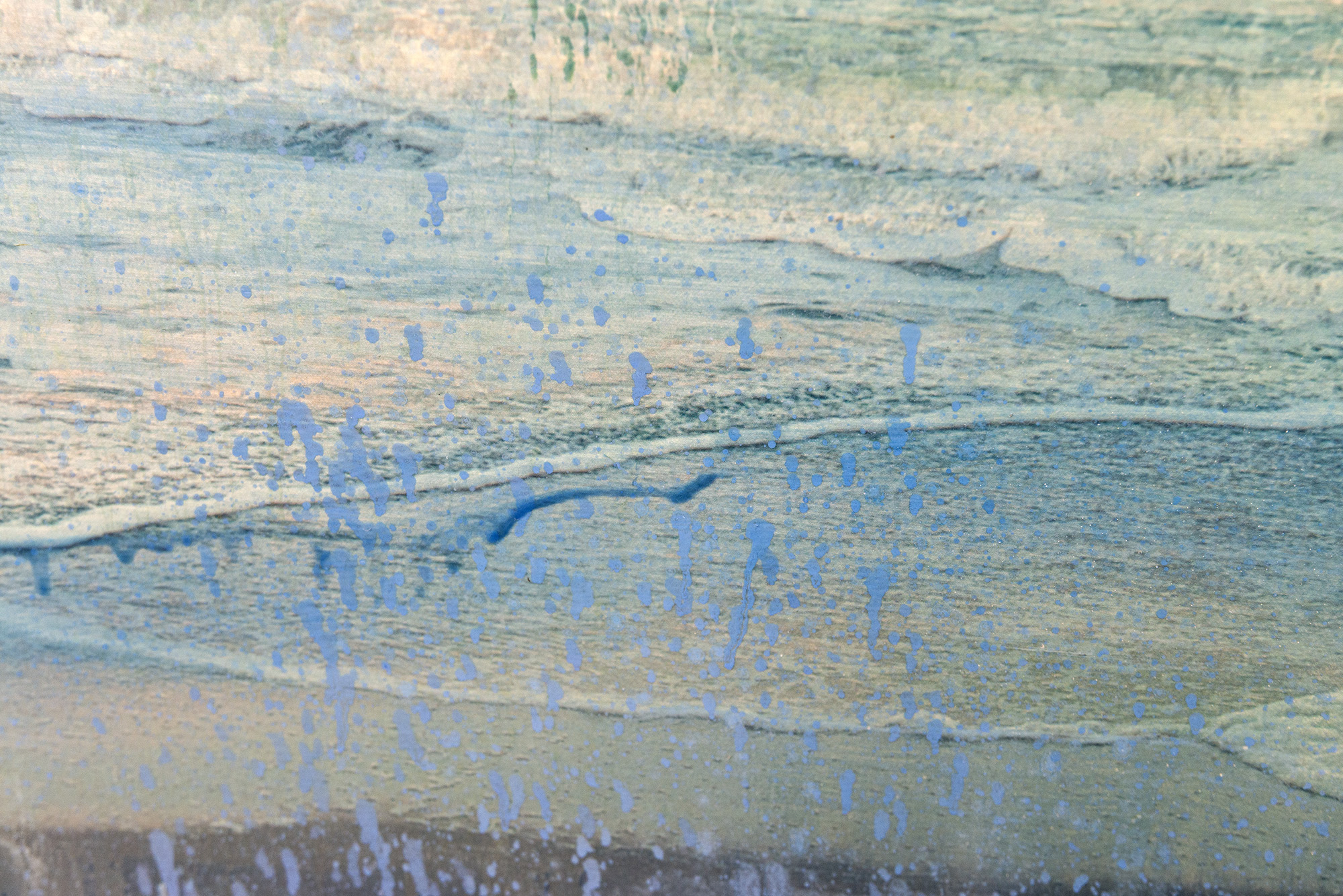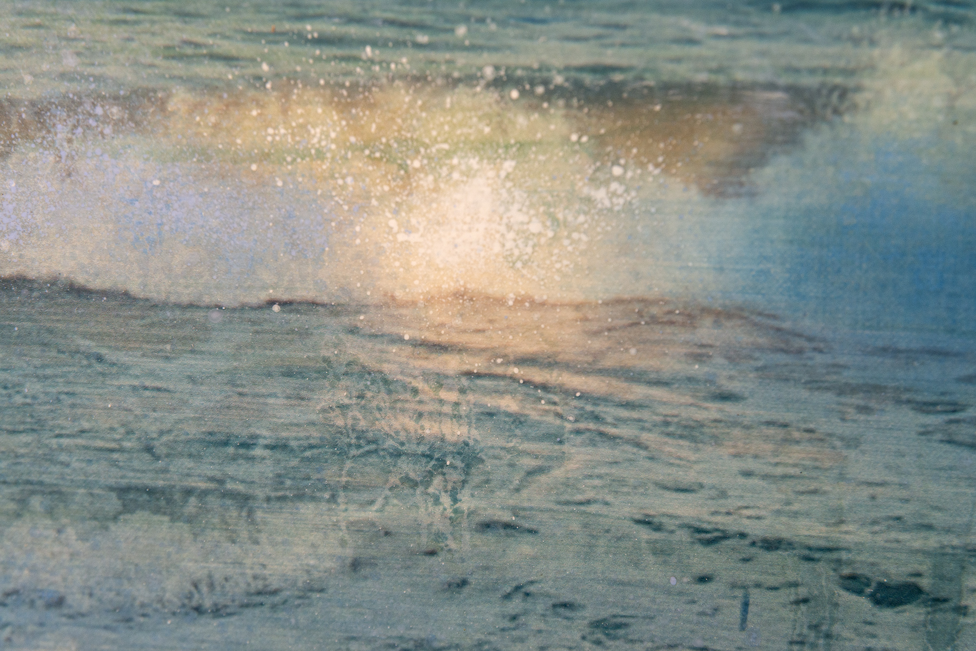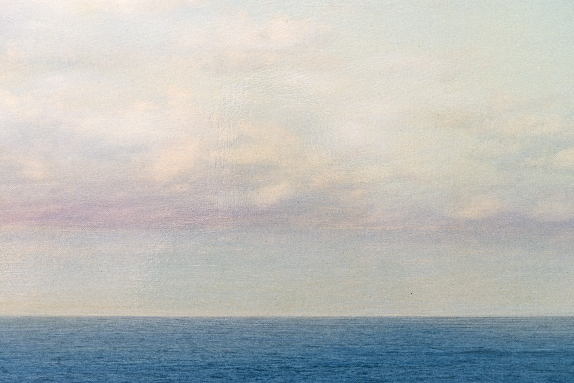 This large-scale oil painting of the mighty Atlantic Ocean is mesmerizing and so realistic that it looks like a photograph. Lahey often takes photographs to record significant detail, colour and form interpreted in his artwork. He is masterful at capturing the cool turquoise blue colour of the ocean and the sunlight as it plays off the waves as they roll in towards the beach. The image is built up with many layers—a characteristic of Lahey’s work and fine brushstrokes and drippings add to the realism. Looking out towards the defining line of the horizon, the cloud-filled sky is rendered in a soft palette of white and rosy pink.