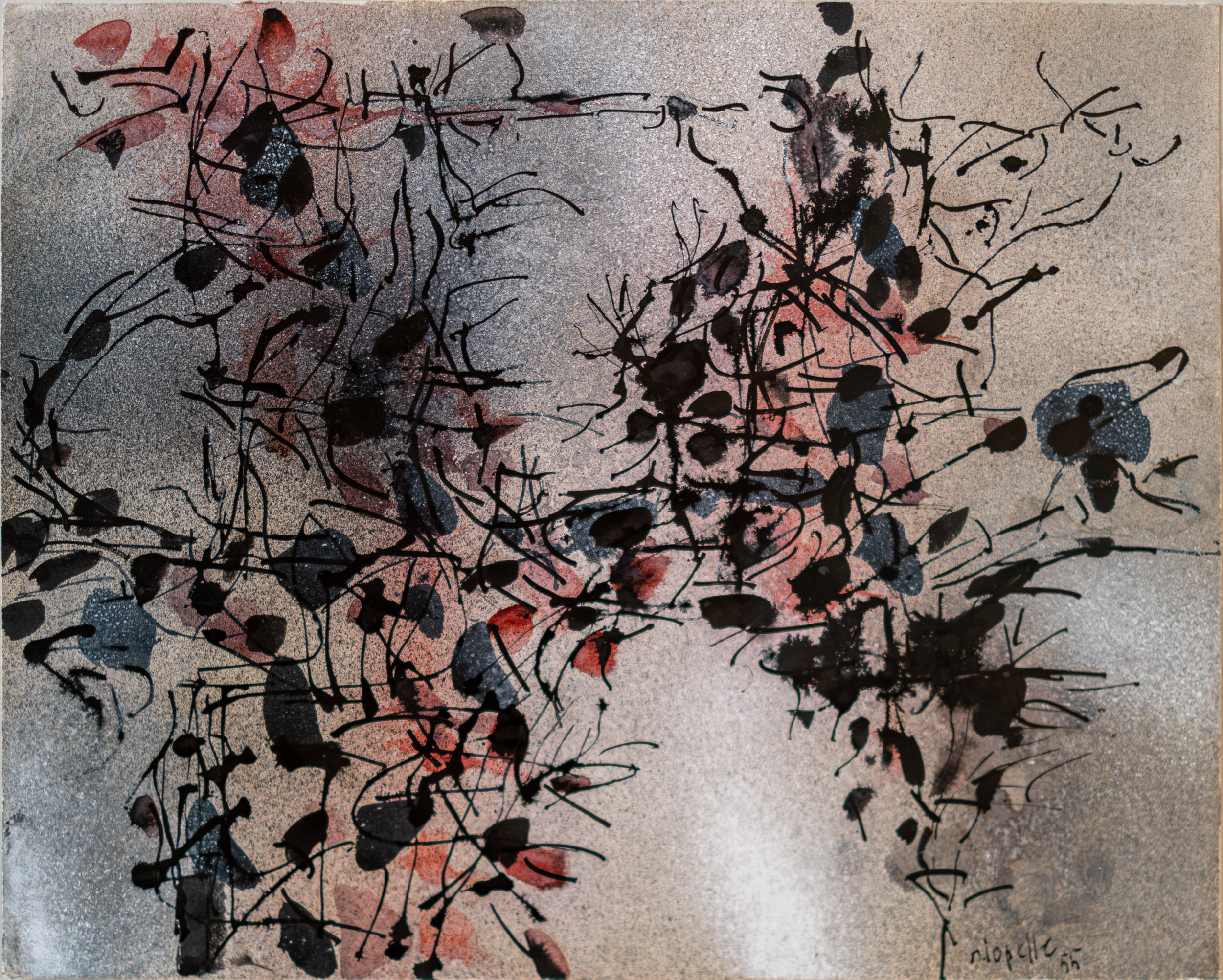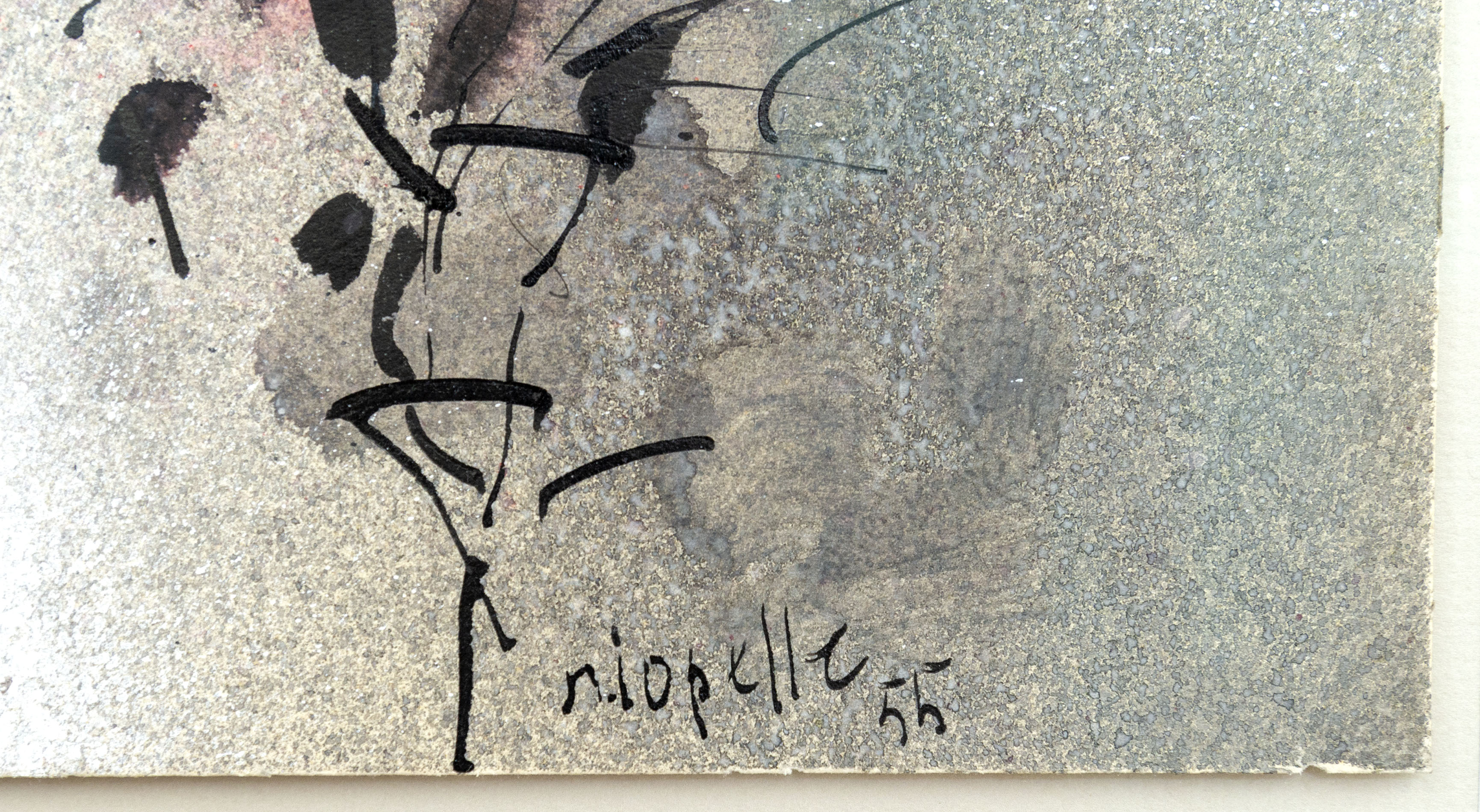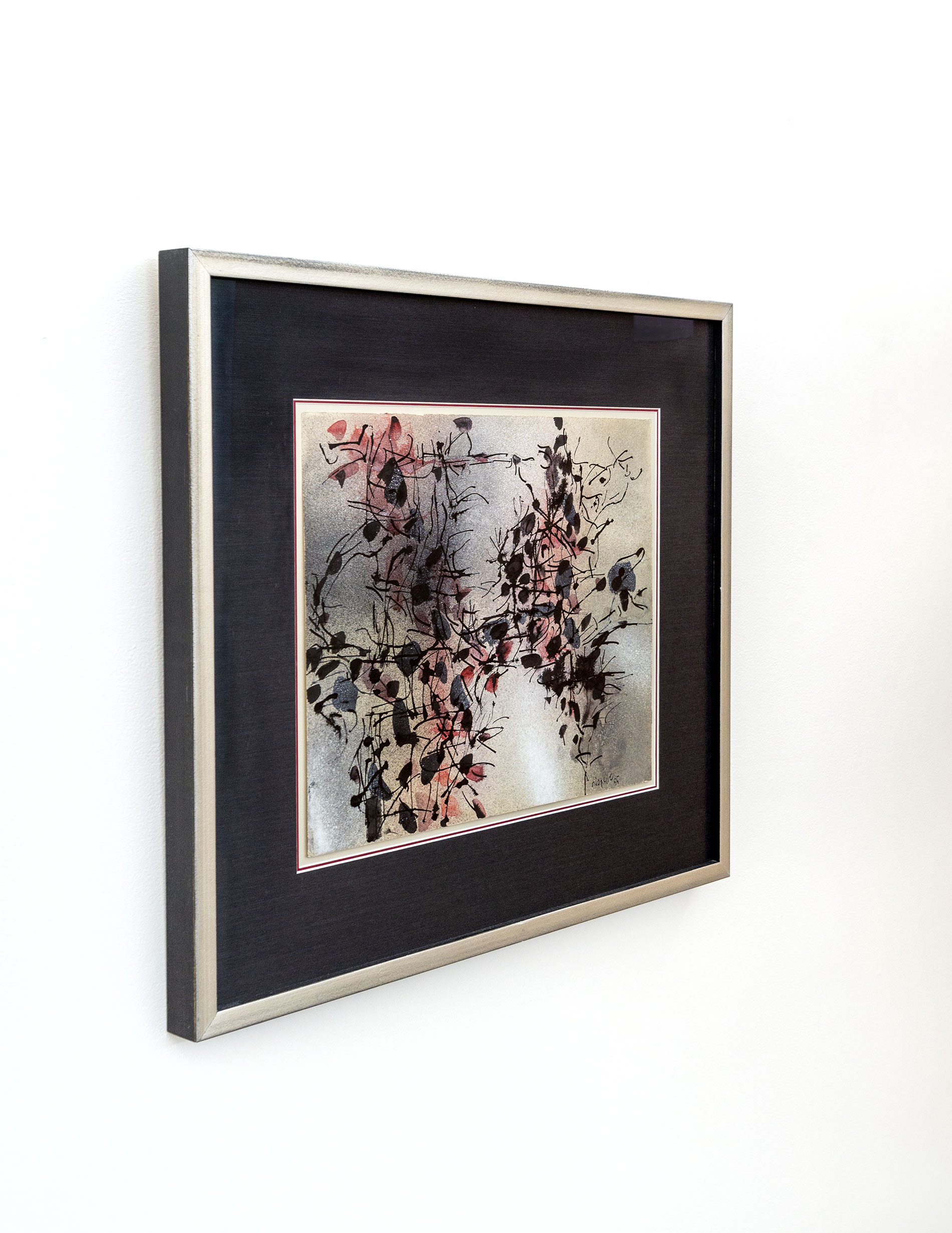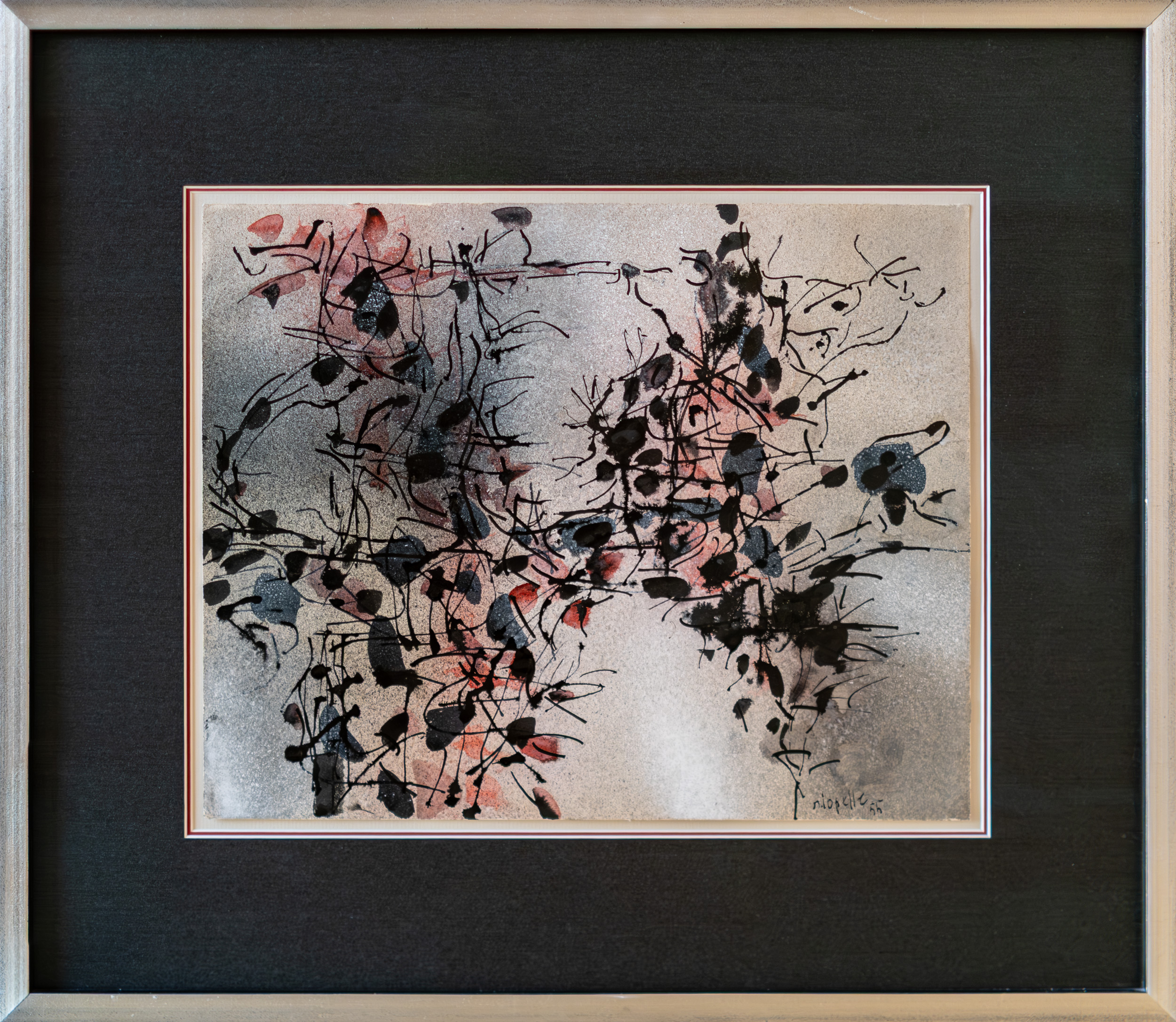 This unique abstract expressionist watercolor was painted by Jean-Paul Riopelle.This is a rare watercolor (gouache) by one of Canada’s most significant and influential artists of the twentieth century, Jean-Paul Riopelle. The Quebec-born artist had an international reputation as an innovative and superb abstract expressionist. This dynamic painting was one of his experiments with gouache created in Paris during the 1950s when he famously abandoned the paintbrush in favour of a palette knife. Delicate strokes of red, dark blue, and aubergine are dabbed onto the canvas, allowing for the neutral background to be exposed. Lyrical black markings—passages and long filaments were achieved by throwing the paint with a knife, a brush or from the paint tube directly onto the stretched canvas. Riopelle liked to finish a painting in one session, so he would typically pre-select his colors. He was an extraordinarily prolific artist who created more than 2,000 paintings in his lifetime.