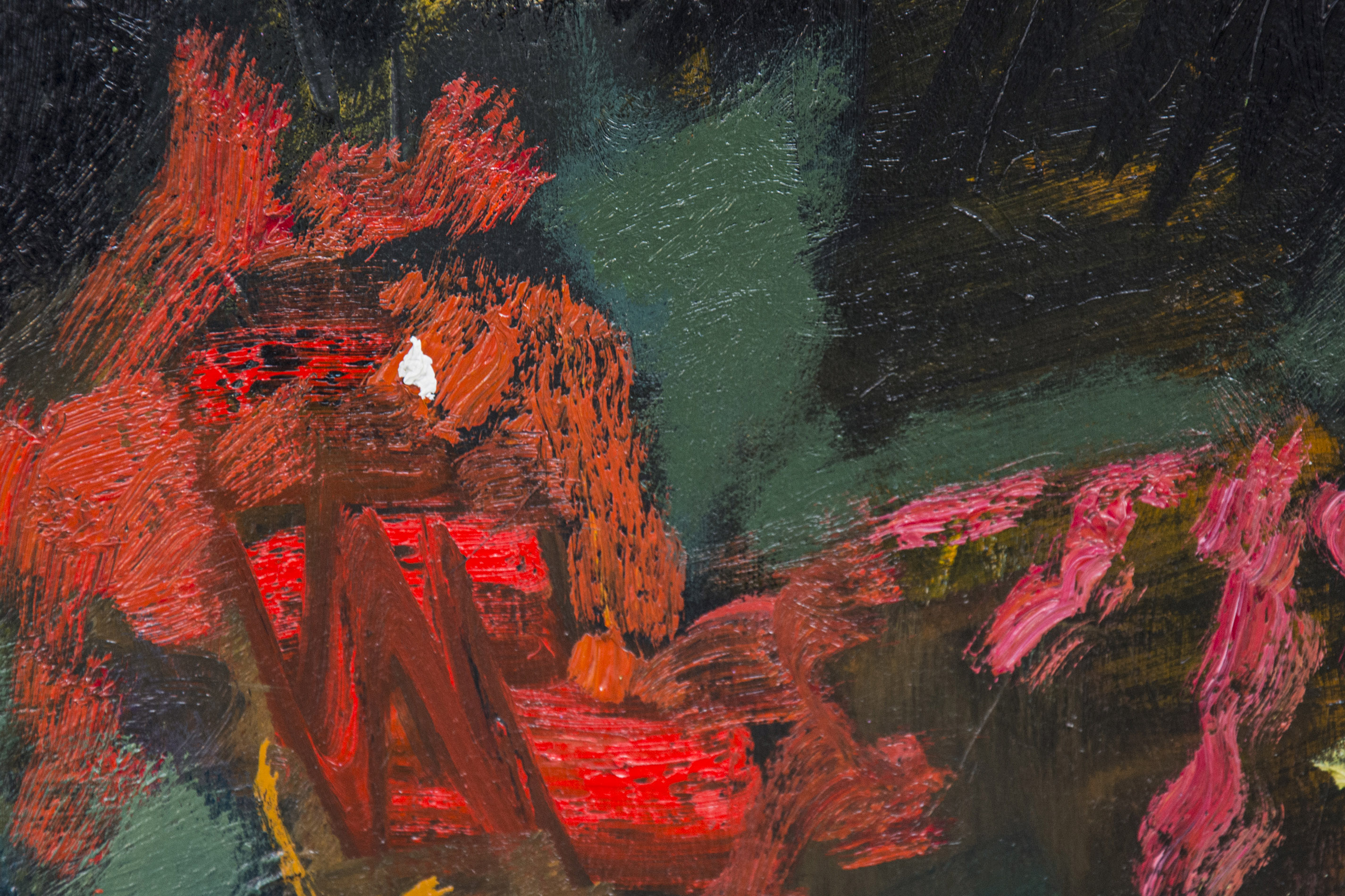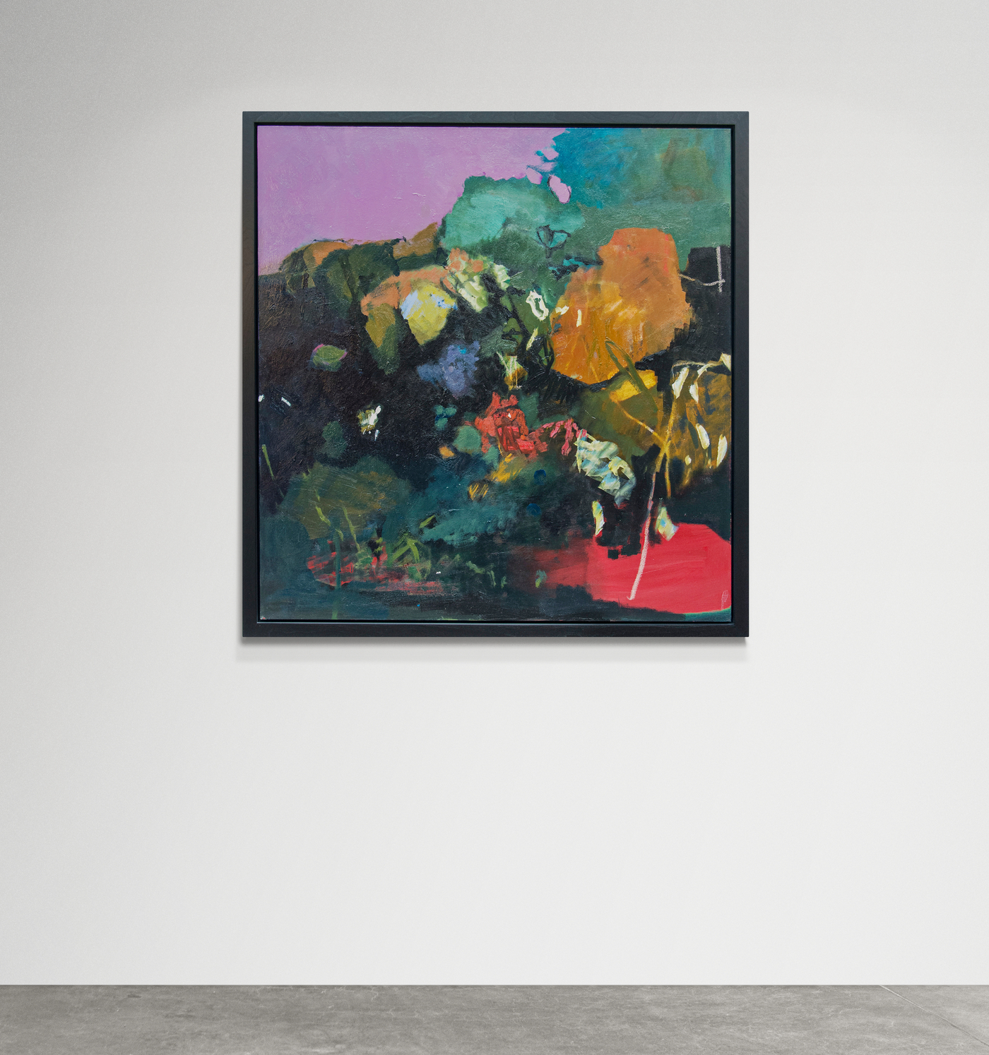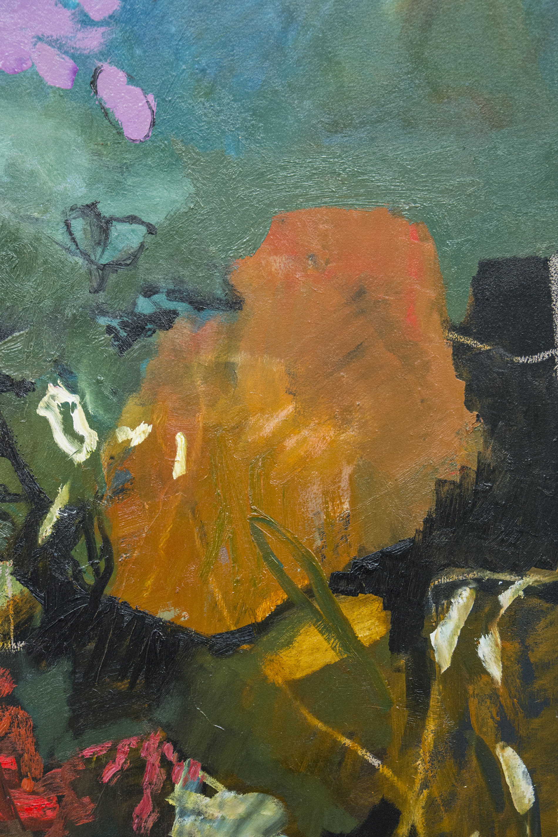 Expressive layered passages of bronze, periwinkle, red and turquoise with highlights of yellow are framed by dark green foliage in this rich oil on canvas. Poised between abstraction and garden landscape, the bold composition is balanced by a horizon and sky of muted pink.The vivid colors and flattened picture plane in Hornyak's paintings reveal the influence of the modern French Fauvist masters including Henri Matisse and Andre Derain. Dubbed "fauve" or wild beast by the media, these early 20th century painters were known for their potent colors and energetic brushwork. Equally, Hornyak's work takes inspiration from the German expressionist painters such as Ernst Ludwig Kirchner. Like Kirchner's expressive later work, Hornyak's canvases may remind us of the impermanence of existence.The flowers and foliage while beautiful are also a kind of momento mori, a testament to the human condition. Hornyak was born in England where she studied at the Grimsby School of Art before coming to Canada in 1961. In Canada, she continued her studies at McGill University, the Musee des beaux-arts de Montreal and the Centre Saidye Bronfman. Hornyak was invited to participate in the World Exhibition in Paris in 1987 along with Modigliani, Picasso and van Dongen. Her work has been exhibited throughout Europe and North America. Her portrait paintings were recently featured in a public exhibition in Montreal at the McClure Gallery for the Visual Arts. Hornyak's work is represented in many private and corporate collections. "We cannot reproduce nature, nor should we want to. All we can do is see and feel, and aim to transcend ourselves." Jennifer Hornyak