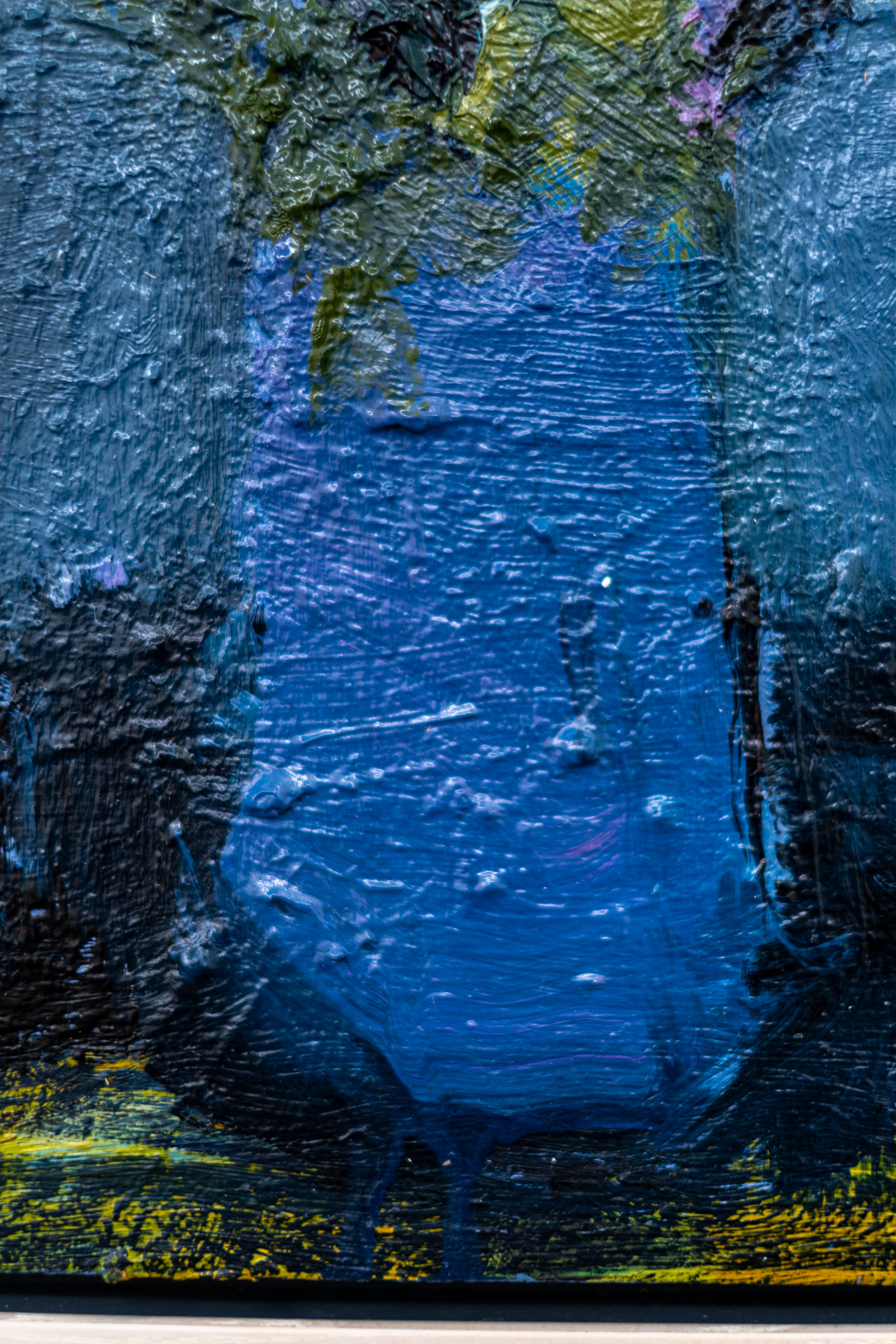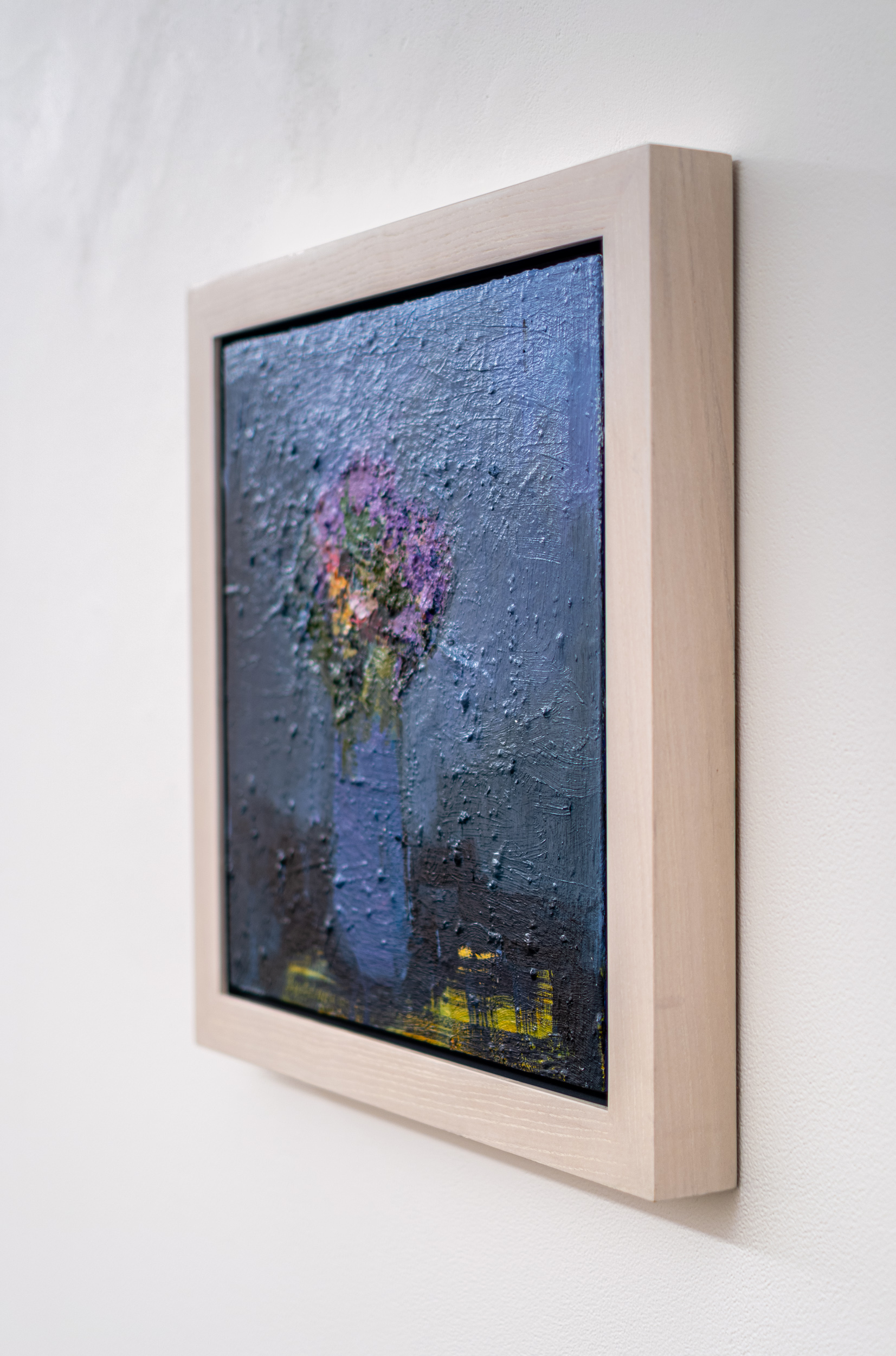 This abstract oil painting of flowers is by Jennifer Hornyak.A beloved and masterful artist, Canada’s Jennifer Hornyak has been painting for more than four decades. Her delightfully ethereal work lies somewhere between figuration and abstraction. In the past few years, much of her art has explored floral themes. But for Hornyak, flowers are not ‘just flowers’—they are metaphors for life. This elegant painting of a vase of flowers is rendered in a rich curated selection of deep blues, purples, and mauves with pops of orange, pink and green. A fragment of a cloth in a yellow check is seen beneath the vase.