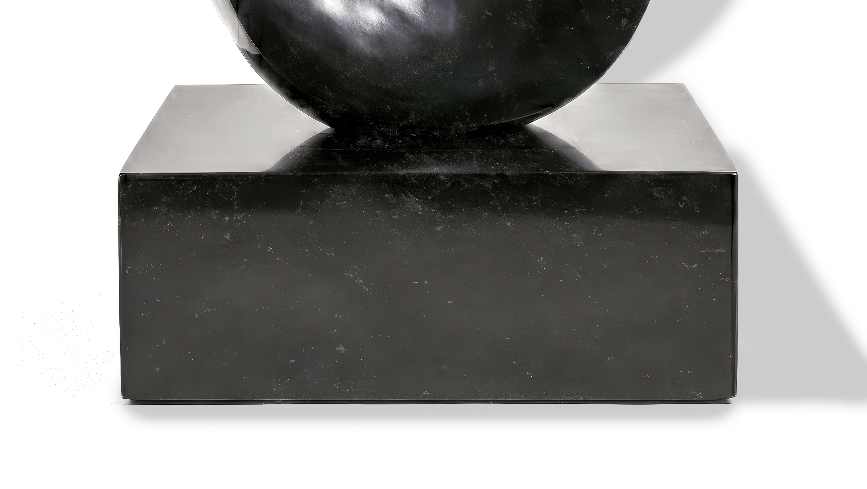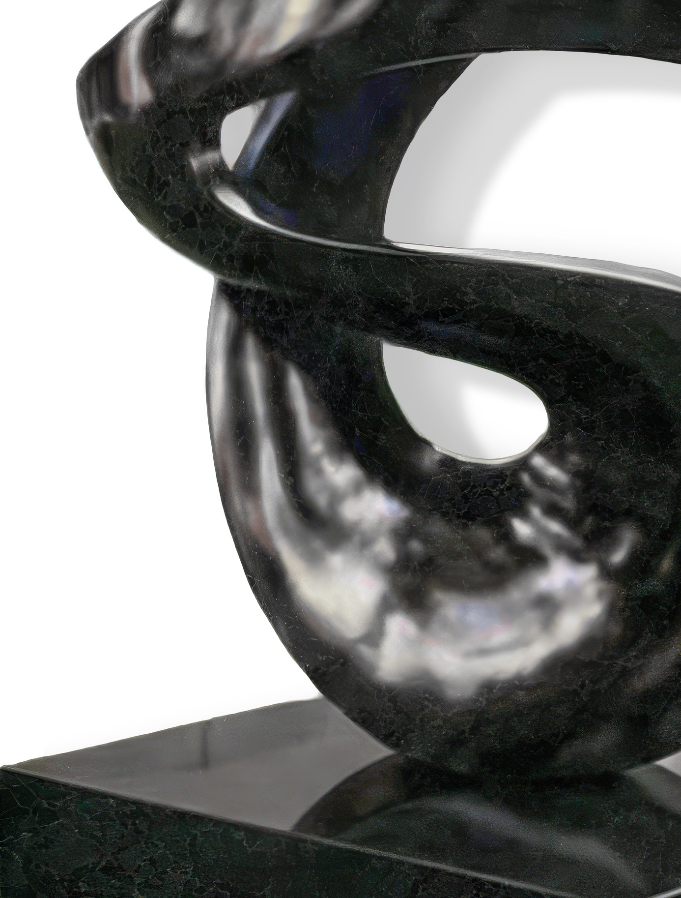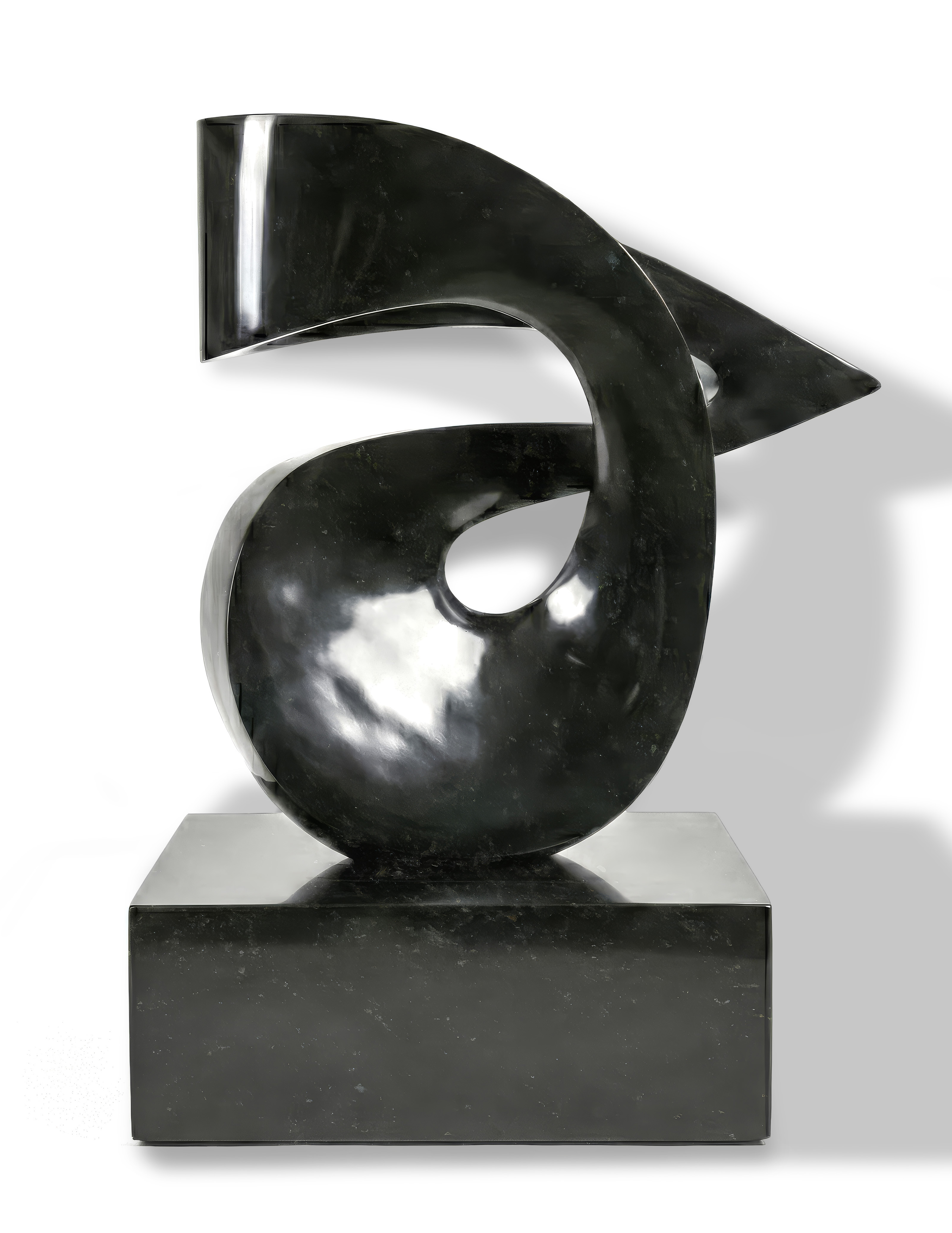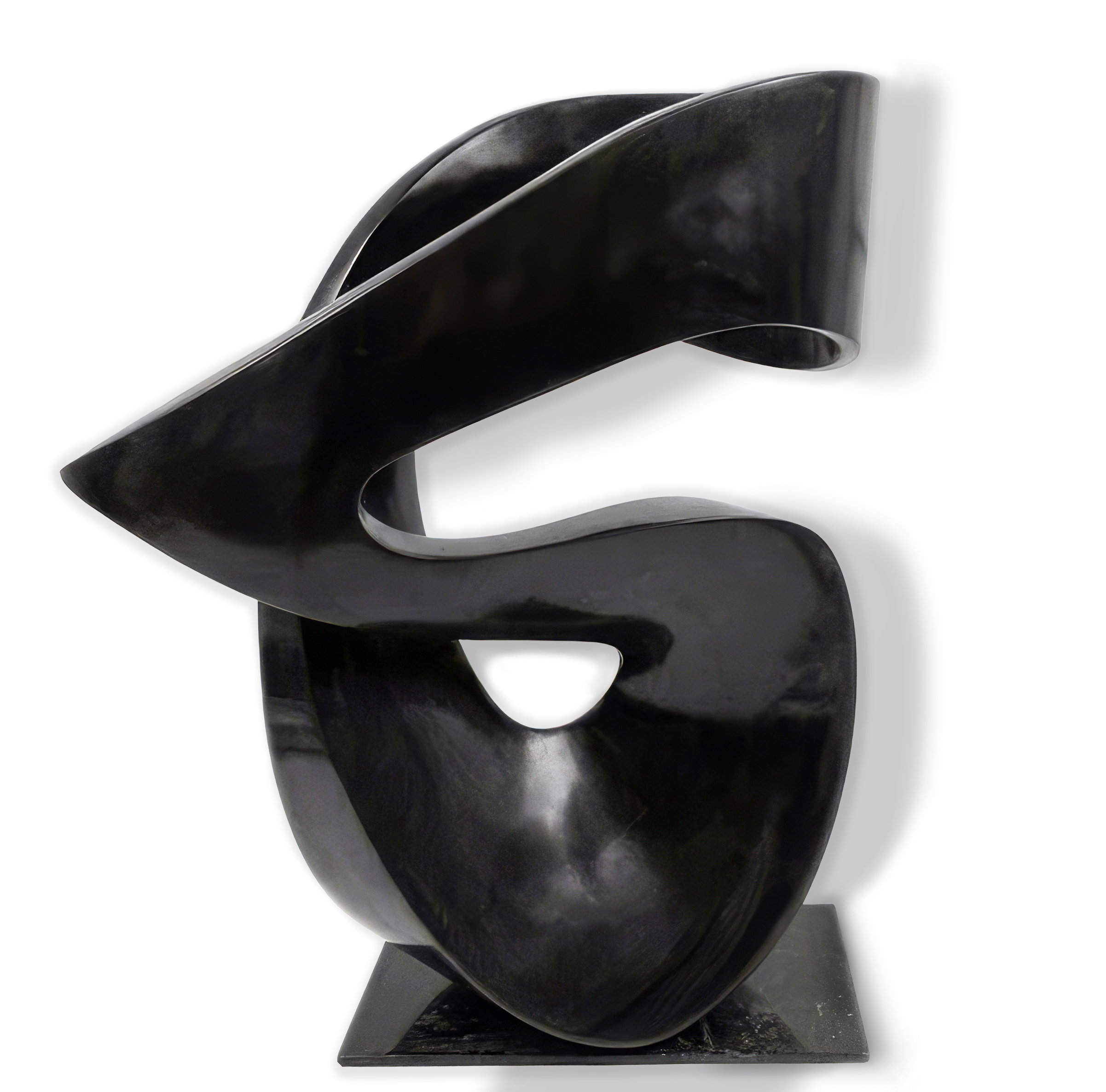 This contemporary abstract black stone sculpture is by Jeremy Guy.A full time sculptor for more than two decades, Jeremy Guy’s superb sculptural work has attracted international praise for its timeless design and fine craftsmanship. An early interest in science and philosophy helped shape Guy’s approach to art as he developed a true appreciation for the ‘natural forces that shape our world’. His design sensibility was also influenced by the modernist sculptural work of the famed British artists, Henry Moore and Barbara Hepworth. The elegant and poetic curves of Aura are handmade from engineered black granite. “Over many years I have developed an engineered stone composite material to enable my creative concepts and produce high quality, unique and accessible work. This material is a combination of crushed marble or black granite (Canadian ‘absolute black’ granite) mixed with a resin.”