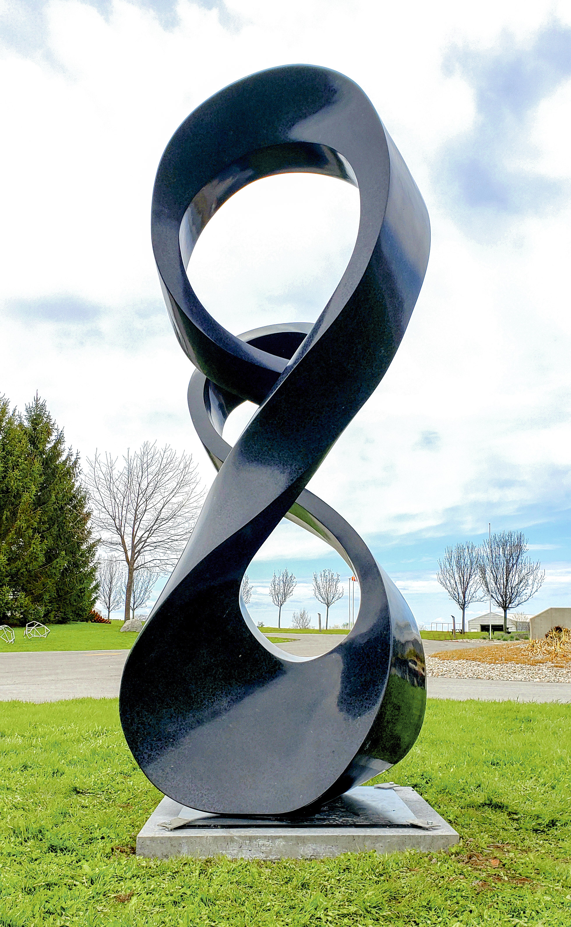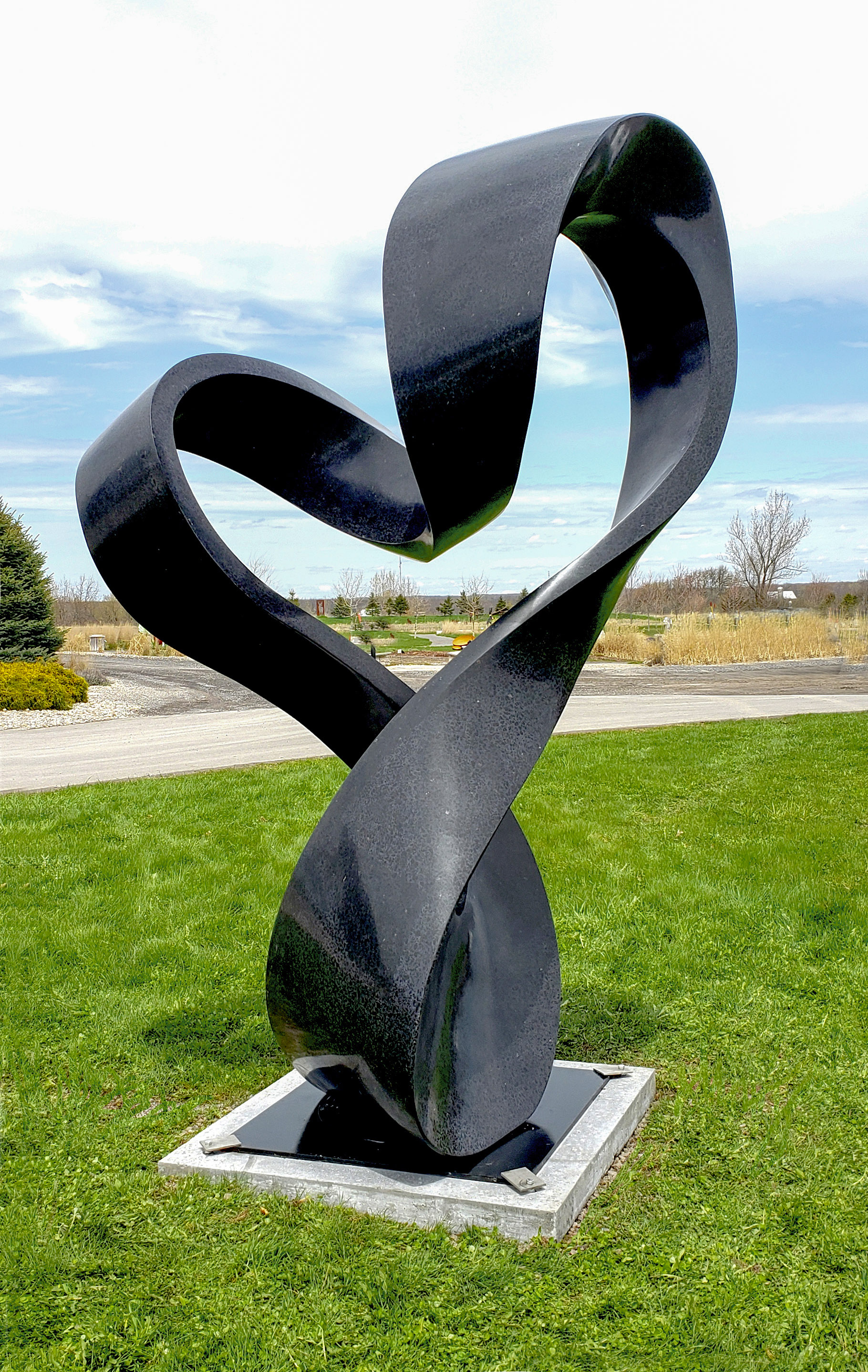 Smooth black granite has been engineered to resemble a treble clef in this elegant outdoor sculpture by Canadian artist Jeremy Guy. An overture is a musical composition, usually the orchestral introduction to a musical."In my own abstract work, I am acutely aware that nature champions great design. From the shaping of a beach pebble through years of tidal and elemental erosion to the myriad forms found in biology, I am often awestruck.” Jeremy Guy