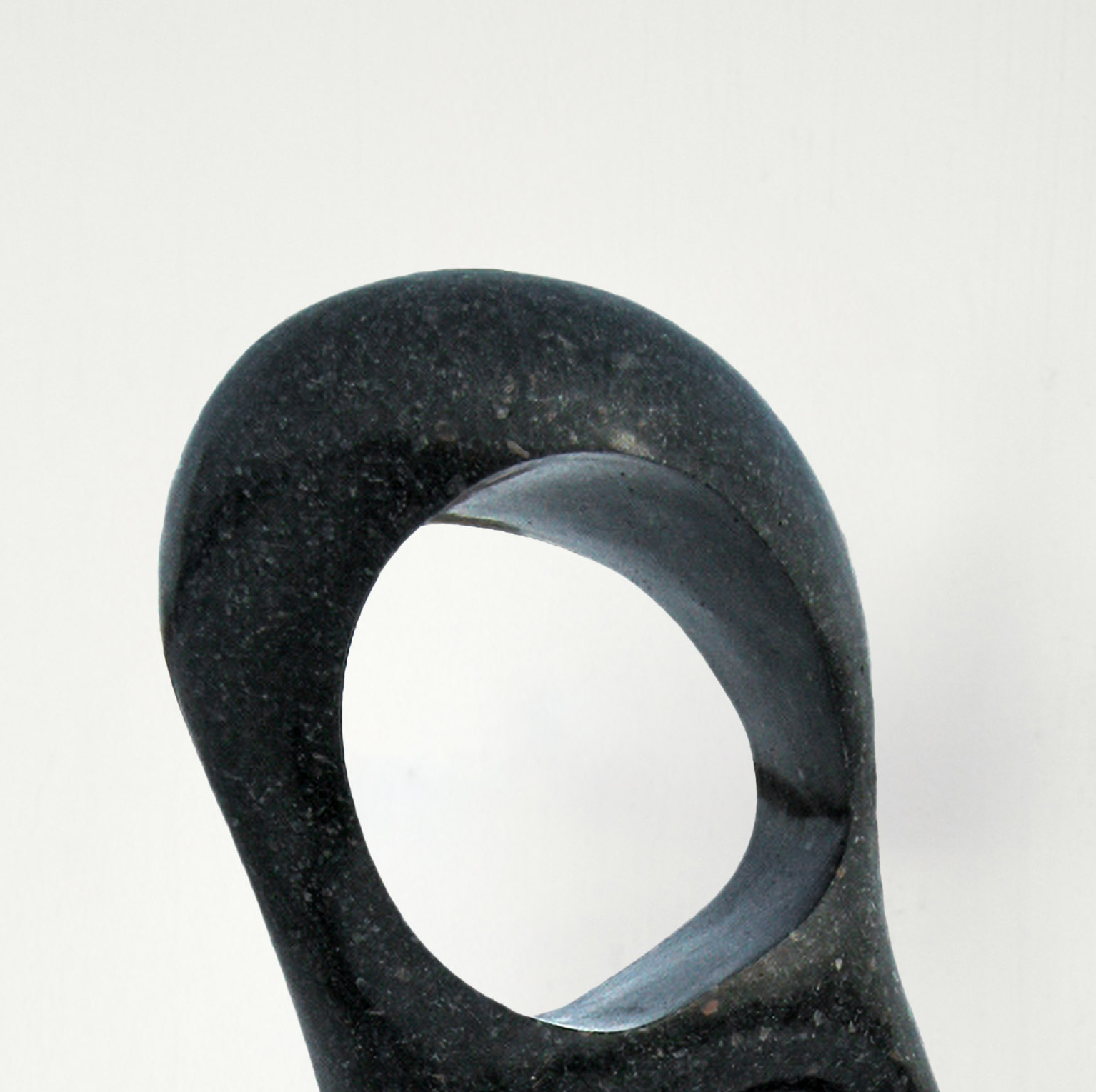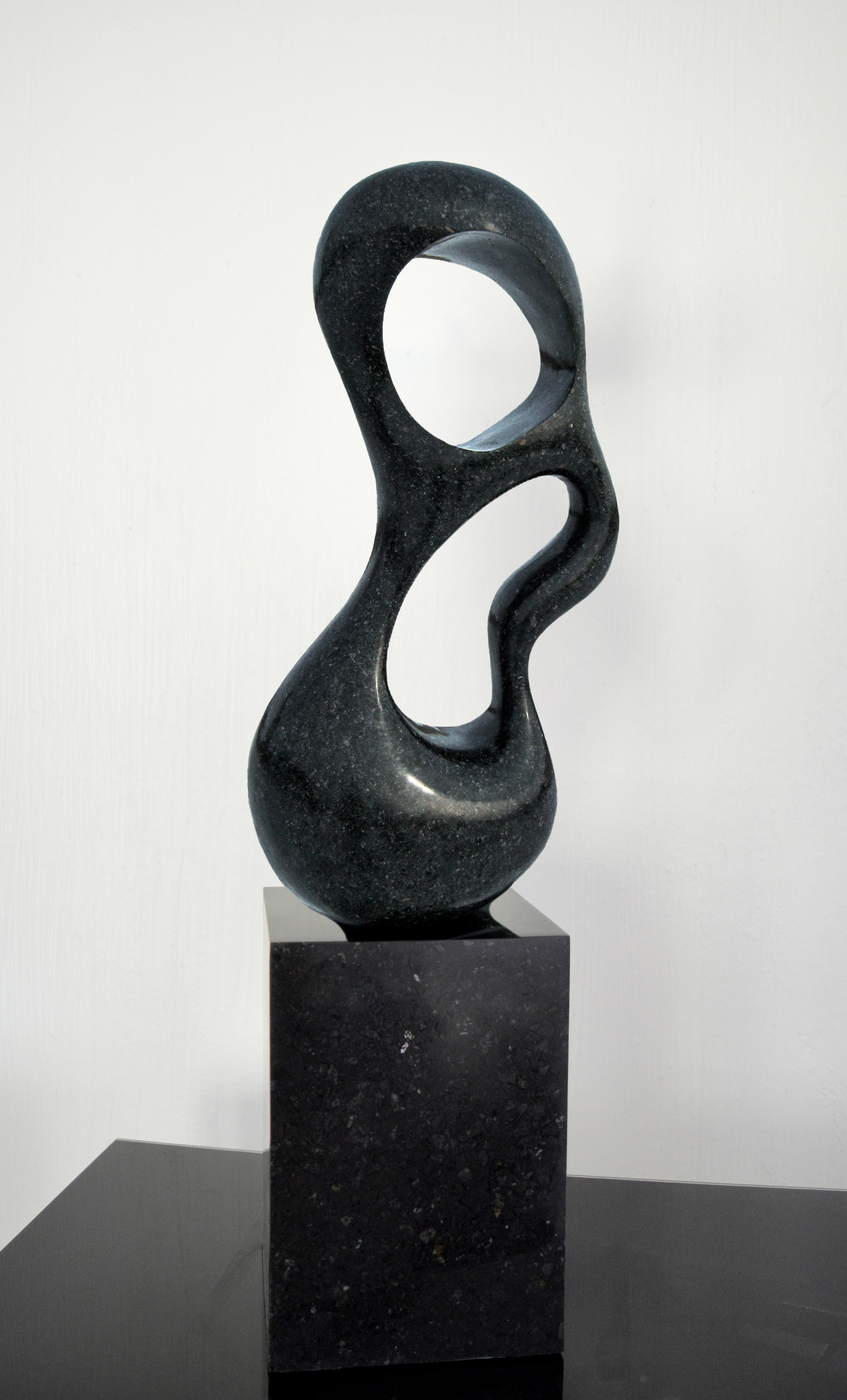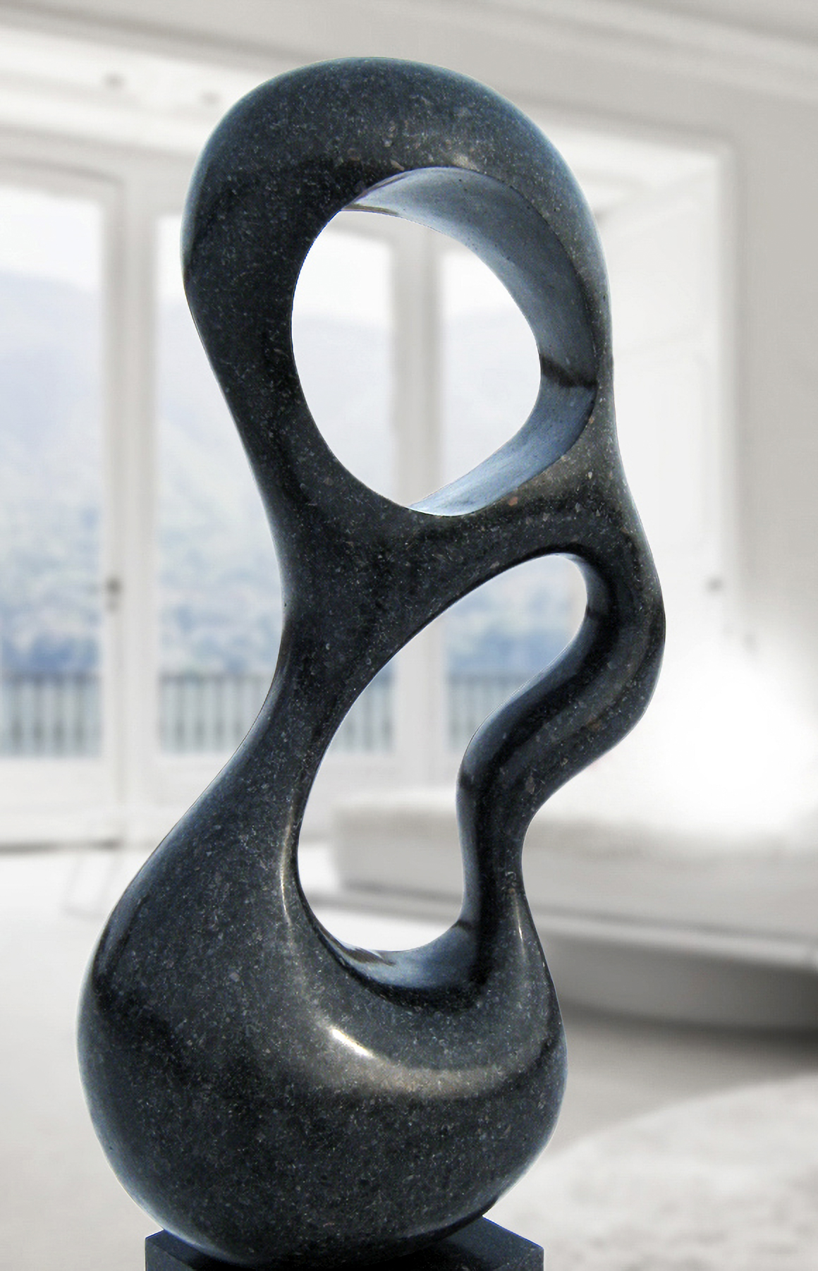 This contemporary abstract indoor sculpture is made from granite by Jeremy Guy.The elegance of this Canadian artist’s design is elevated by the use of a piece of rich black granite engineered to create this sculpture. Jeremy Guy’s masterful work reflects his reverence for organic, natural shapes. The stone’s surface is highly polished to a smooth finish. Early in his career, Guy’s contemporary form and style were naturally inspired by the work of famed British sculptors—Henry Moore and Barbara Hepworth.
