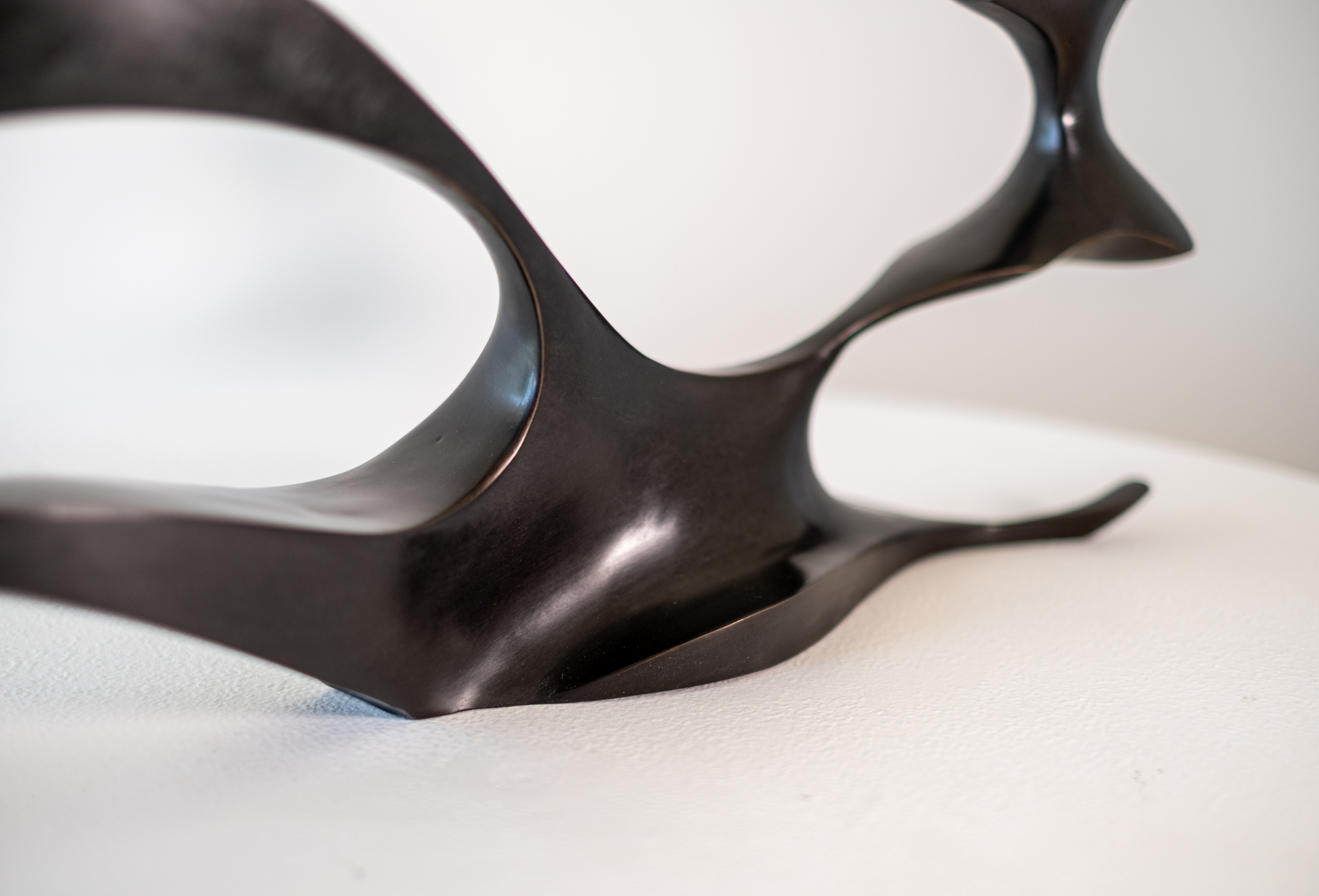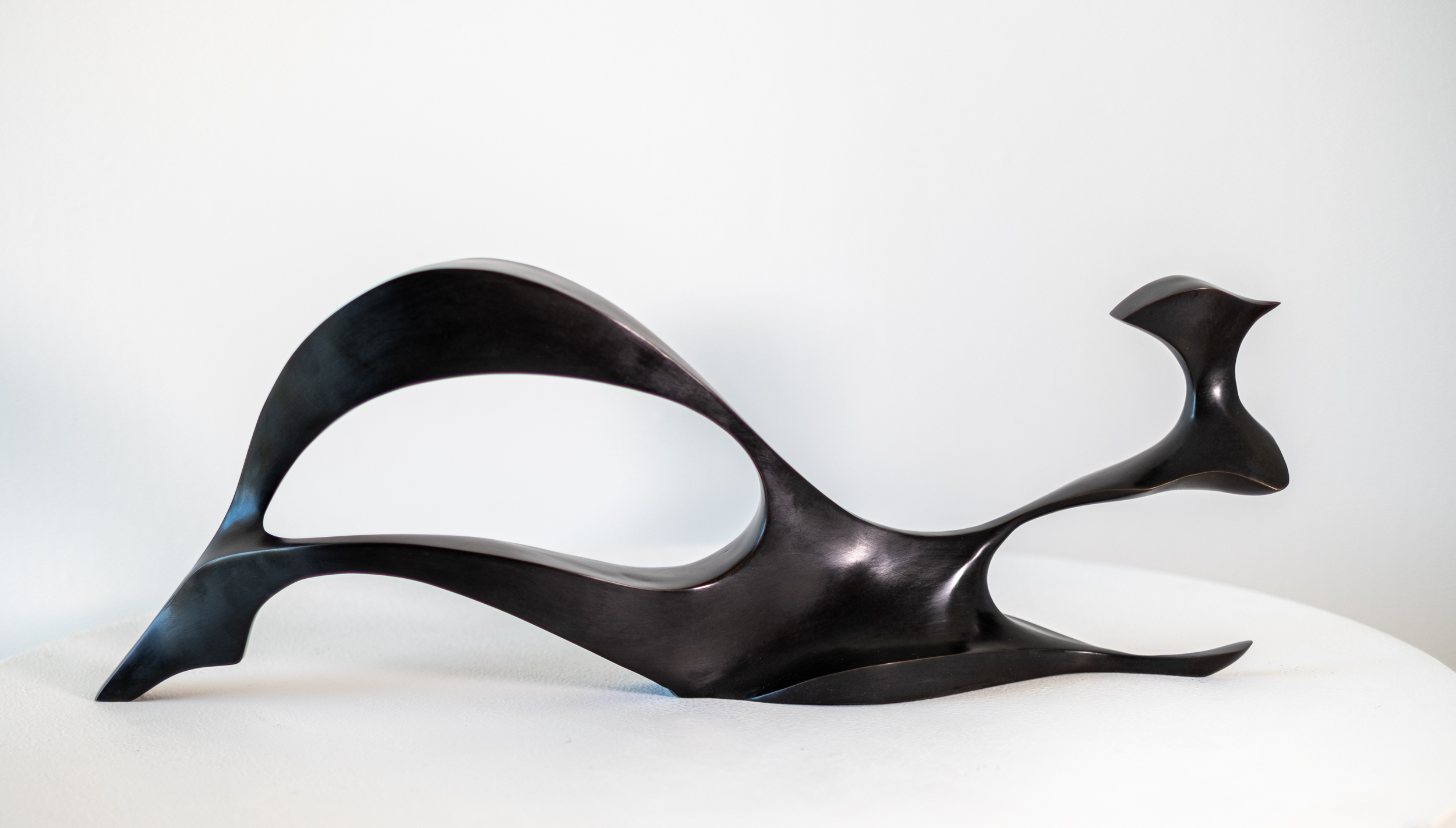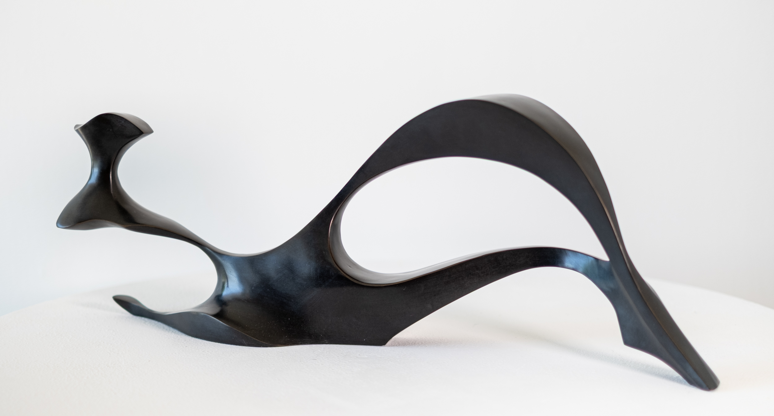 This abstract figurative indoor sculpture is made of bronze by Jeremy Guy.The elegant sculptural work of Jeremy Guy has garnered him an impressive international following. He is known for his timeless designs, often inspired by a love of the simplicity of mid-century design. Shimmer is one of the sculptures in his figurative series. Hand forged from bronze, the lyrical lines of this piece emulate the form of a reclining human figure. This sculpture, in particular, was inspired by a classic black and white photograph of his mother taken in 1953 when she was only sixteen. She is posing on a rock in the ocean, and a big smile lights up her pretty face. The title of the sculpture came to Guy while he was working on it. He says, “ It began to take on the appearance of a distorted reflection, perhaps from the surface of rippled water or as seen through a heat haze.” The refined, highly polished finish of the sculpture reflects light and does, indeed, ‘shimmer.’