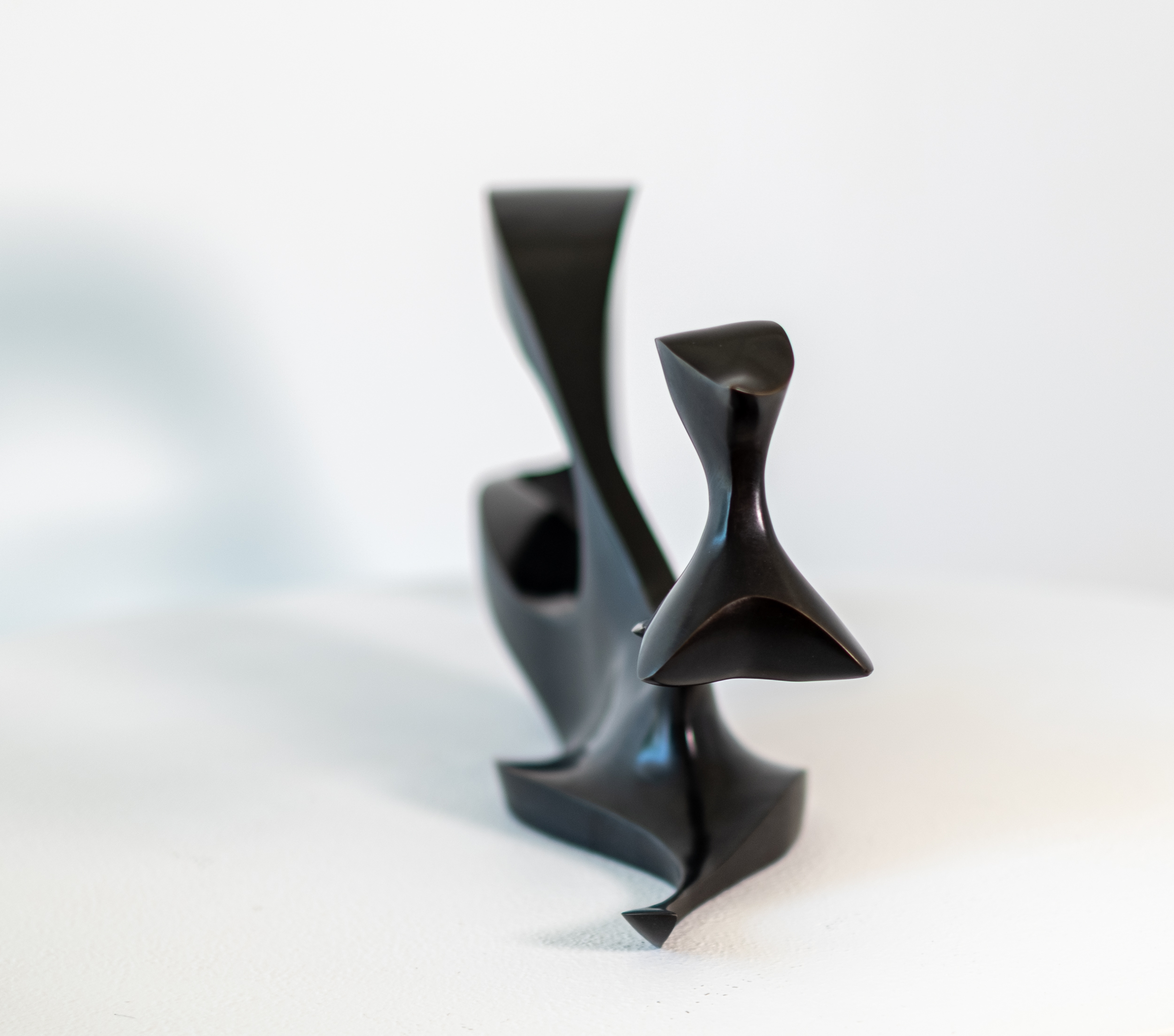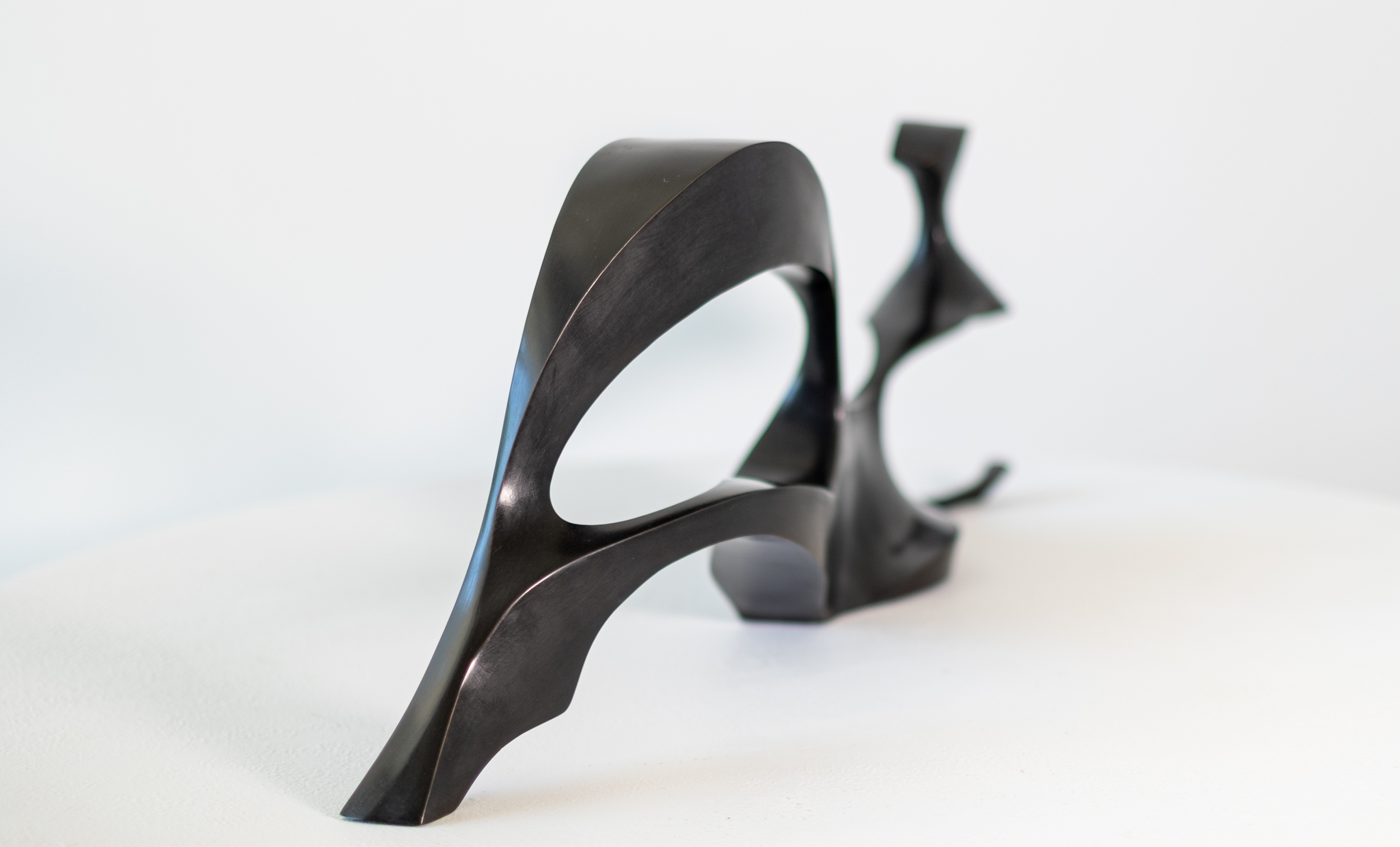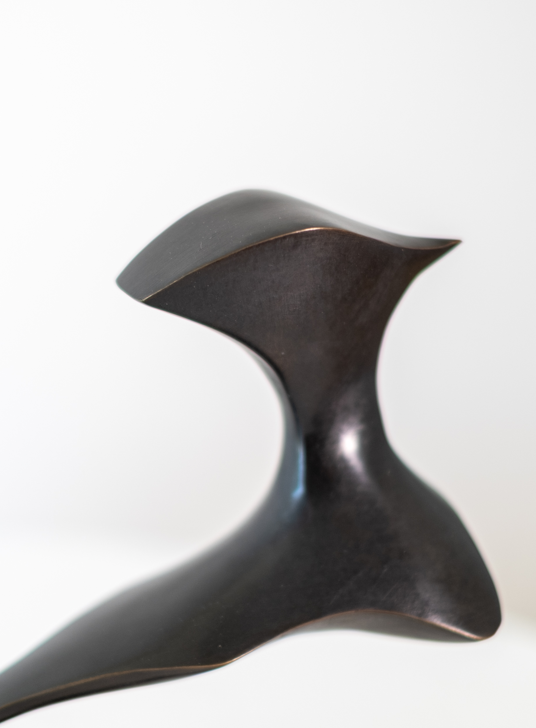 This abstract figurative indoor sculpture is made of bronze by Jeremy Guy.The elegant sculptural work of Jeremy Guy has garnered him an impressive international following. He is known for his timeless designs, often inspired by a love of the simplicity of mid-century design. Shimmer is one of the sculptures in his figurative series. Hand forged from bronze, the lyrical lines of this piece emulate the form of a reclining human figure. This sculpture, in particular, was inspired by a classic black and white photograph of his mother taken in 1953 when she was only sixteen. She is posing on a rock in the ocean, and a big smile lights up her pretty face. The title of the sculpture came to Guy while he was working on it. He says, “ It began to take on the appearance of a distorted reflection, perhaps from the surface of rippled water or as seen through a heat haze.” The refined, highly polished finish of the sculpture reflects light and does, indeed, ‘shimmer.’