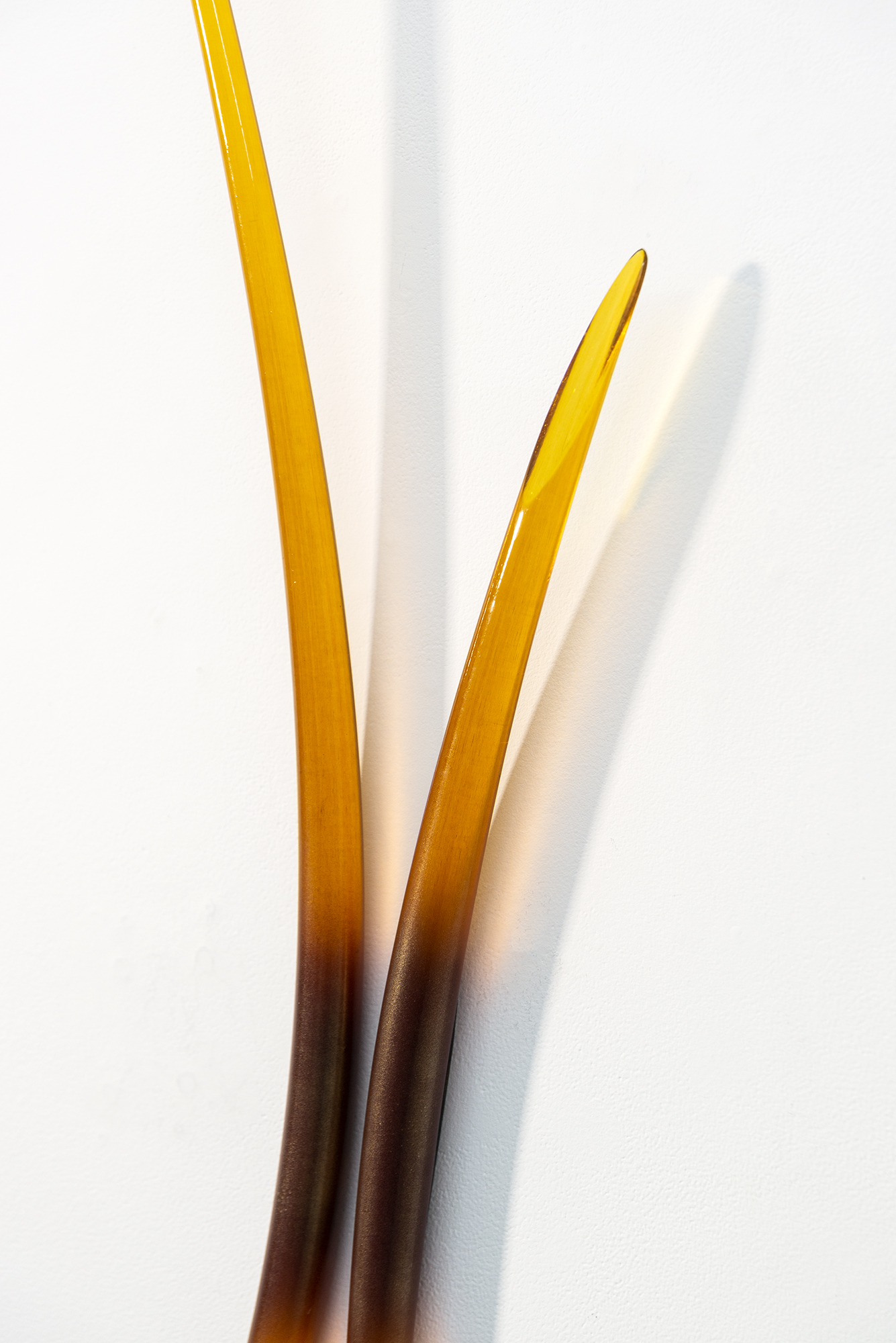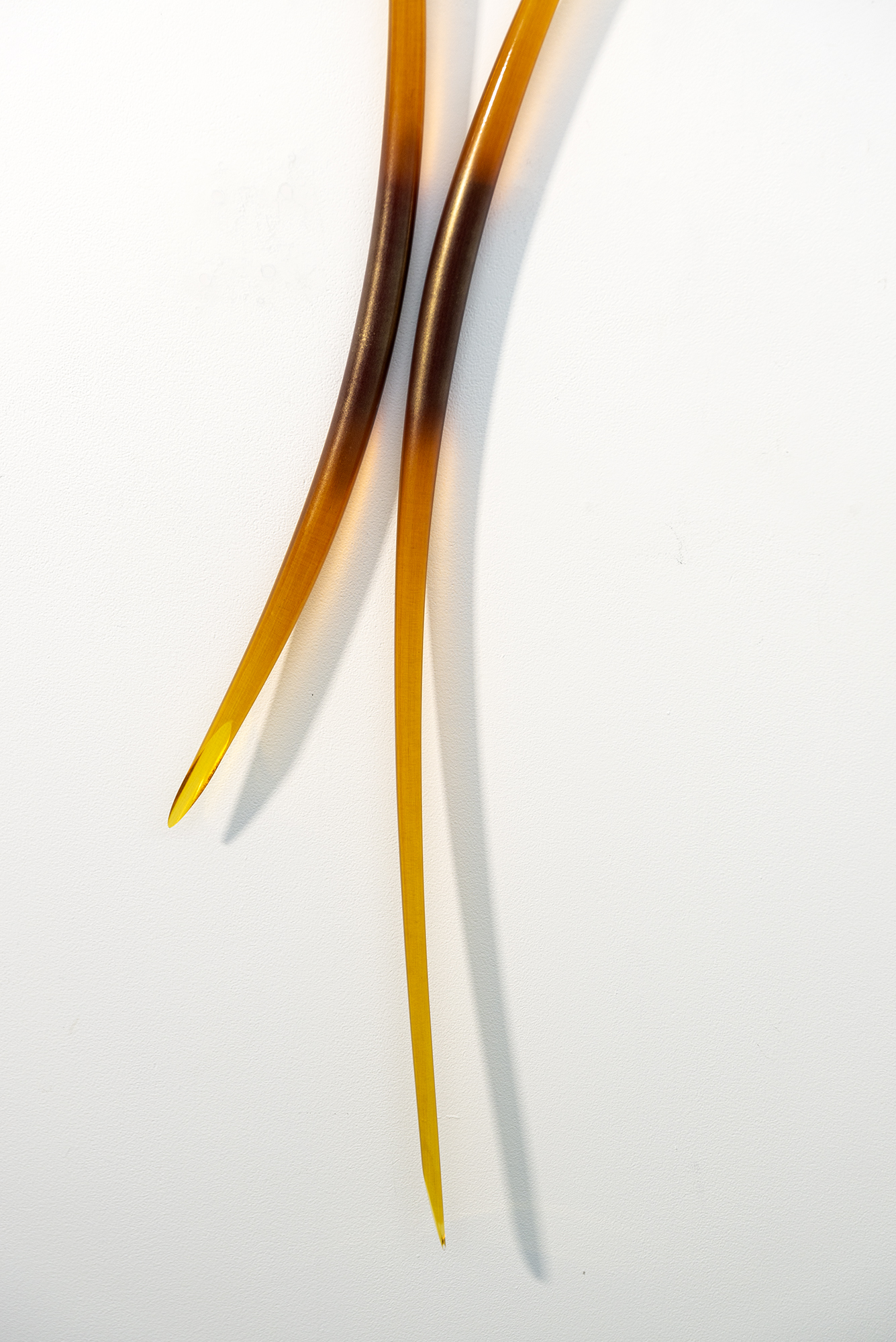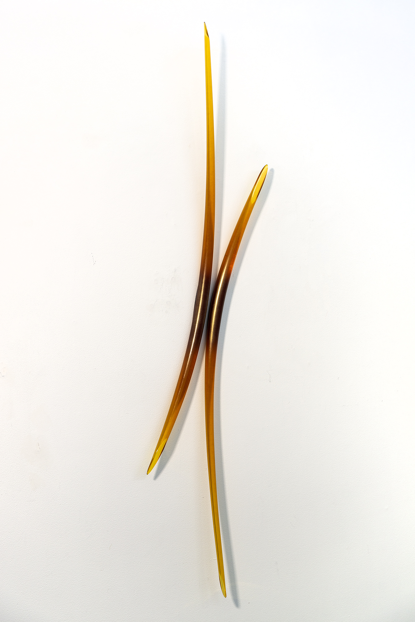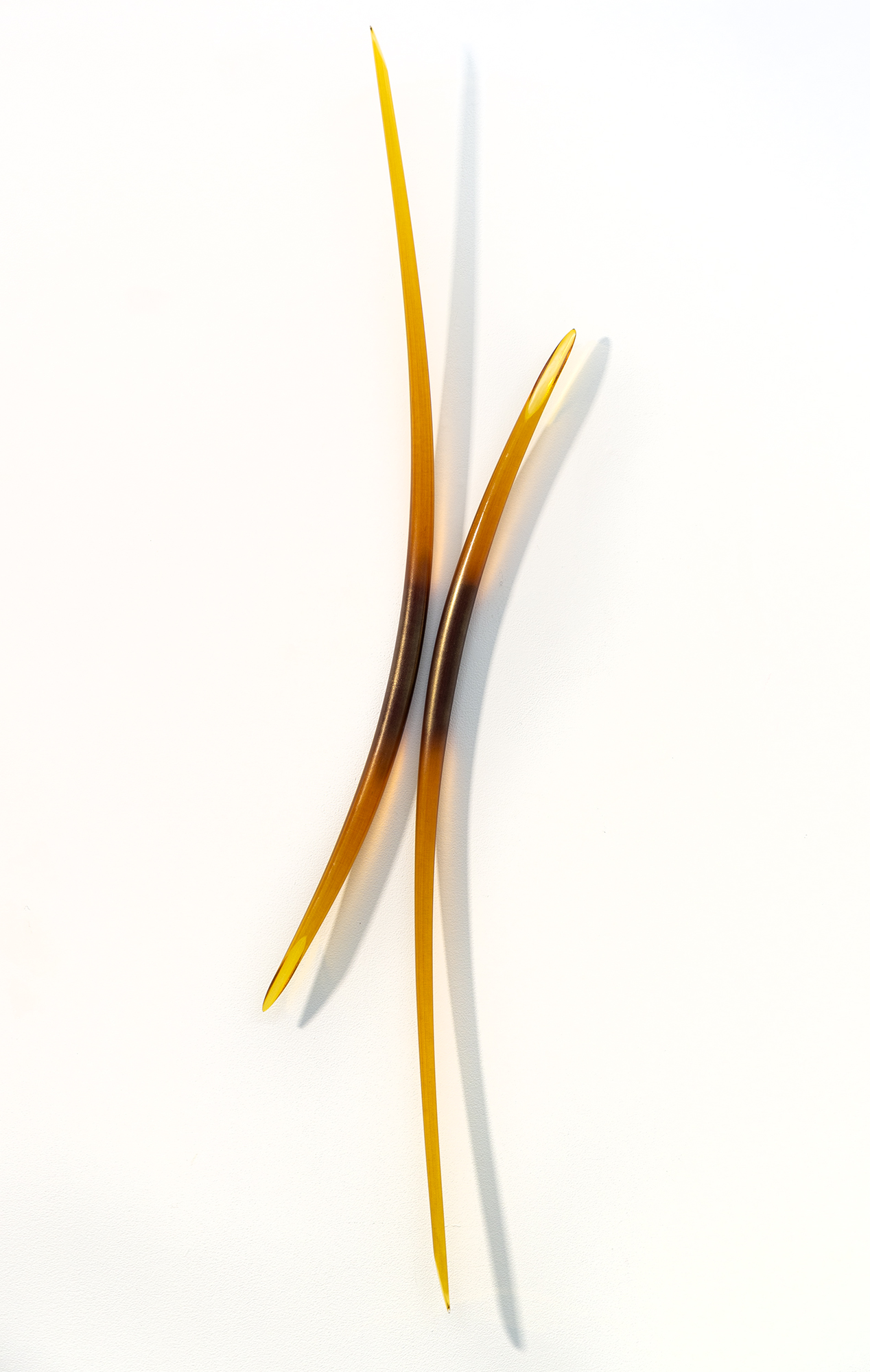 John Paul Robinson’s elegant designs capture the beauty of light as it illuminates each piece seemingly from within. His artwork is often inspired by nature and symbolizes the complex world of science. The gentle arc of Entanglement’s two solid glass amber coloured rods references the scientific concept of how fundamental particles stay connected to one another, no matter how far apart they become. Placed on the wall beside one another, at different heights, the dynamic sculpture almost appears in motion. The ‘A’ in the title is for amber—edition #1.