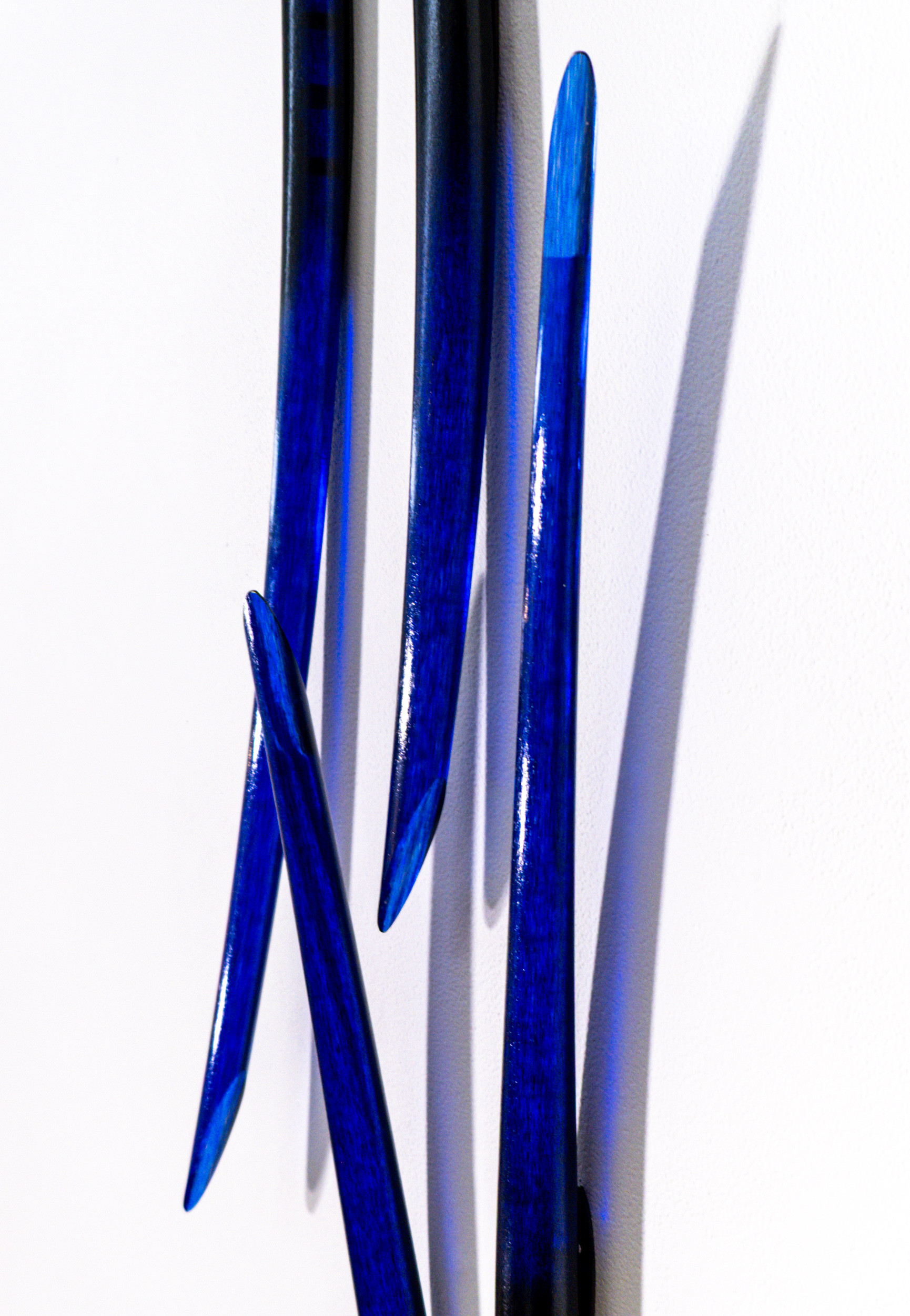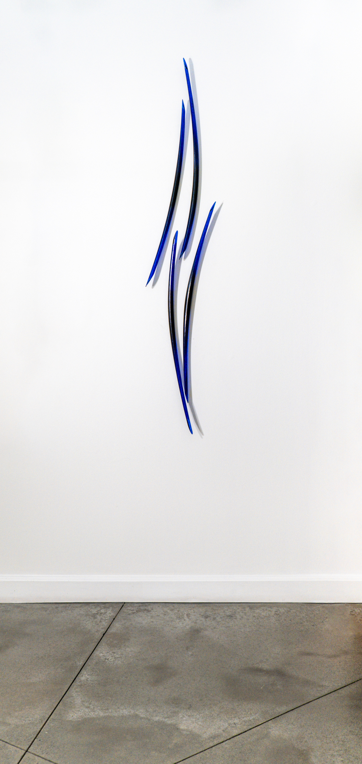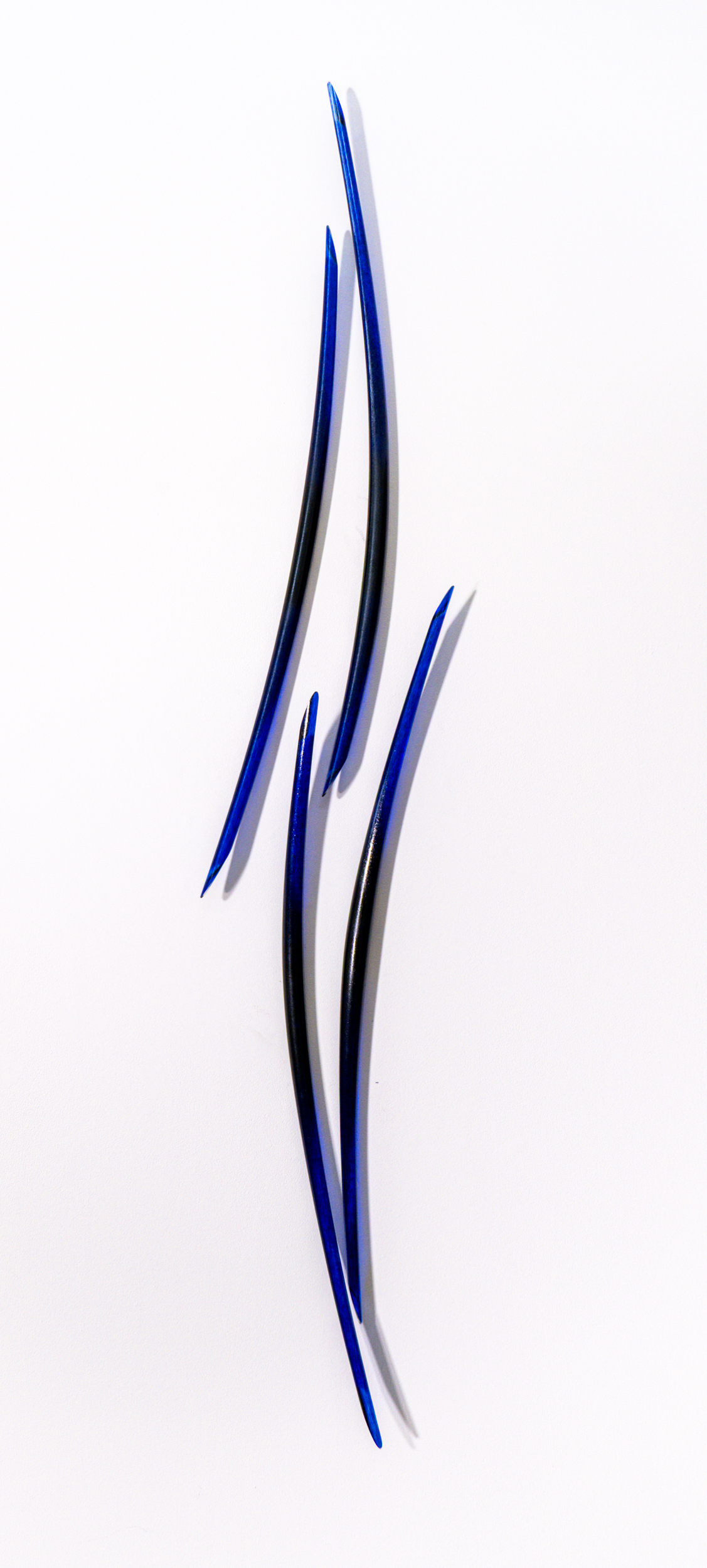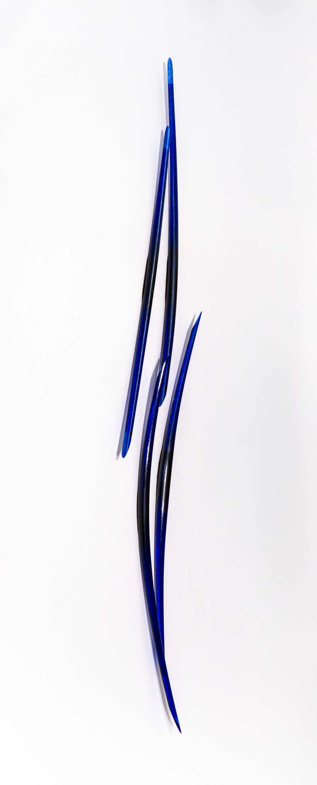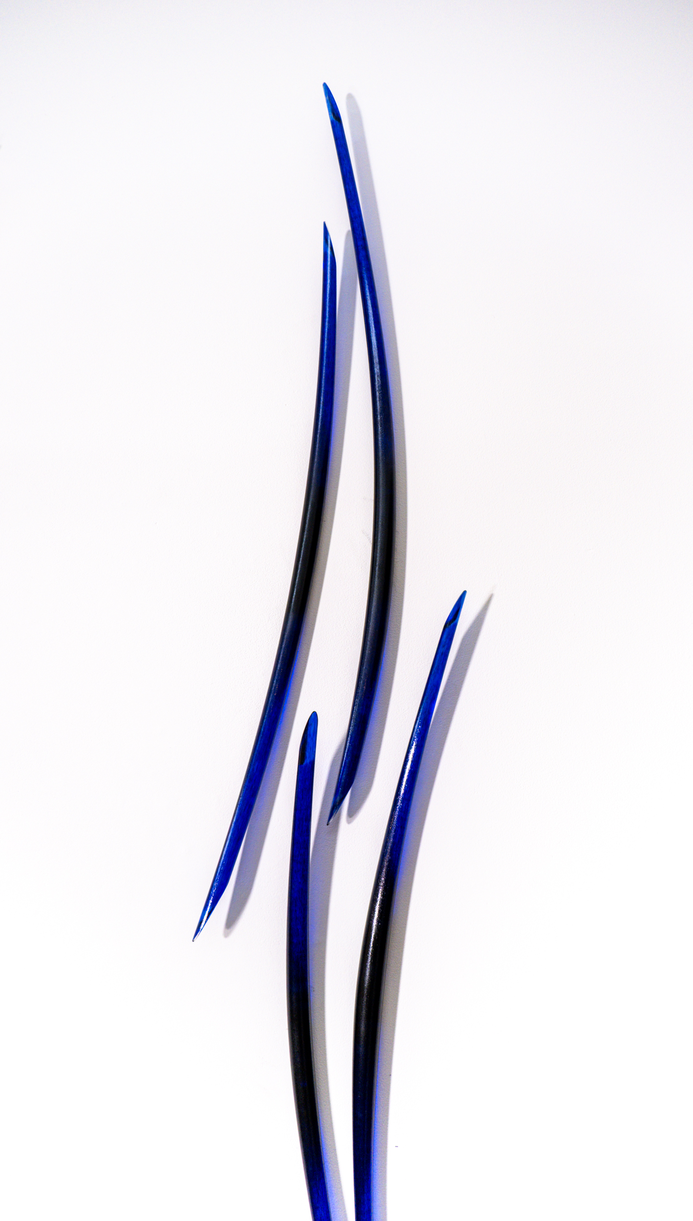 Here, four elegantly curved hollow rods of hand-blown glass in a deep blue make a uniquely dynamic statement. As light shines through them, shadows on the wall add dimension and a sense of movement. The deep blue colour is created from a custom mix of blue and black glass powder. Each highly polished piece acts like a lens, bending the light as it enters it. The name refers to a scientific theory about wave particles.