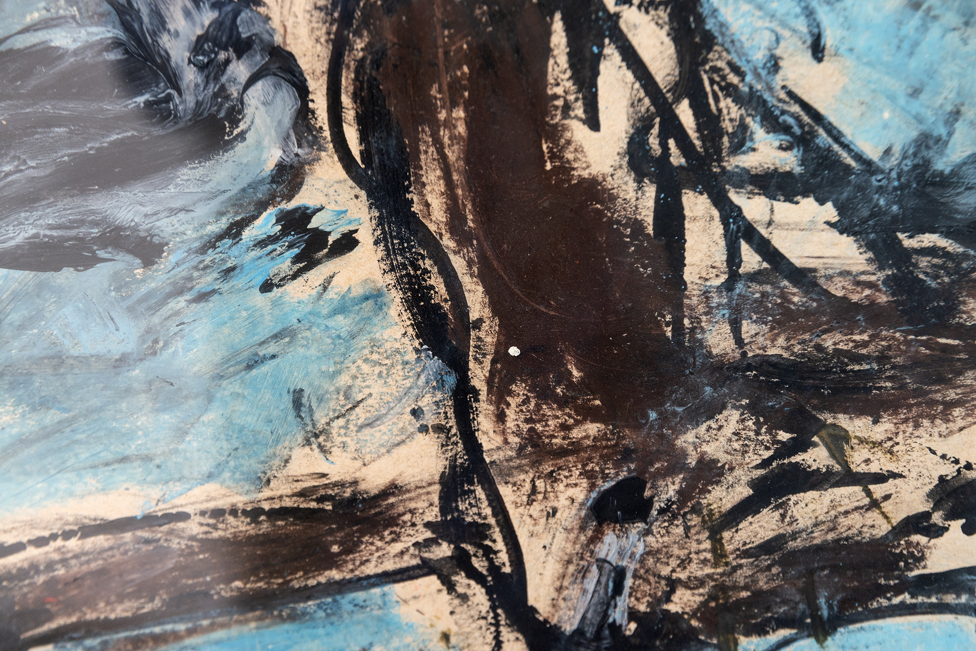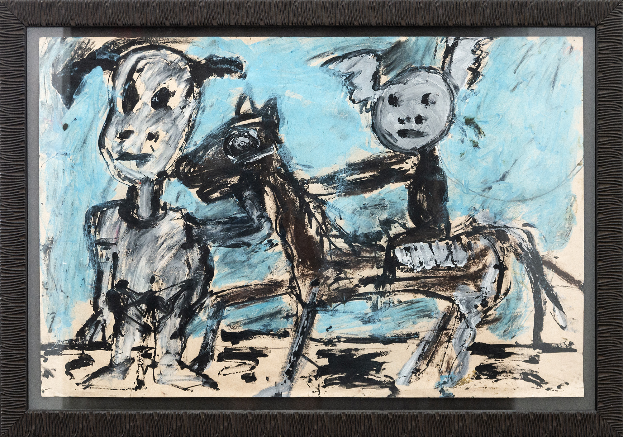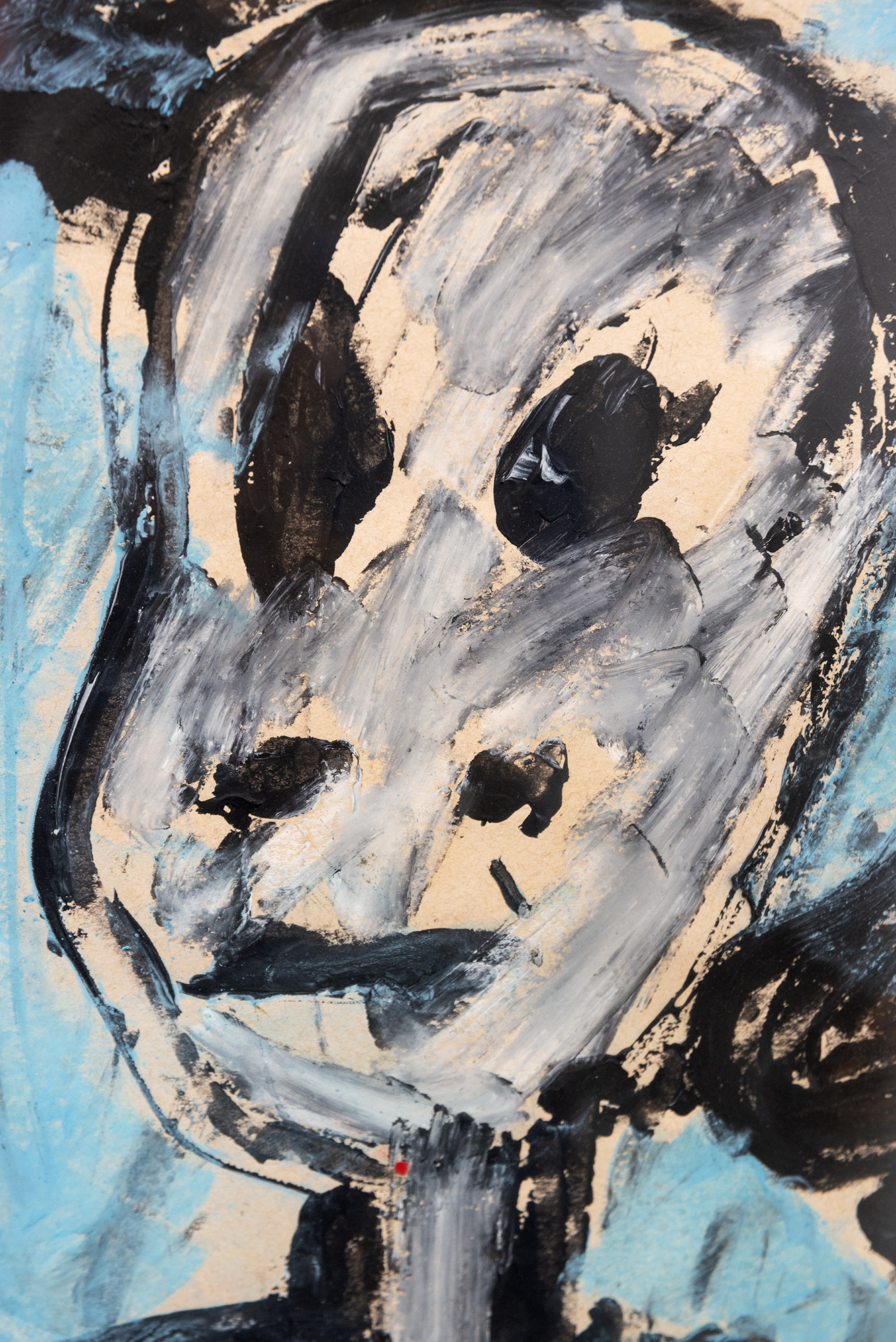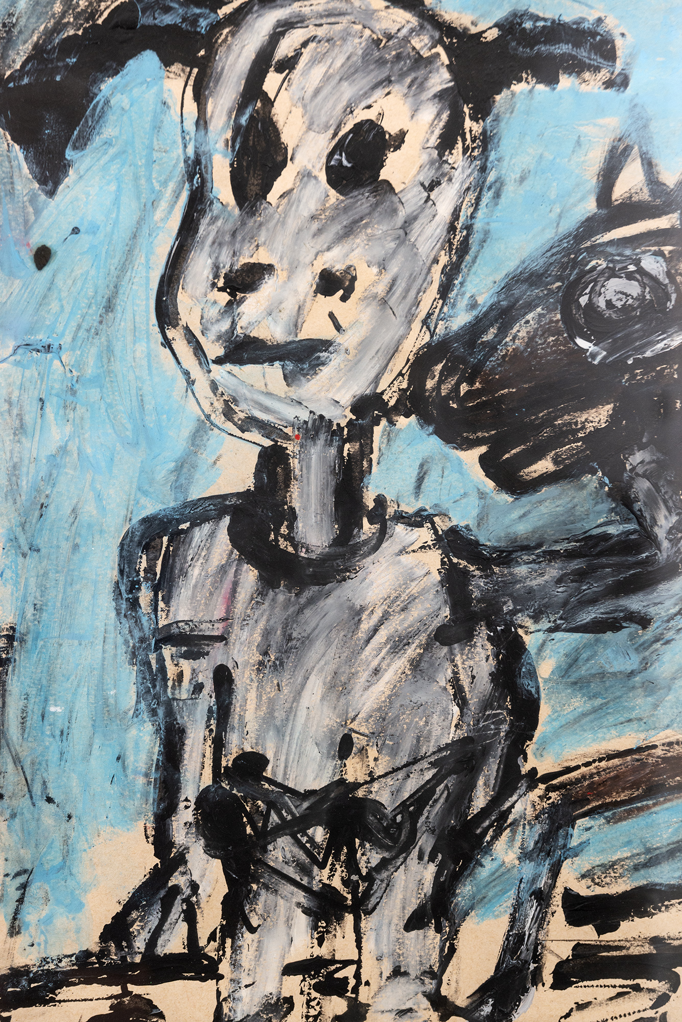 This street art style graphic acrylic painting is by John Scott.The crudely painted imagery of this Canadian artist often included his signature use of rabbit-like figures. Scott created these accessible images to suggest anxiety-ridden humans, victims of modern-day society. His artwork is informed by his working-class background, his love of street art and heavy rock music. Growing up during the Cold War era and the threat of a nuclear attack resulted in themes that revealed his anti-war politics and his genuine anguish at the negative effects of capitalism on humanity. This painting is named after a famous Spanish novel about a doomed character who, alongside his faithful companion, embarks on a quest to restore chivalry in the world.