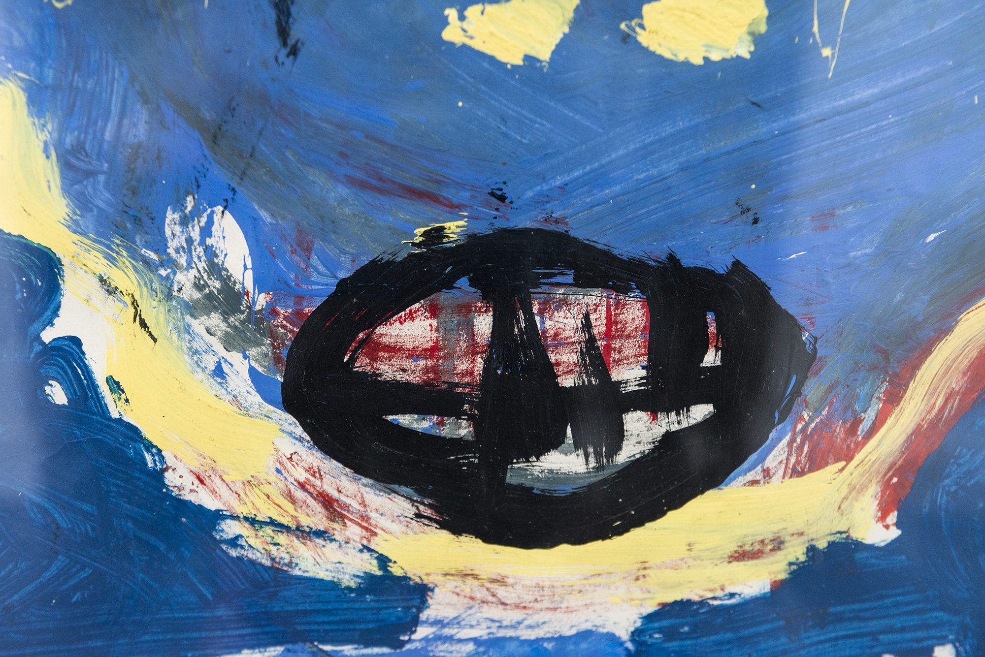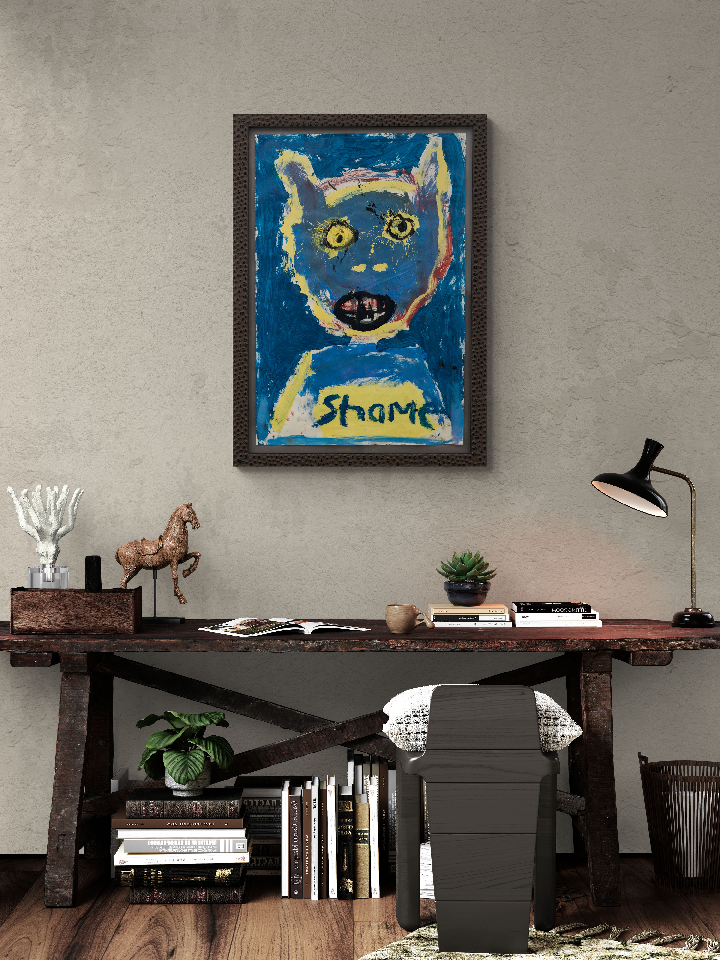 Scott’s style is rough, simple shapes of expressive brush strokes in bold colours—deep blue, yellow, a touch of white and red, and charcoal black. Growing up during the Cold War era under the threat of a nuclear attack resulted in his politically charged anti-war themes.