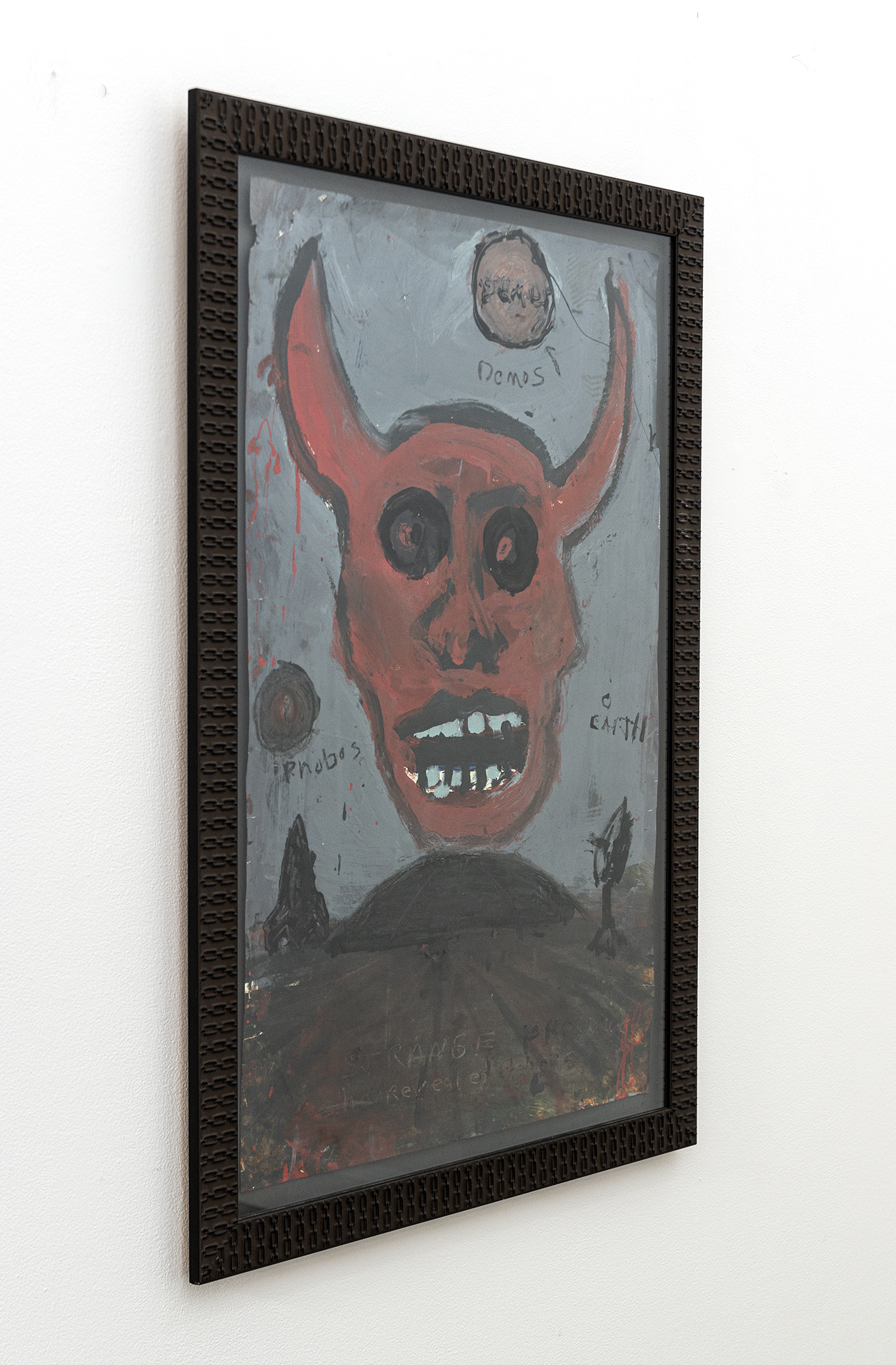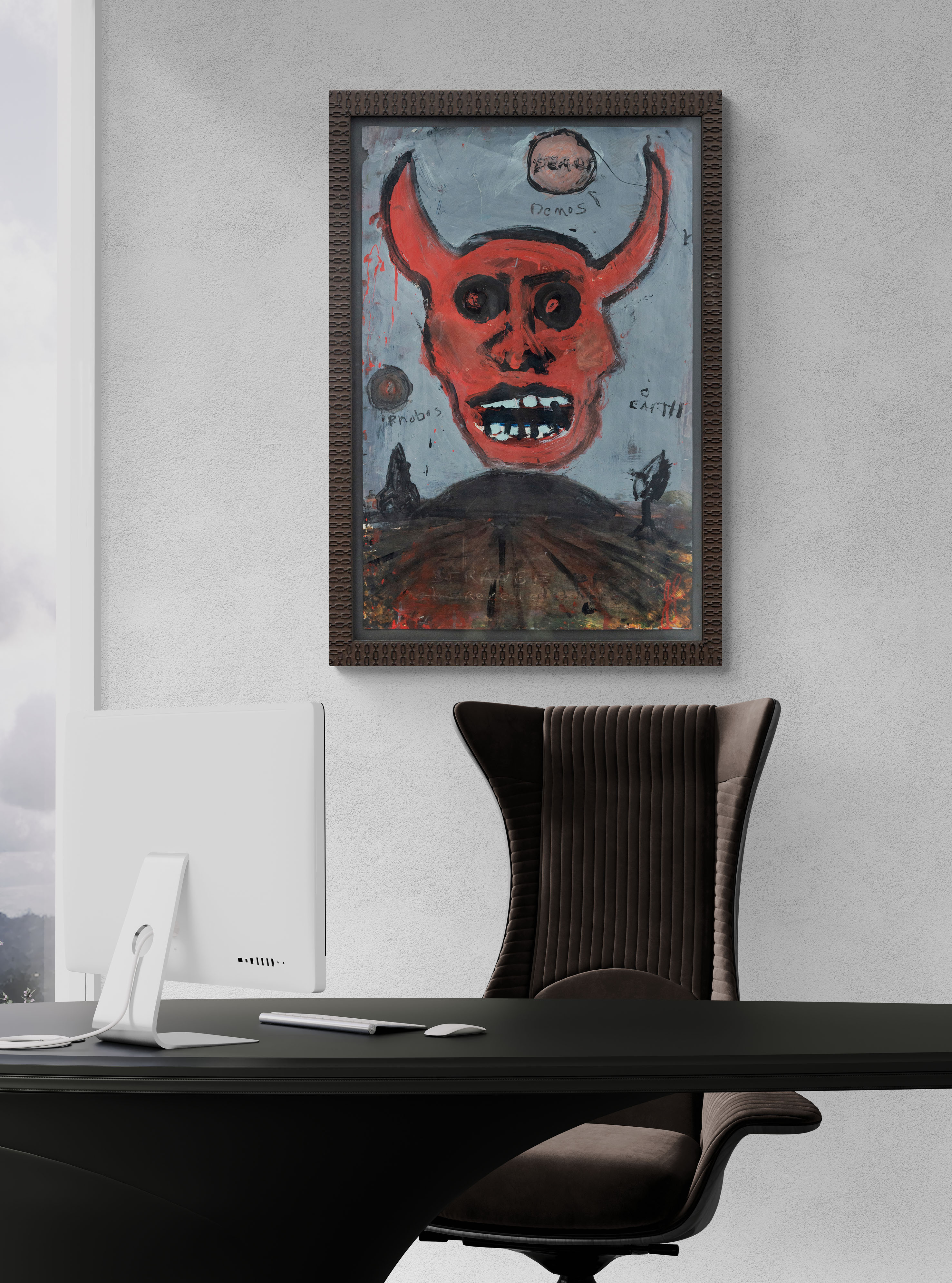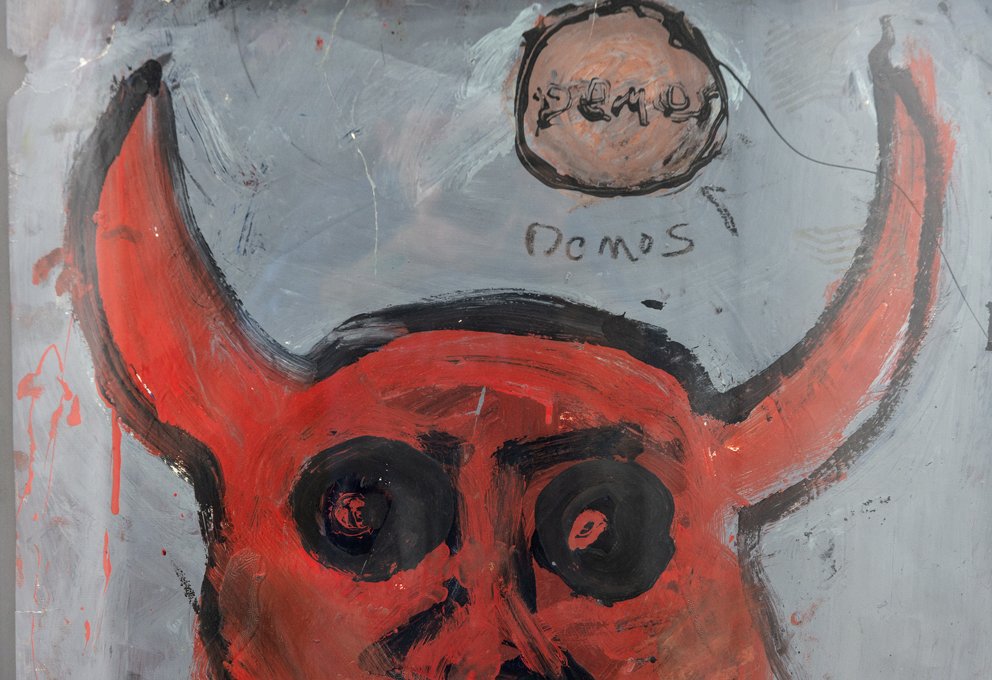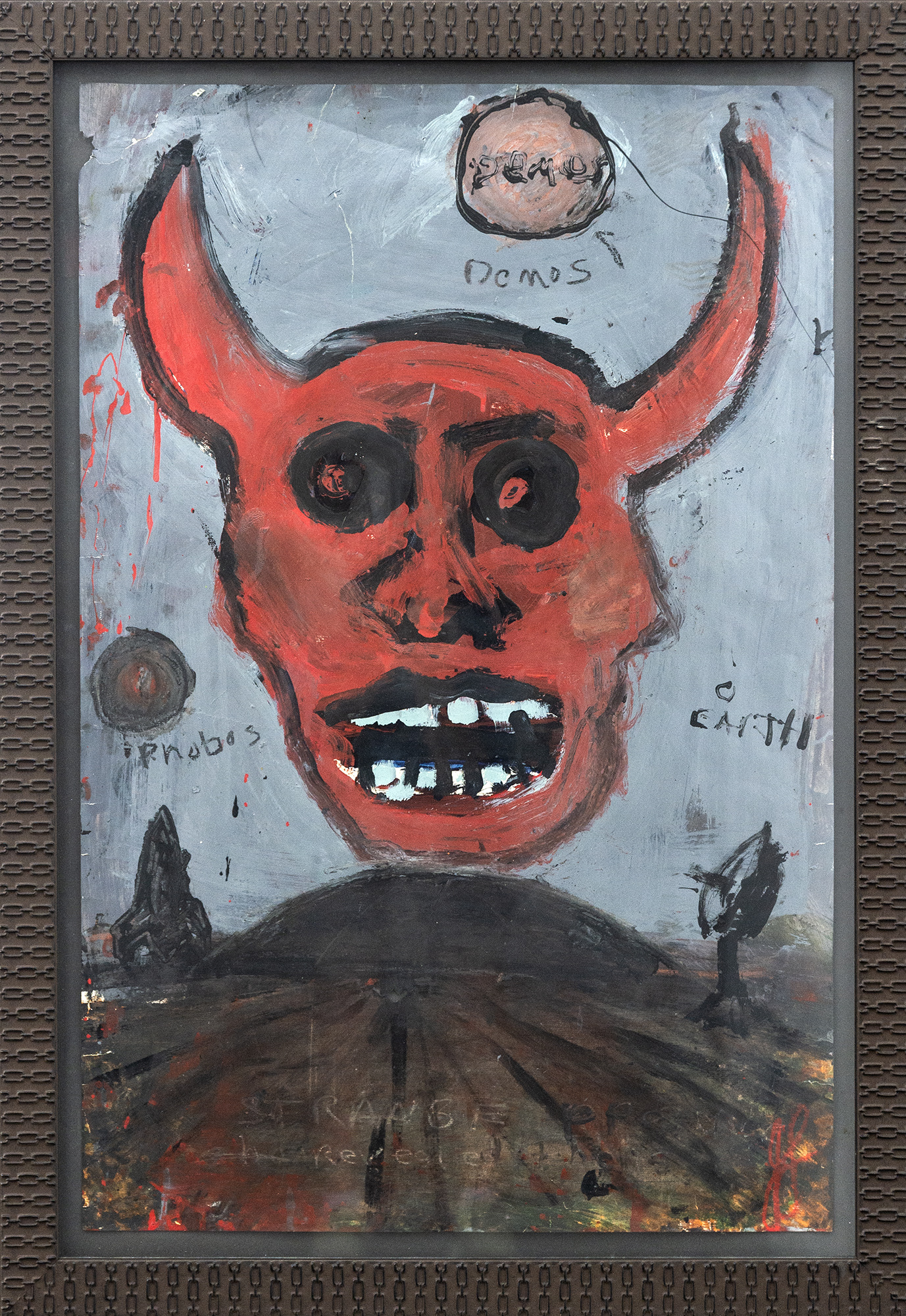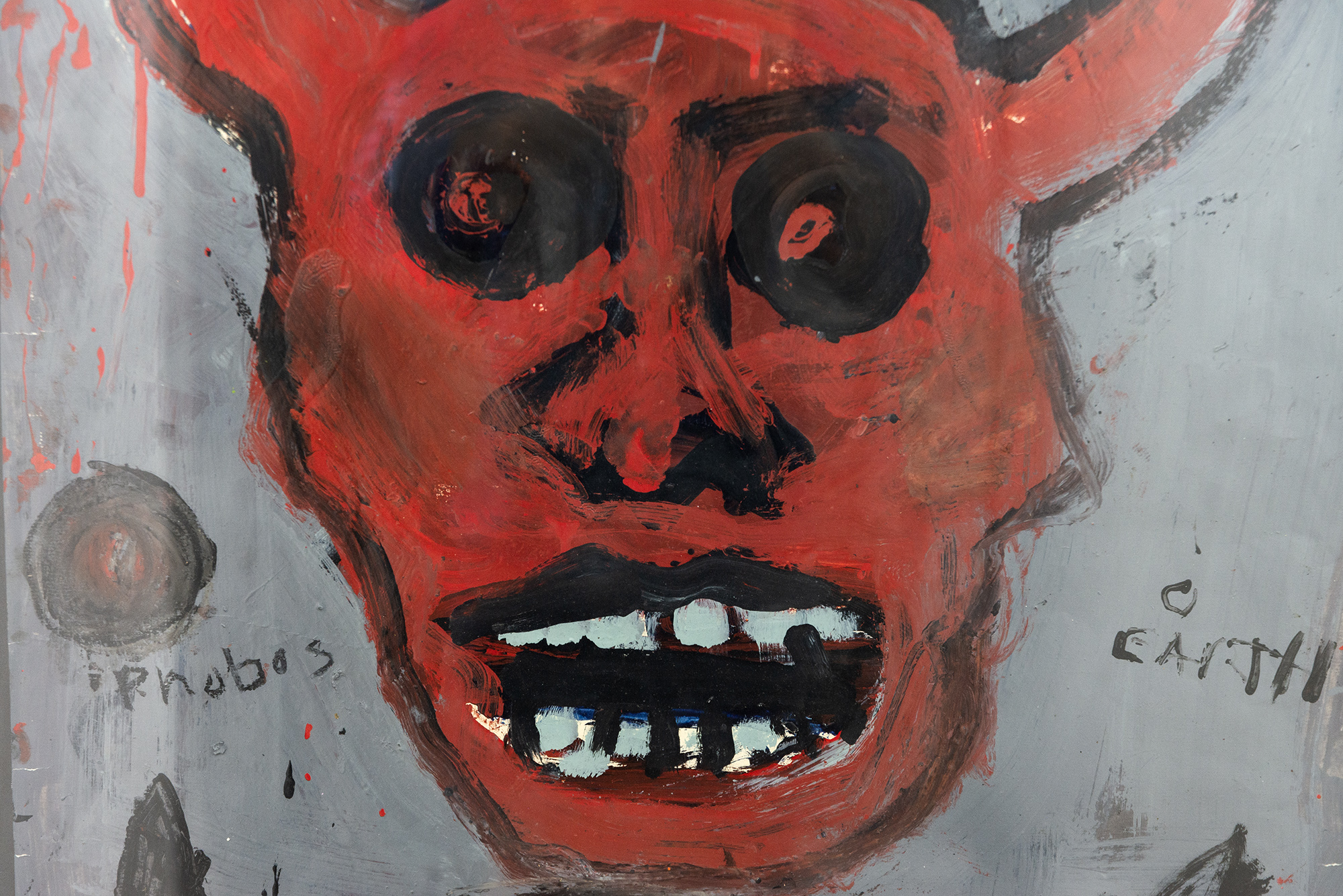 This graphic painting by John Scott deals with images associated with the devil and war.Growing up in Windsor, Ontario, in the 1950s during the Cold War, John Scott experienced the trauma of living under the threat of a nuclear attack. The bold, provocative imagery associated with his distinctive ‘street art’ style often includes apocalyptic images like the prince of darkness—the devil.