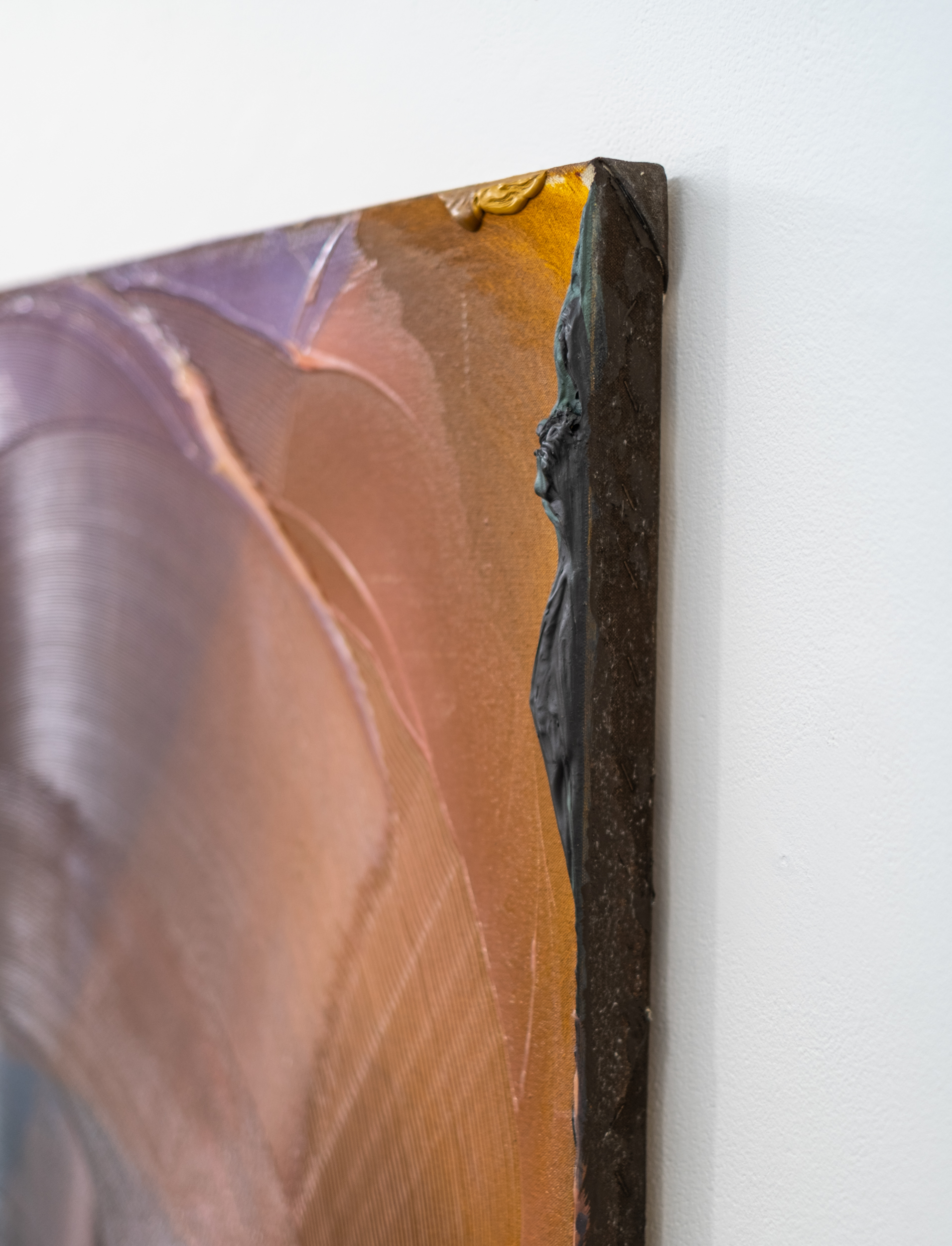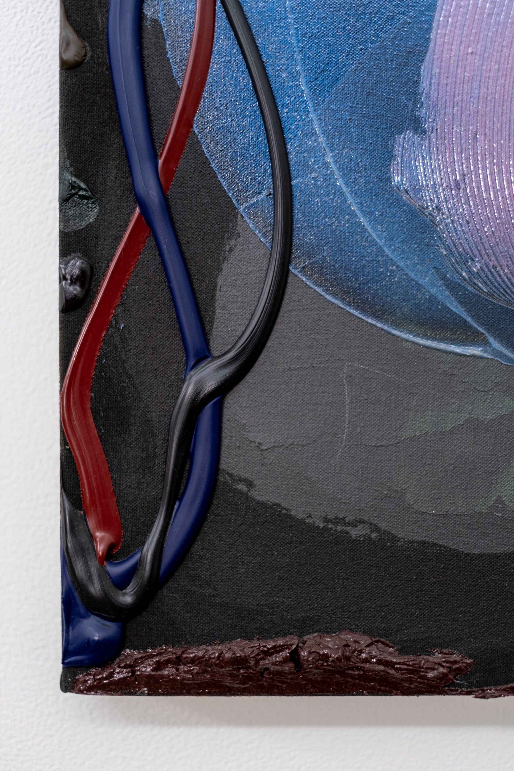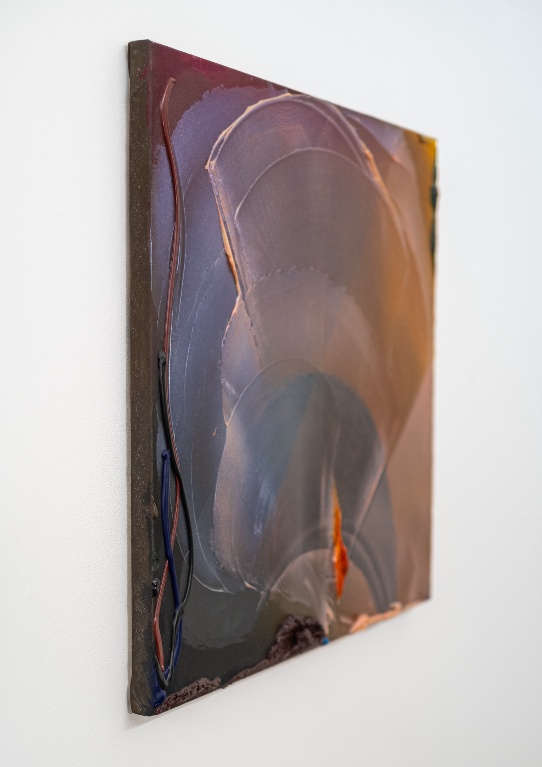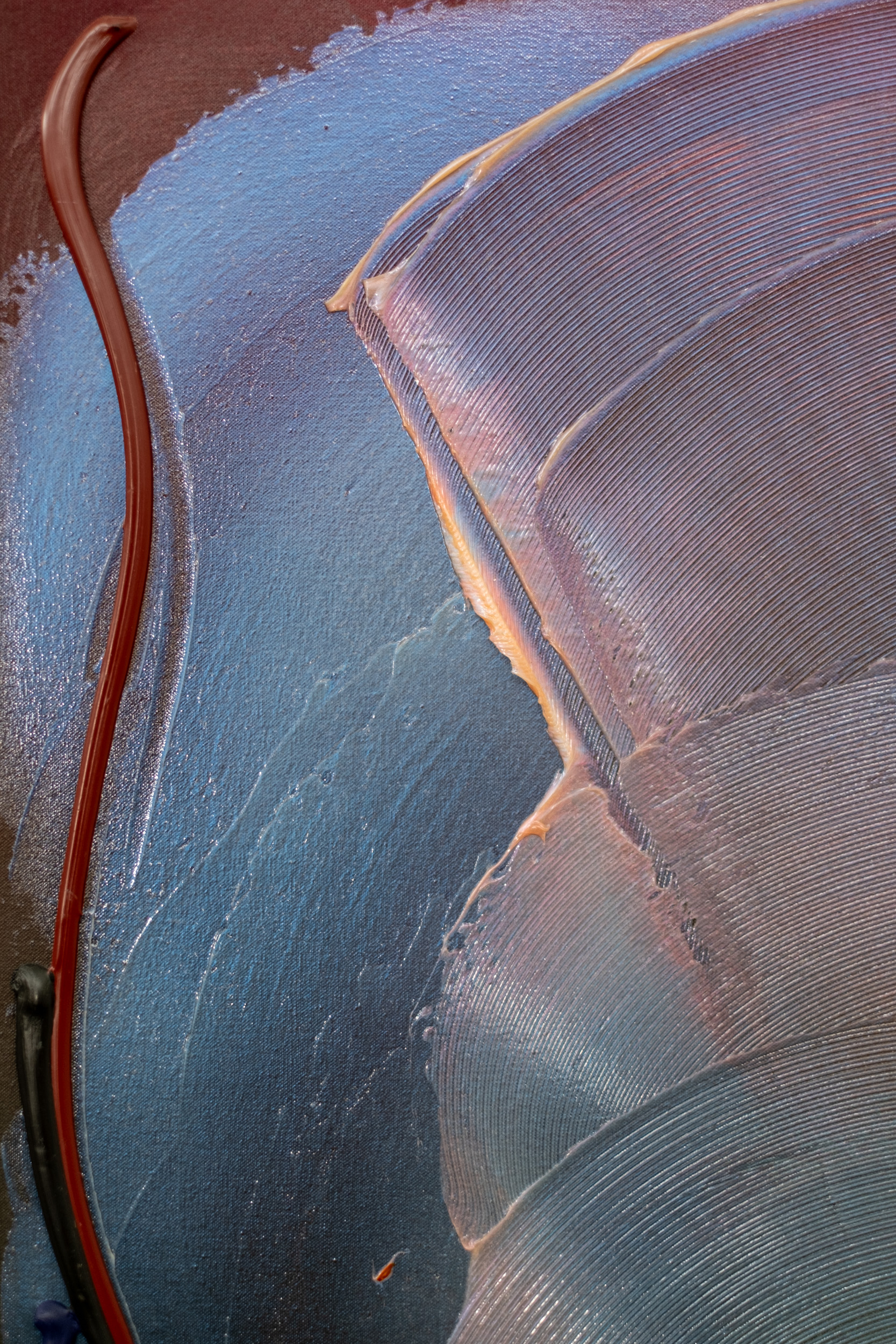 The colour palette is characteristically rich—jewel tone hues of purple, blue, aubergine, and burgundy contrast with melon, slate gray, black and a slash of orange. Drapell’s signature impasto--layers of thick paint applied in expansive swirls and lyrical lines underscores the painting's palpable energy.