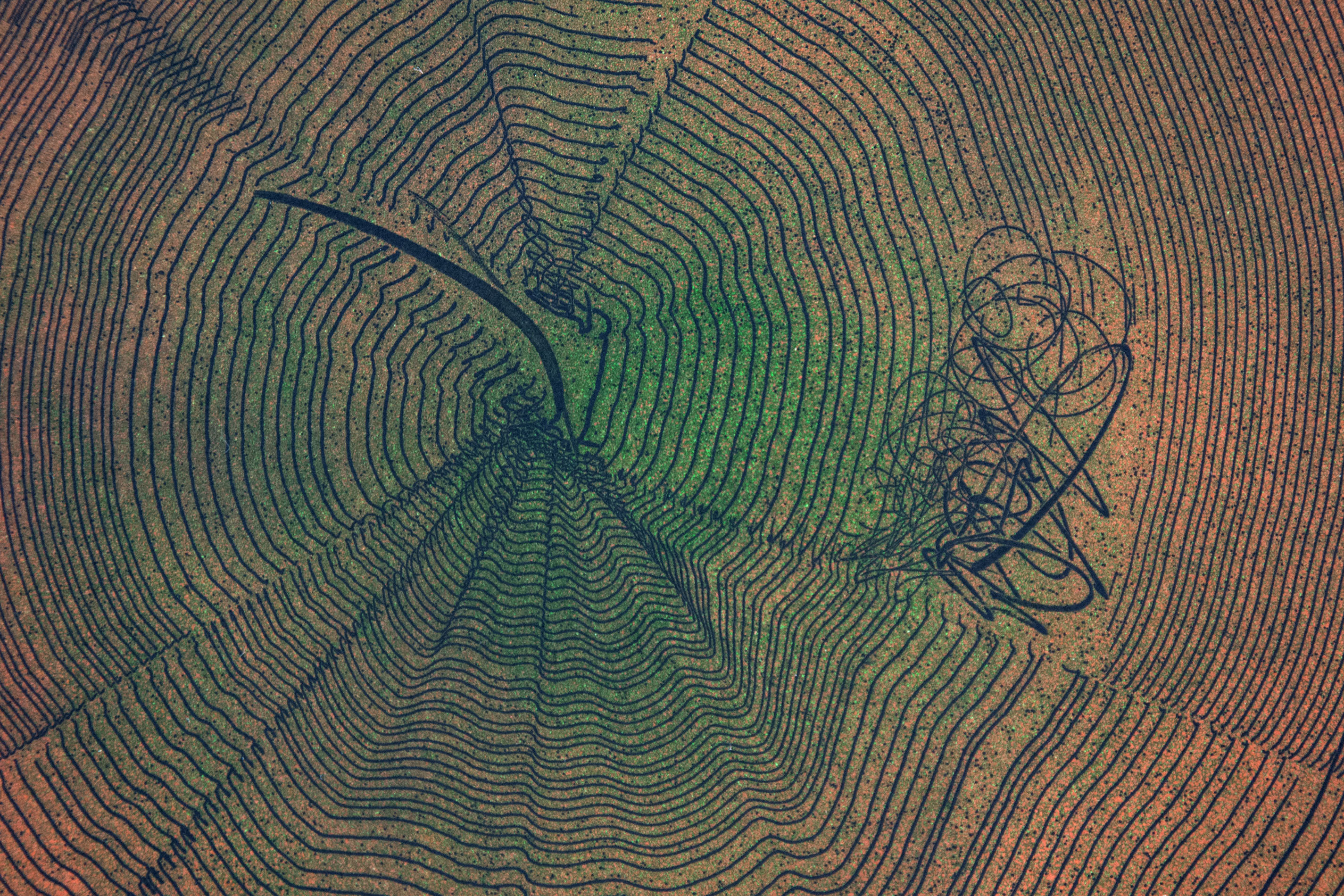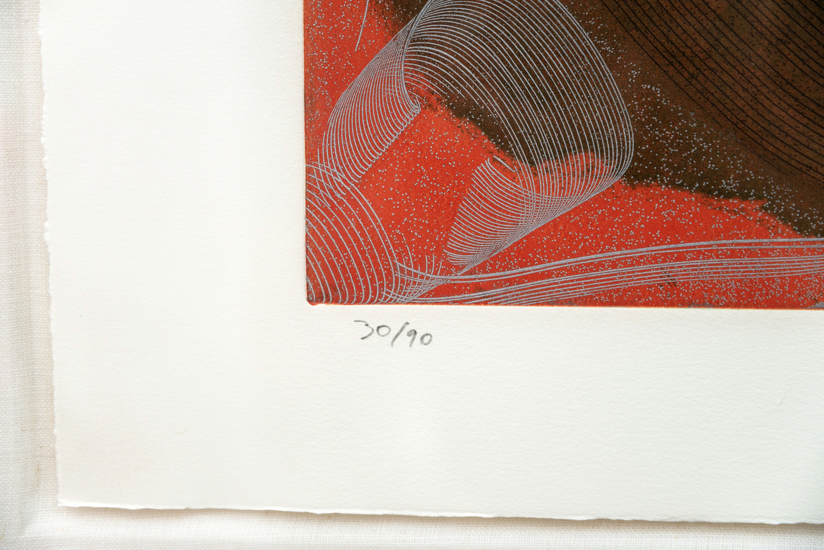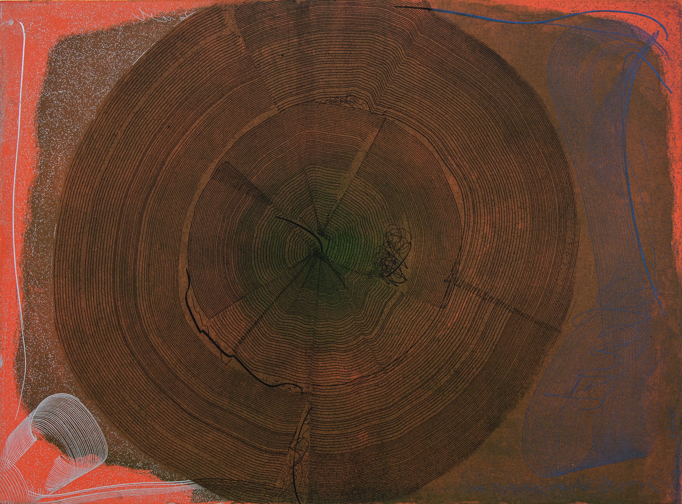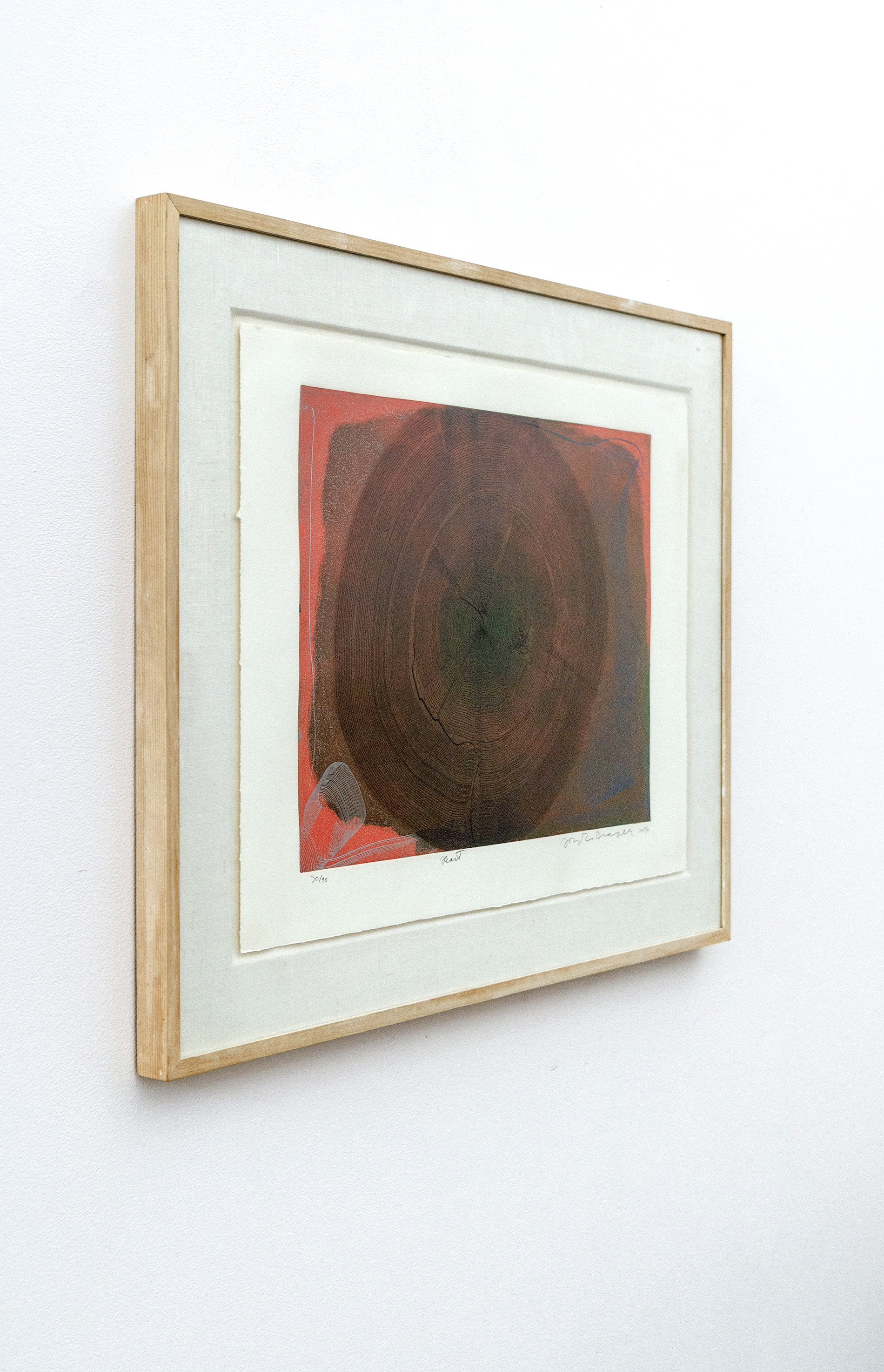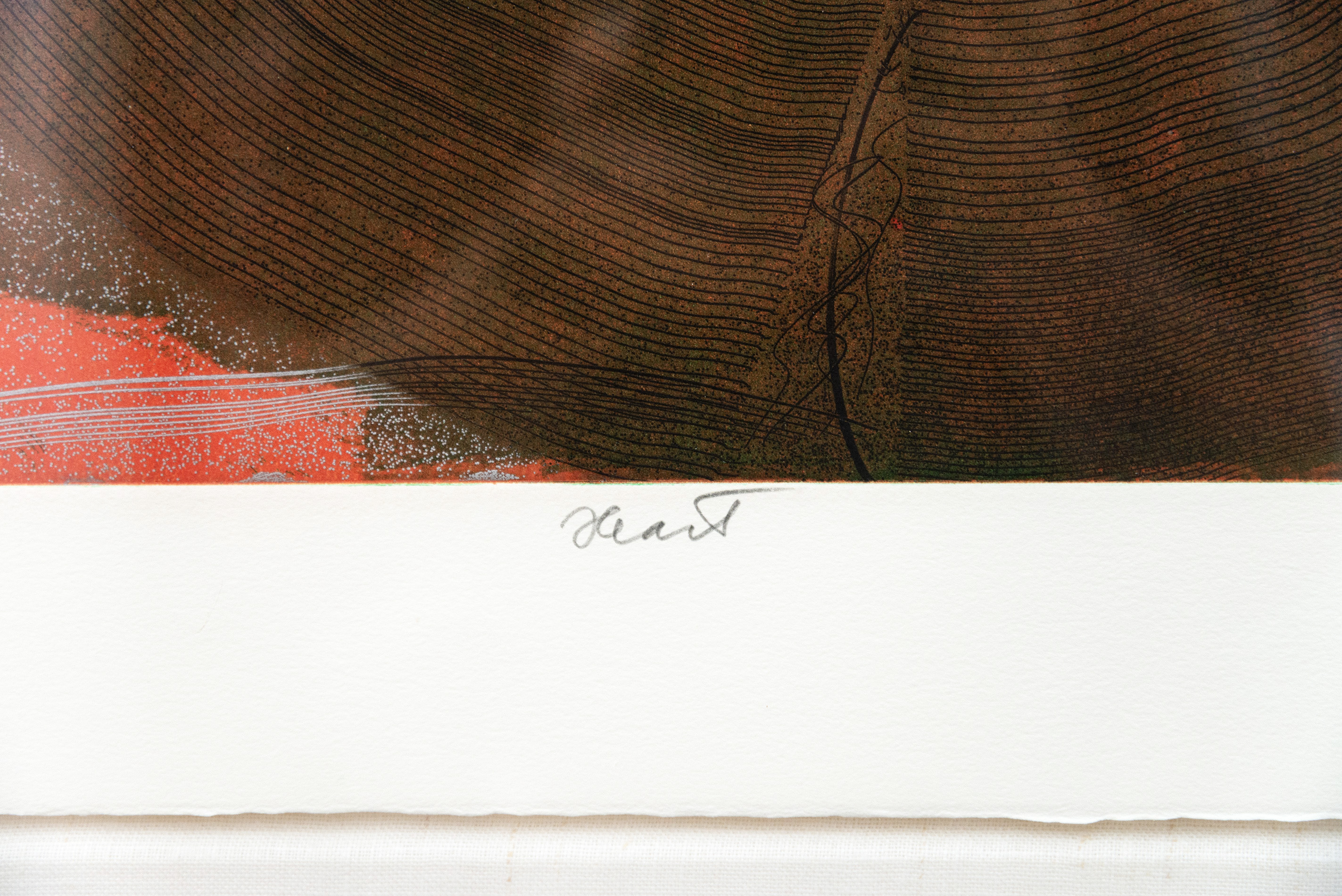 As if emulating the rhythm of a beating heart, this compelling abstract print was created by the Czech born artist Joseph Drapell. Fine concentric circles in black emanate from the green centre of this piece against a rich brown background, framed by red and highlighted by a deep blue and silver detail. Drapell is known for his skilled use of trowels, serrated blades and his fingers to achieve remarkable texture and depth in his work. Edition 30 of 90.“In terms of real painting innovation, I admired the work of Barnett Newman, Jackson Pollock,