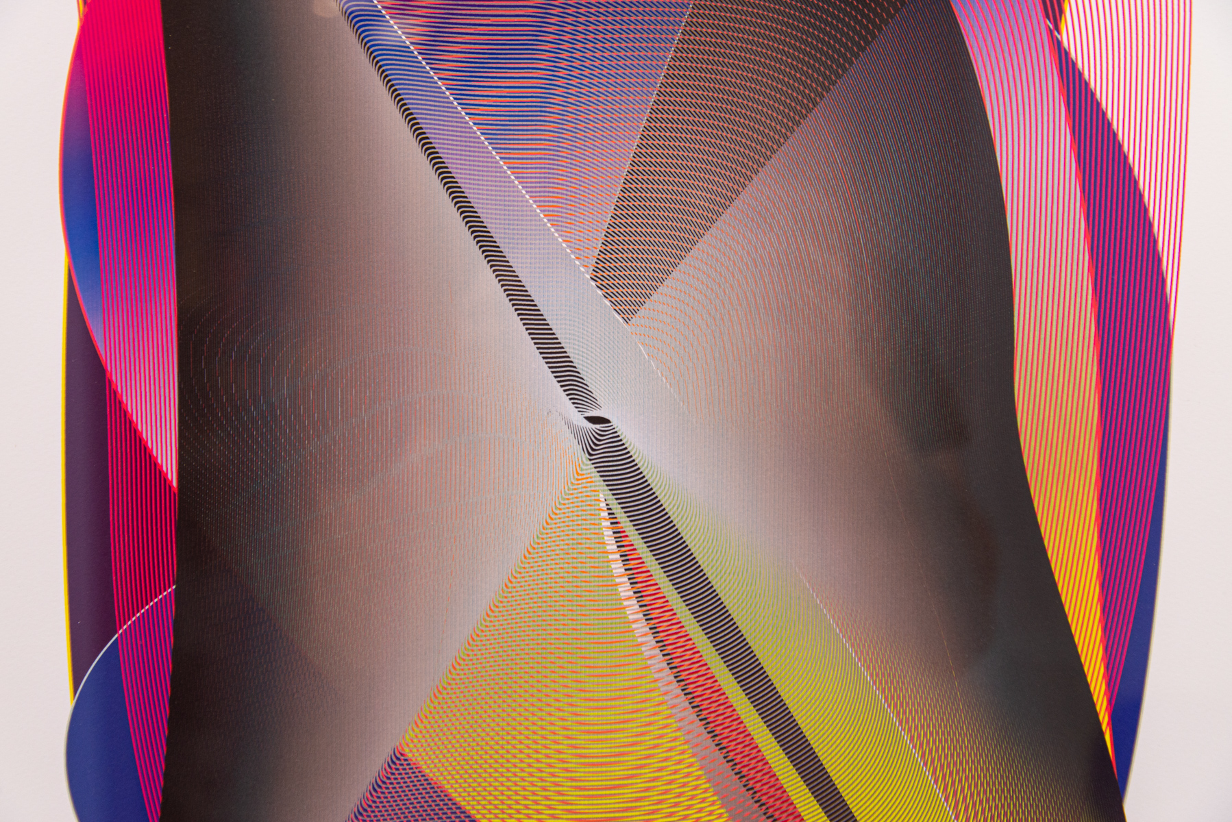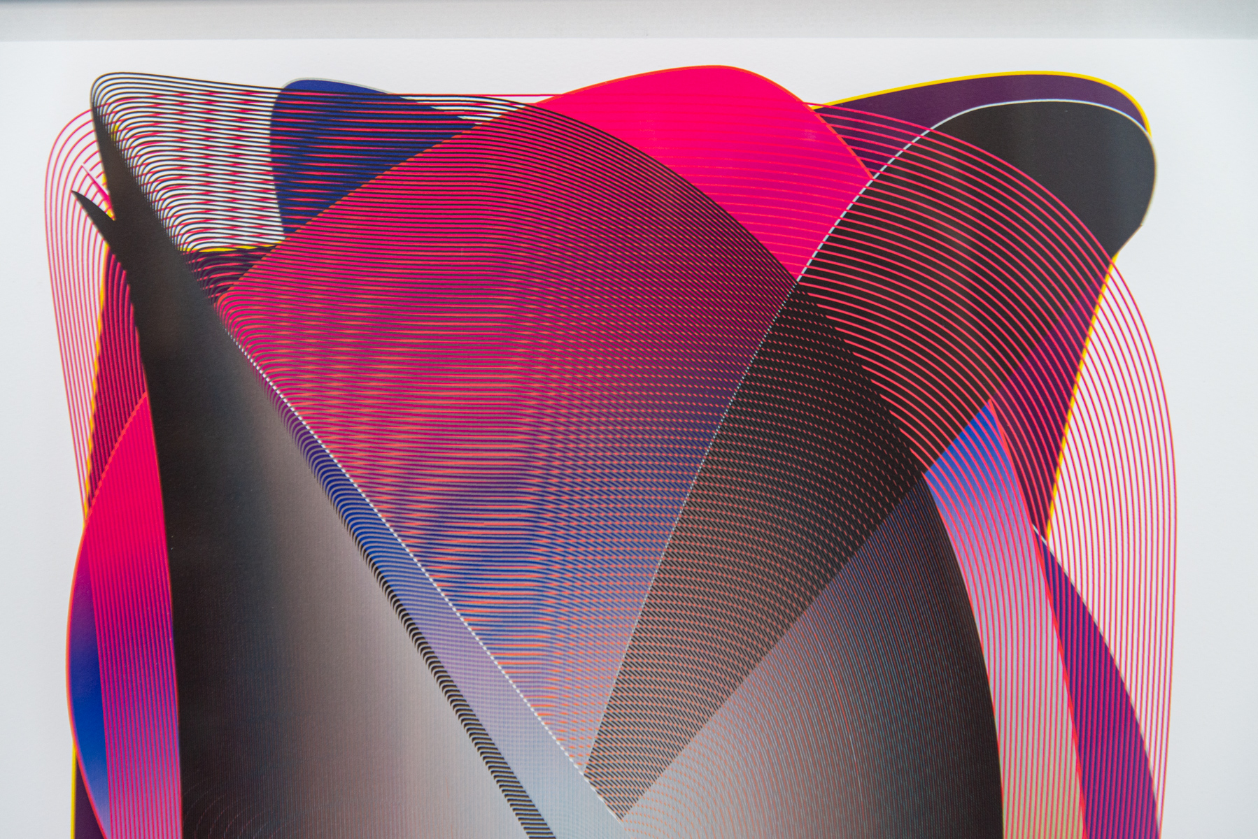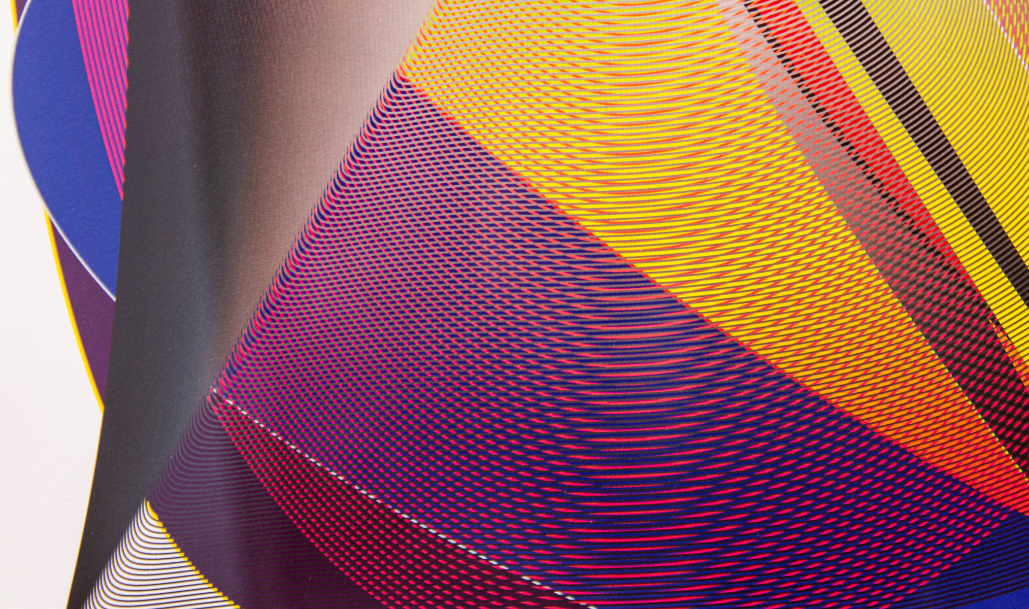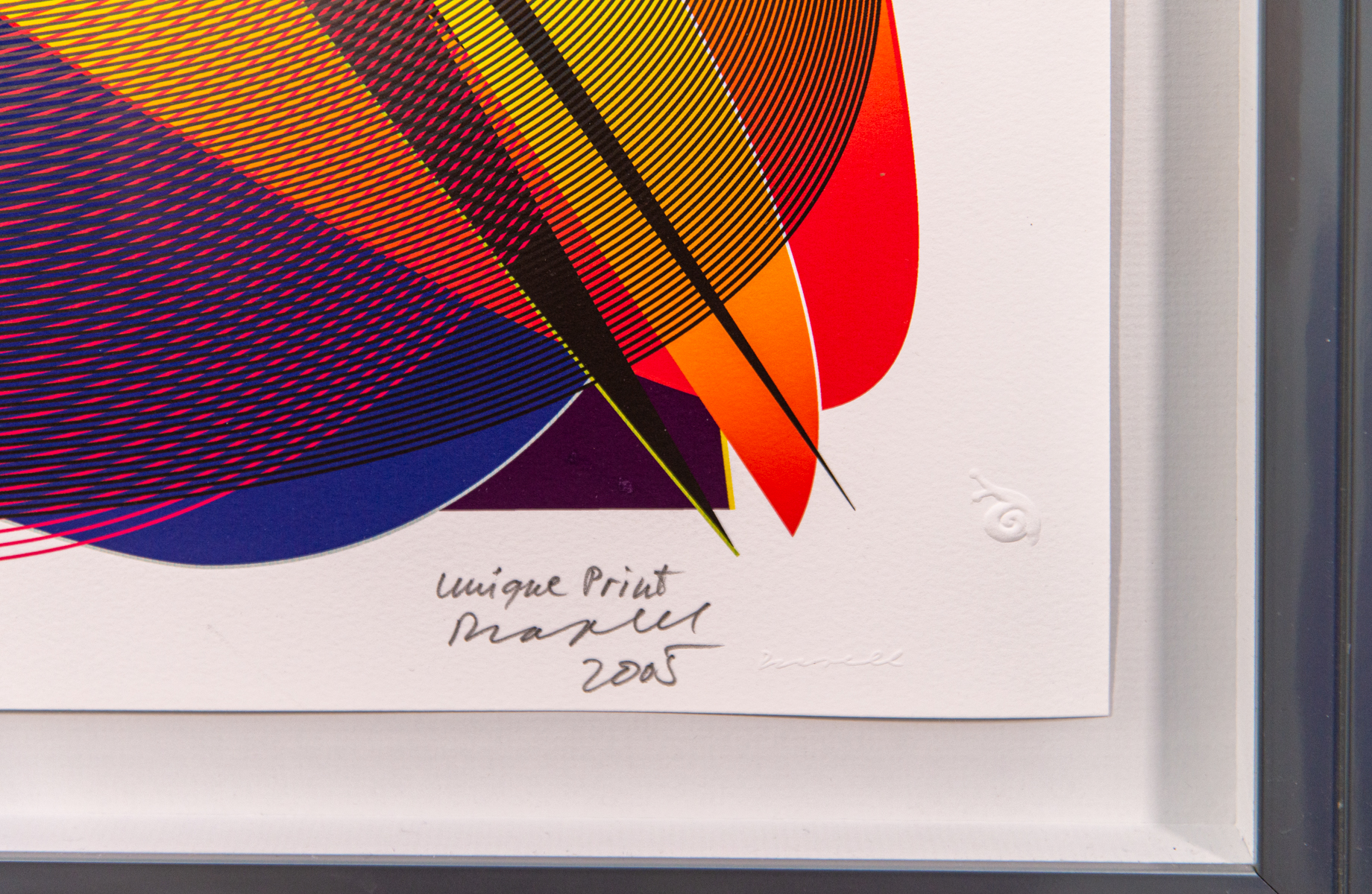 This compelling singular signed print–one of a kind was created by the Czech born artist Joseph Drapell. The form is reminiscent of the popular sixties’ art game called Spirograph. Brightly coloured ‘waves’ vibrate out from the center of the work. The colours pop from the canvas--pinks, blues, yellows, and orange highlighted by black on a white background.“ It took me 50 years or so to develop my own art, to contribute to the chain of the art of painting.” Joseph Drapell