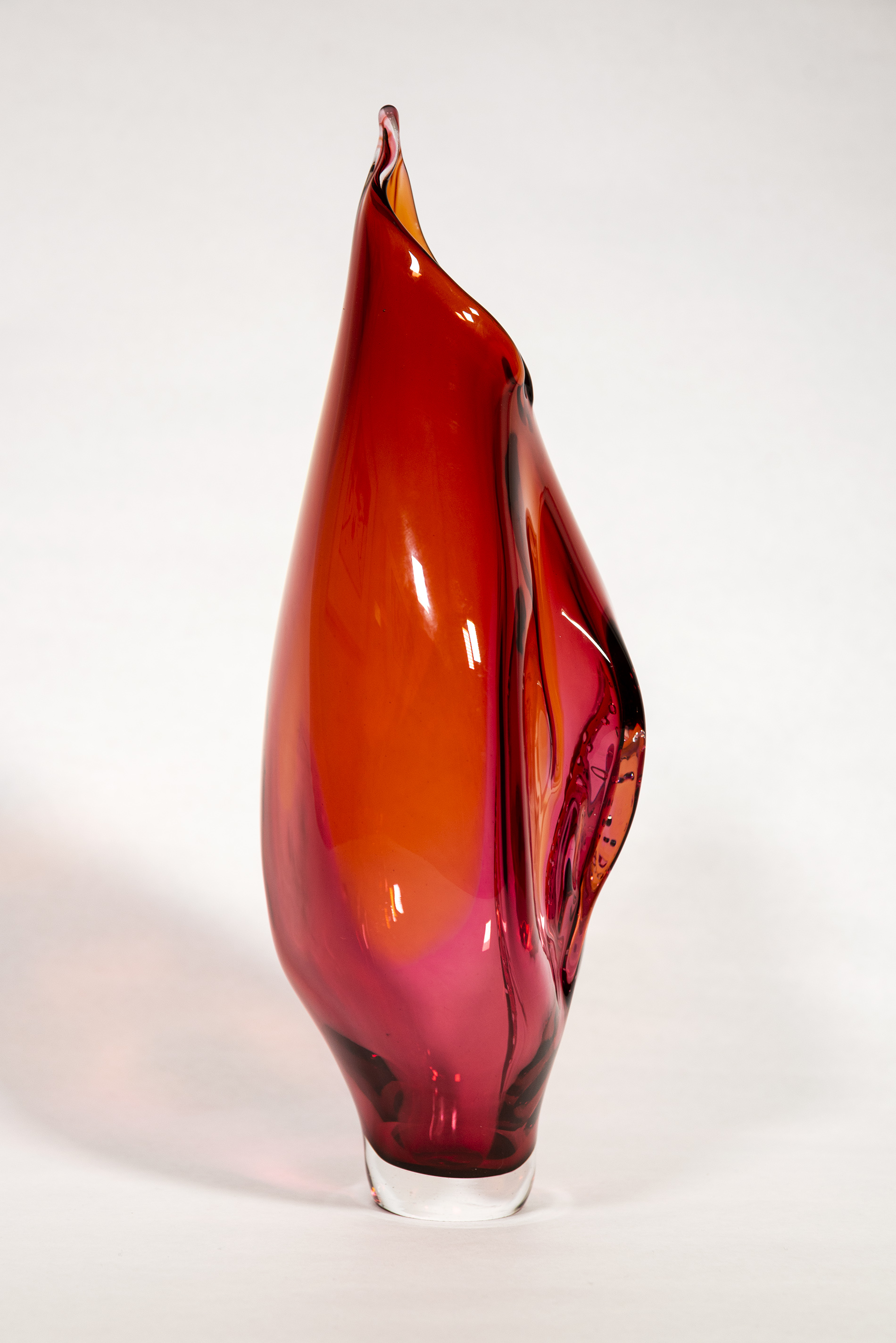 This modern glass red and pink vase by Julia Reimer is inspired by nature.The original designs of Julia Reimer’s award-winning glass work have long been influenced by nature—the light that plays across the windswept grasslands of her Alberta home. In recent years, she has had the opportunity to be a resident artist at the University of Australia. There she explored how landscape, the natural environment and culture affect artists' craft. This research gave her a new perspective on the role of nature in her own ethereal glass work…in form and colour. The Pod series is a continuation of this exploration. Its elegant shape is reminiscent of a seed pod found in nature—the ‘housing’ for new plant life. This blown glass large-sized vase is a red/pink colour.