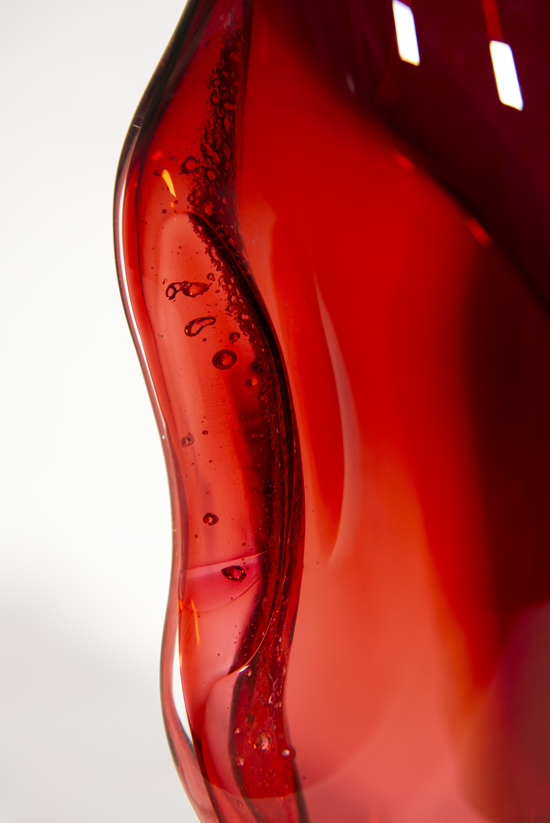 This modern glass red and pink vase by Julia Reimer is inspired by nature.The original designs of Julia Reimer’s award-winning glass work have long been influenced by nature—the light that plays across the windswept grasslands of her Alberta home. In recent years, she had the opportunity to be a resident artist at the University of Australia. There she explored how landscape, the natural environment and culture affect artists' craft. This research gave her a new perspective on the role of nature in her own ethereal glass work…in form and colour. The Pod series is a continuation of this exploration. Its elegant shape is reminiscent of a seed pod found in nature—the ‘housing’ for new plant life. This small-sized blown glass vase is a red/pink colour.