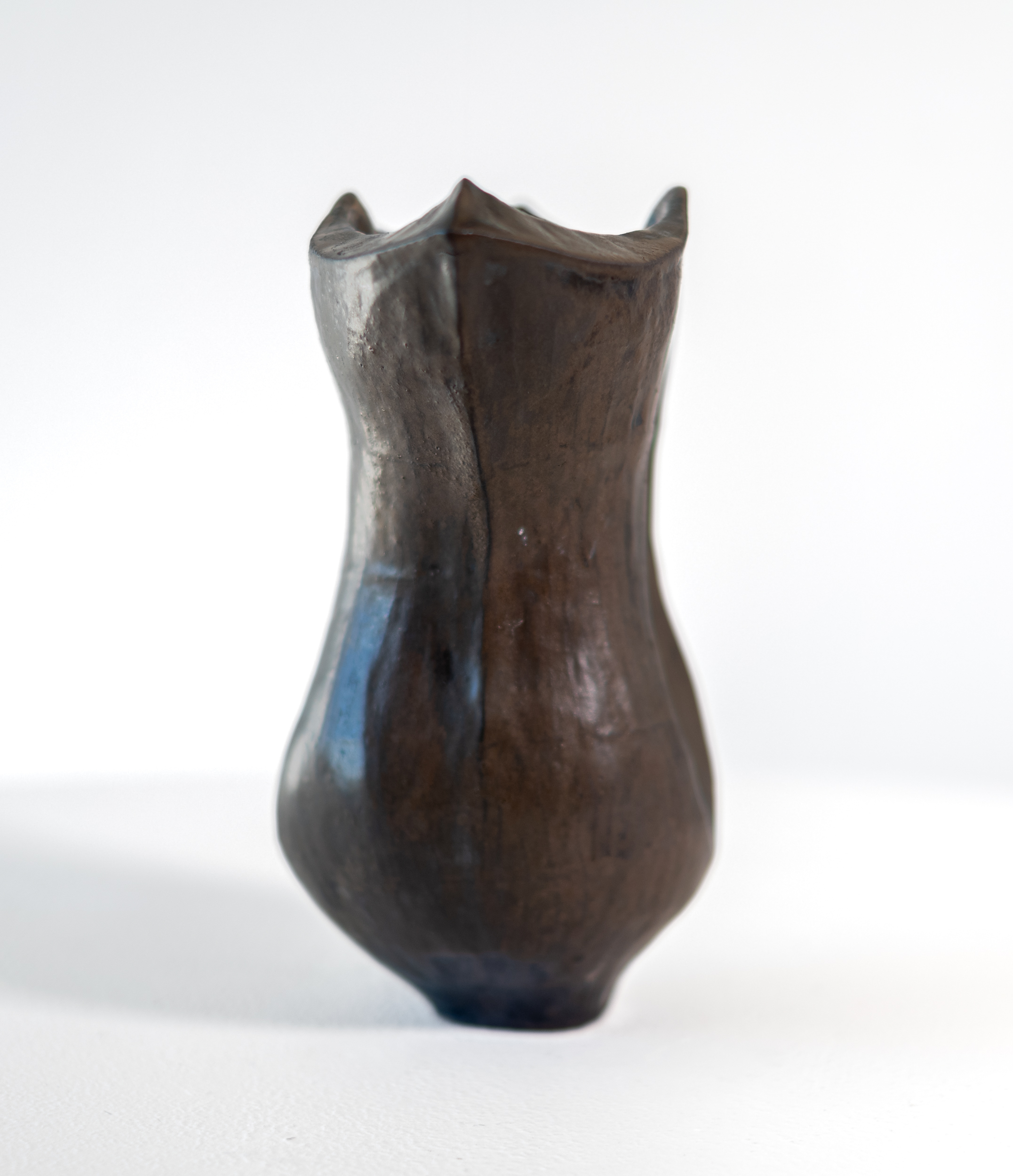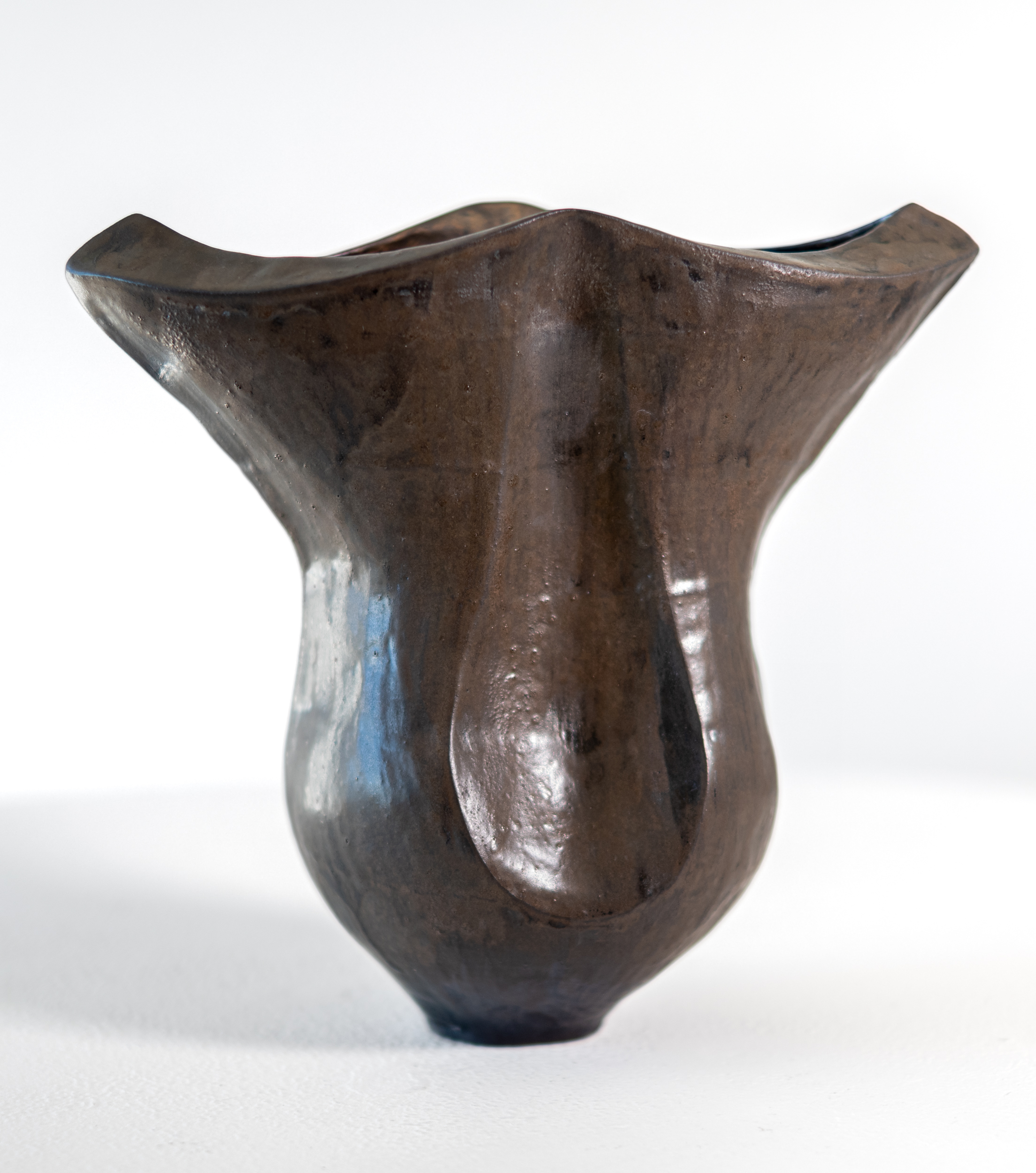 This contemporary ceramic black vessel in a floral shape is by Loren Kaplan.A gifted ceramicist, Loren Kaplan’s strikingly elegant work is highly regarded by international collectors. Kaplan’s porcelain artwork is informed by her homeland, South Africa. This black stone vessel is hand-built from coiled clay—its fluid organic shape inspired by a flowering plant called Nigella Damascena, (common name Love in the Mist), but it is also called ‘Devil in a bush’, referring to its dark, spiky seed pods. The rich, textured, dark finish is created by adding a variety of glazes, layered over each other.