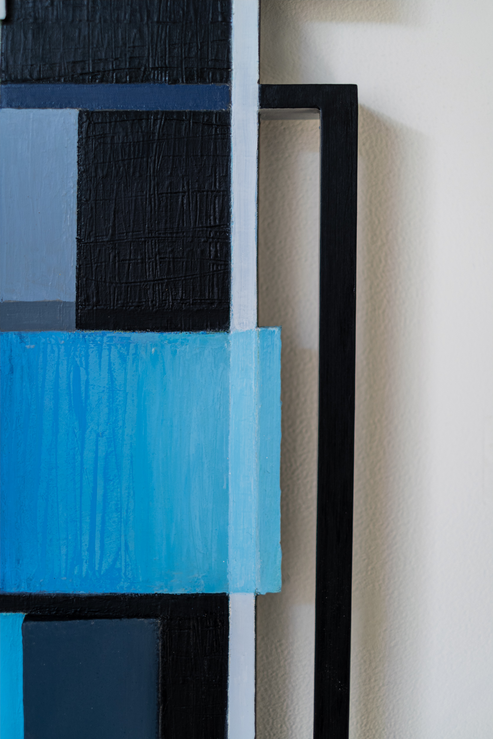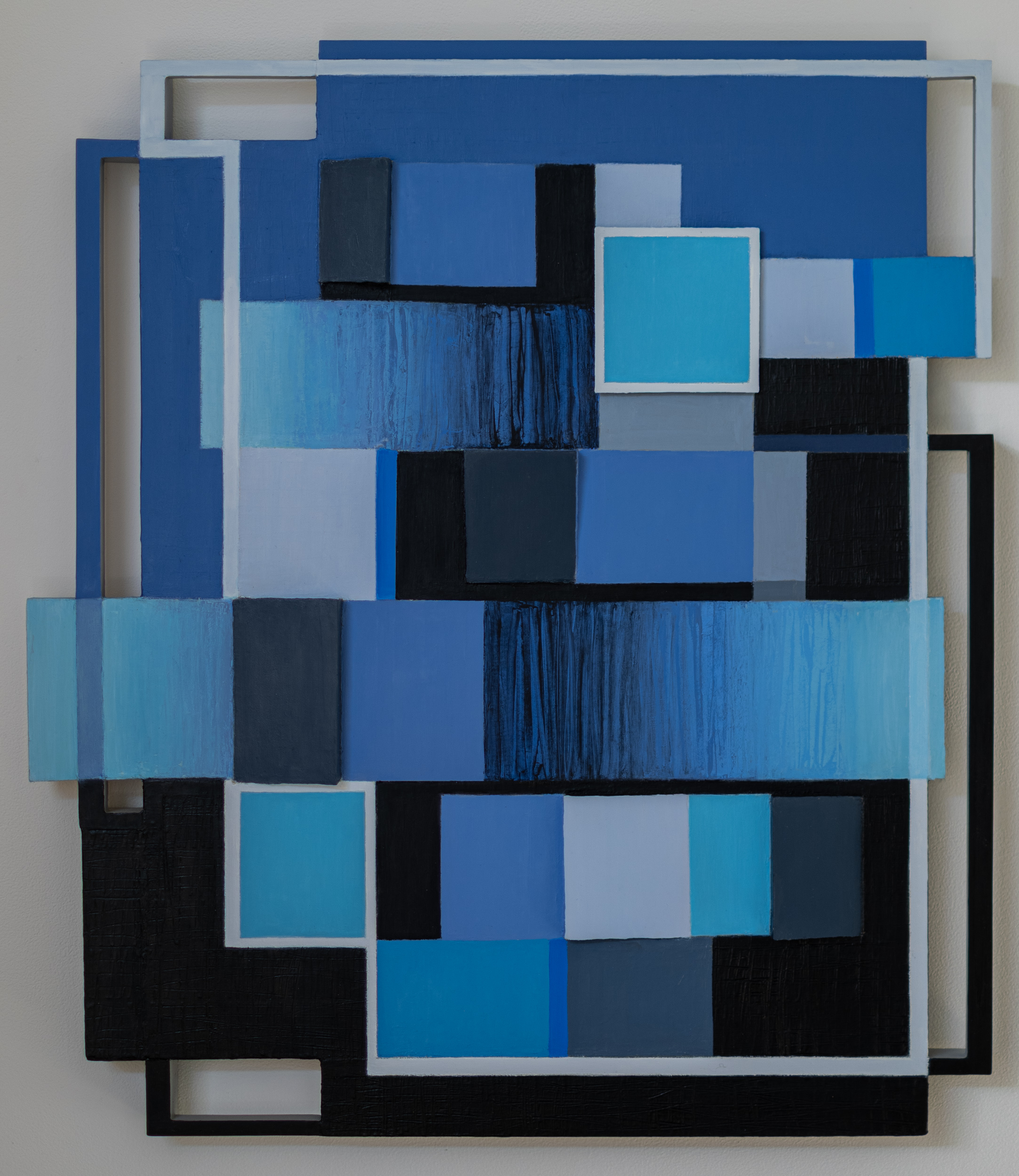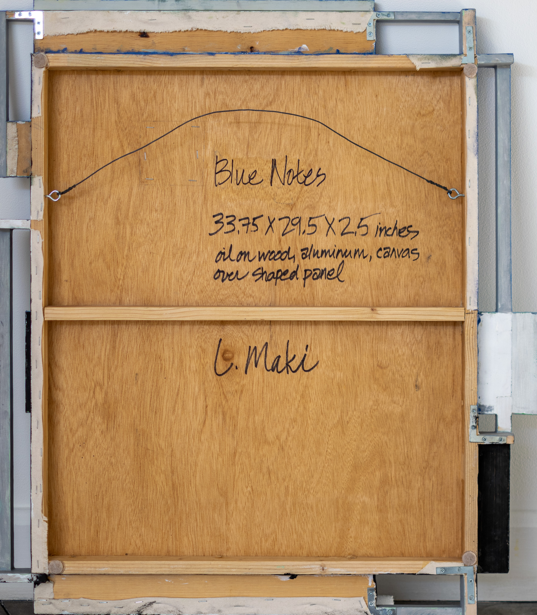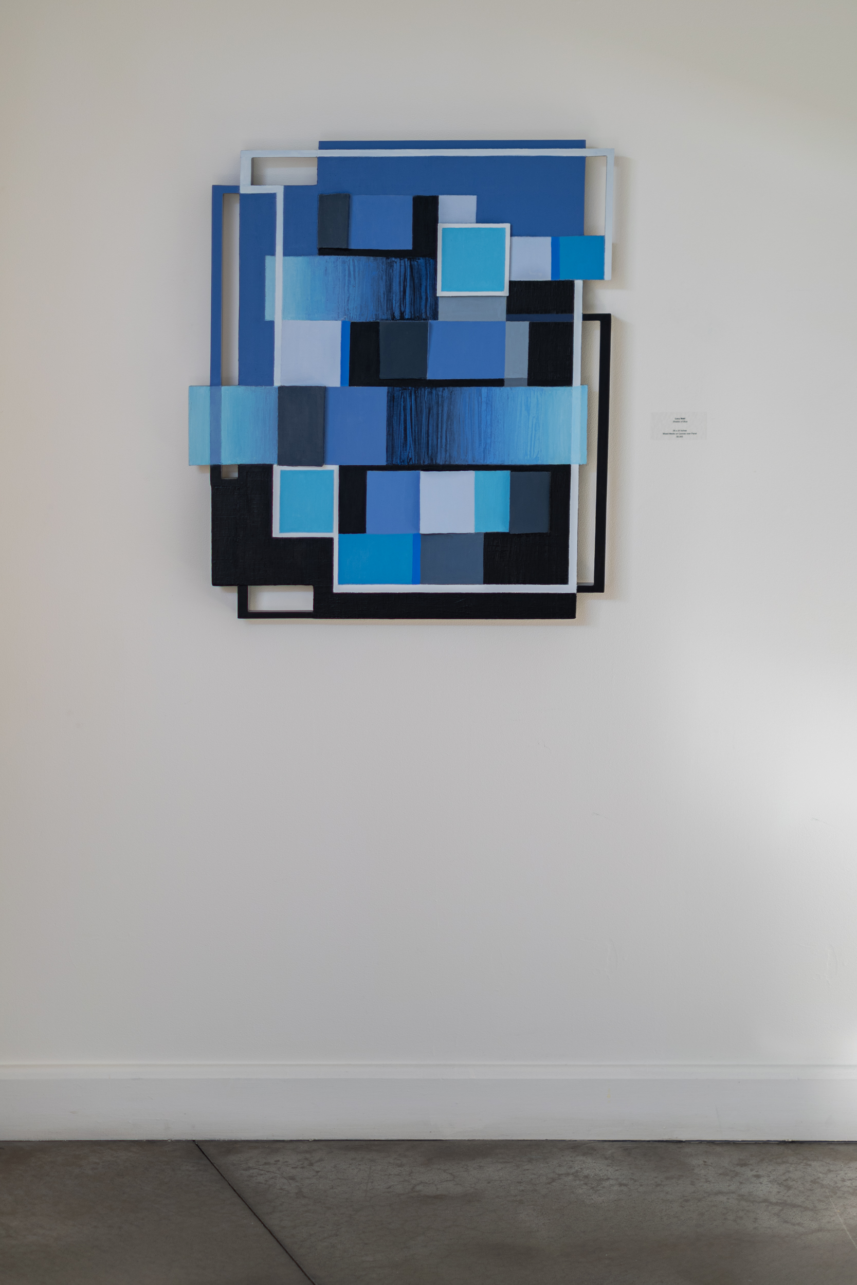 This contemporary abstract mixed media composition consists of predominantly blue geometric shapes.Lucy Maki’s masterful paintings have evolved over decades to embrace a variety of techniques and mediums. Her exploration of shaped paintings, like this one, are experiments in how space, form and colour can be transformed when a painted canvas is stretched over shaped wood panels, extending the picture frame. Blue Notes is composed of oil paint on aluminum, wood and canvas. Geometric shapes—derivatives of squares appear in layers—in an arresting mix of blues, black framed in white and aluminum. Thoroughly modern.